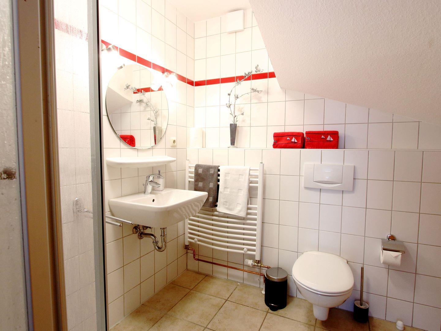 Das Bad hat eine Dusche sowie eine Waschmaschine.