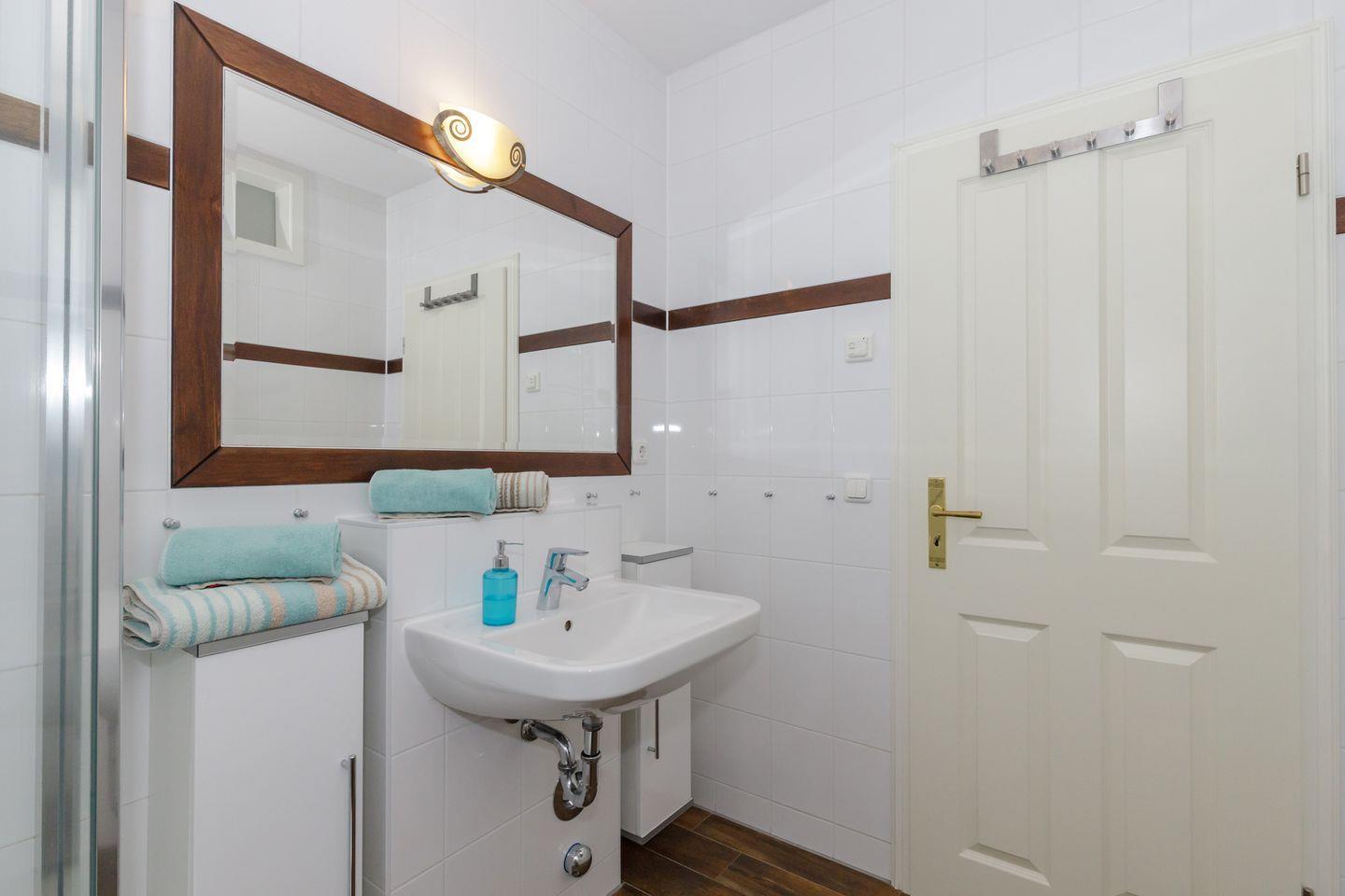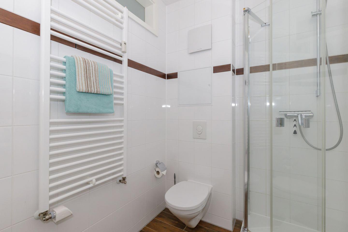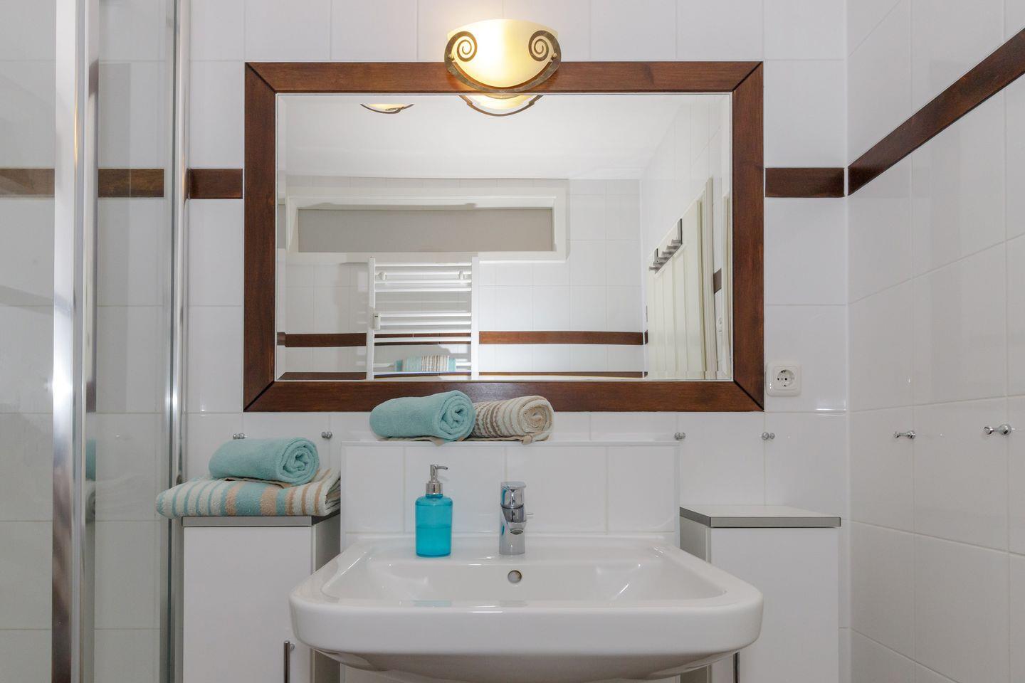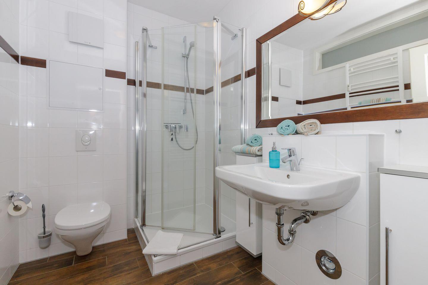 Das elegante Bad ist mit einer großen, bodengleichen Dusche und Fußbodenheizung ausgestattet. Bettwäsche und Handtücher sind im Mietpreis enthalten. Reisekinderbett und Hochstuhl können auf Wunsch gebucht werden. Die Fenster werden durch Insektenschutzelemente geschützt.