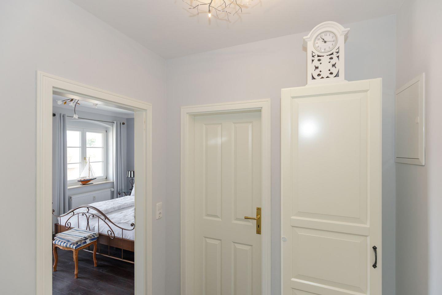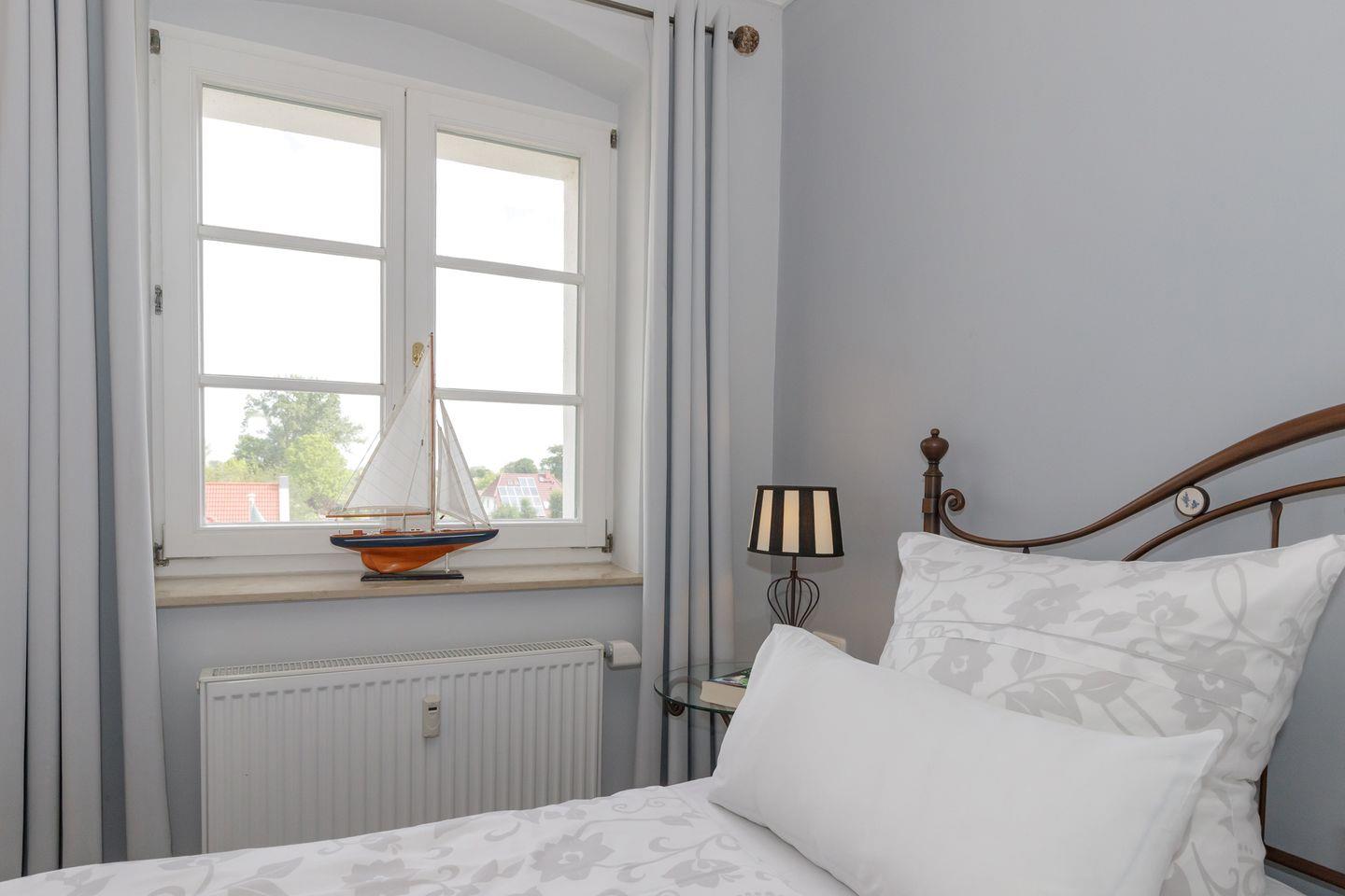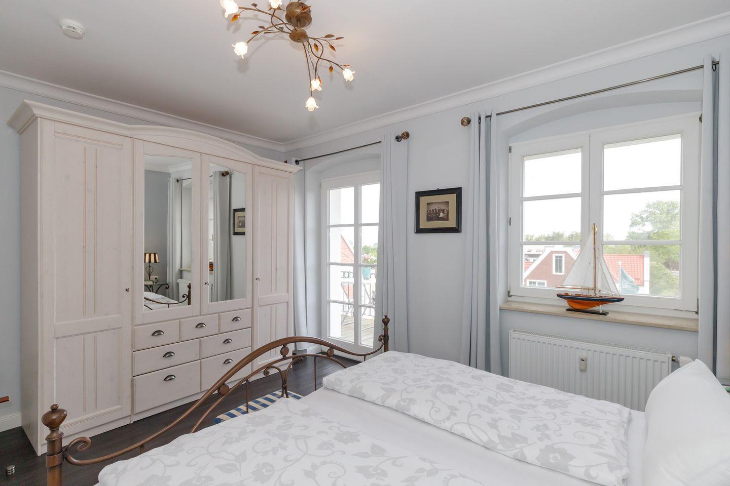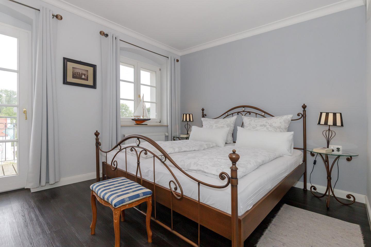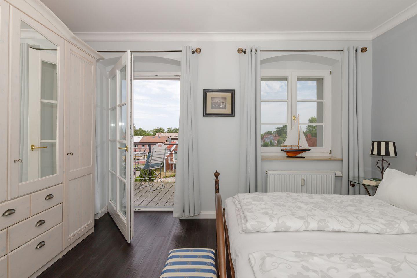 Auch aus dem großzügigen Schlafzimmer mit Doppelbett bietet sich nach erholsamem Schlaf der direkte Blick auf die Ostsee. Von beiden Räumen gibt es einen direkten Zugang auf den Balkon.