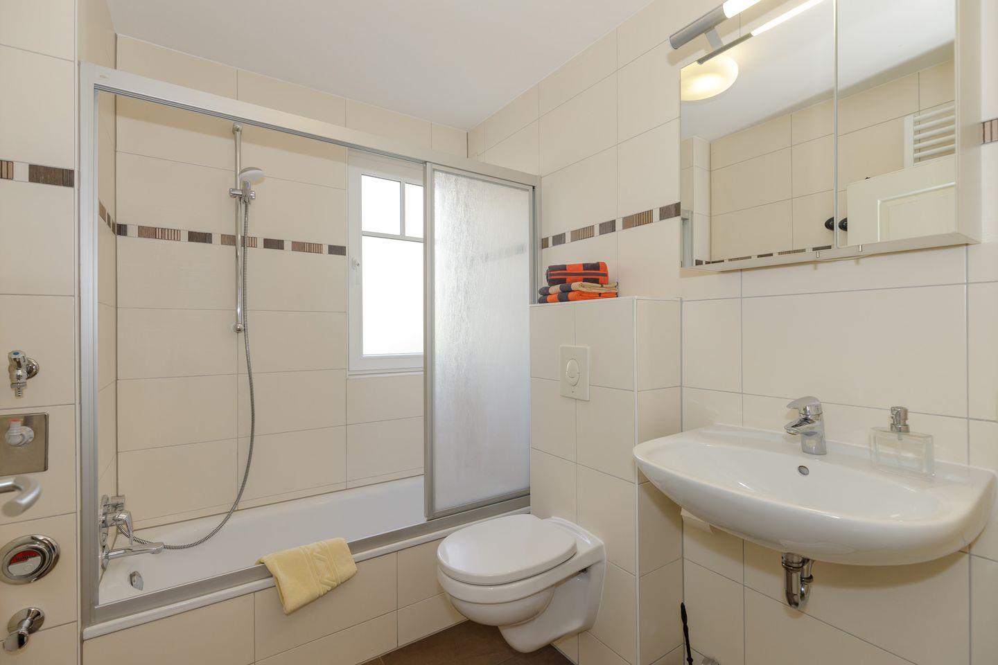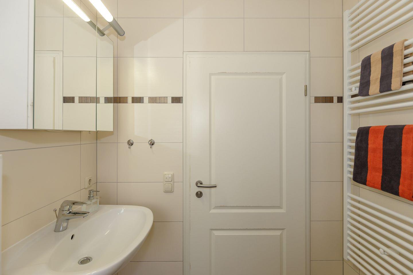 Das Badezimmer verfügt über eine Badewanne mit Duschmöglichkeit, Waschbecken, Spiegel, Haartrockner und Fenster sowie warmes Wasser. Für Familien steht ein Wäscheständer bereit, außerdem befinden sich Bügeleisen, Bügelbrett und Staubsauger in der Wohnung.