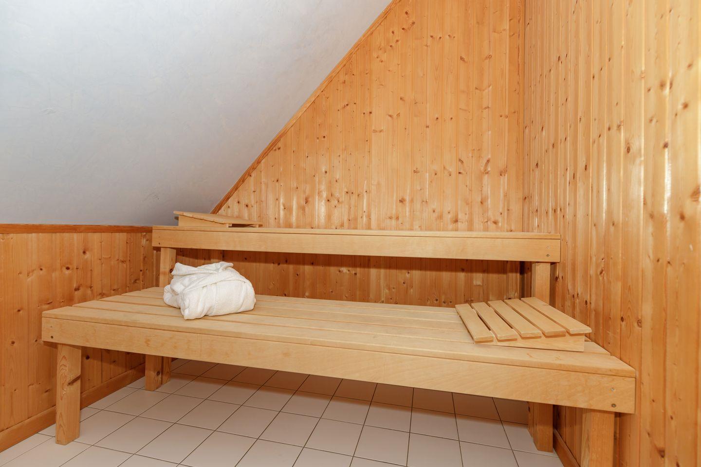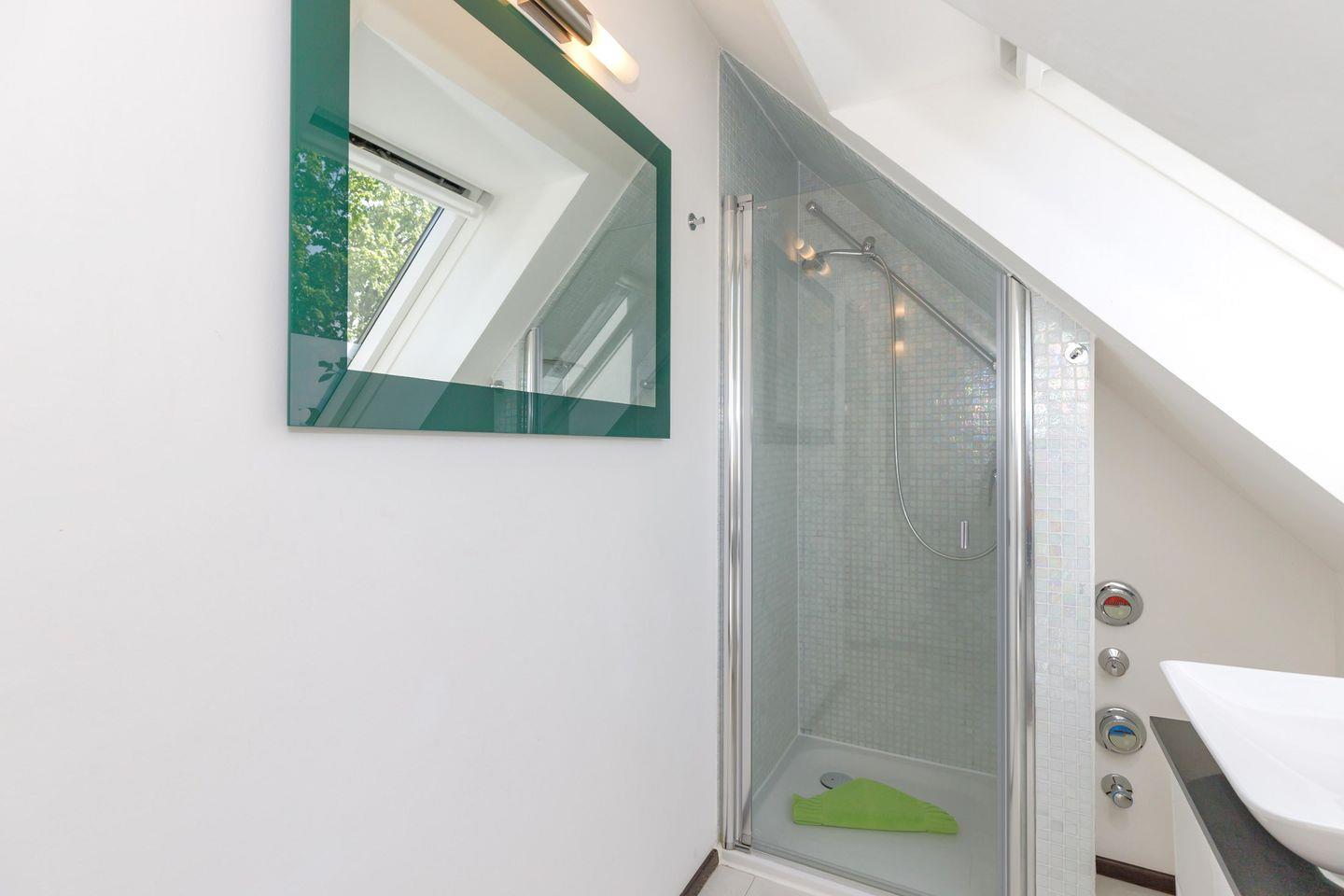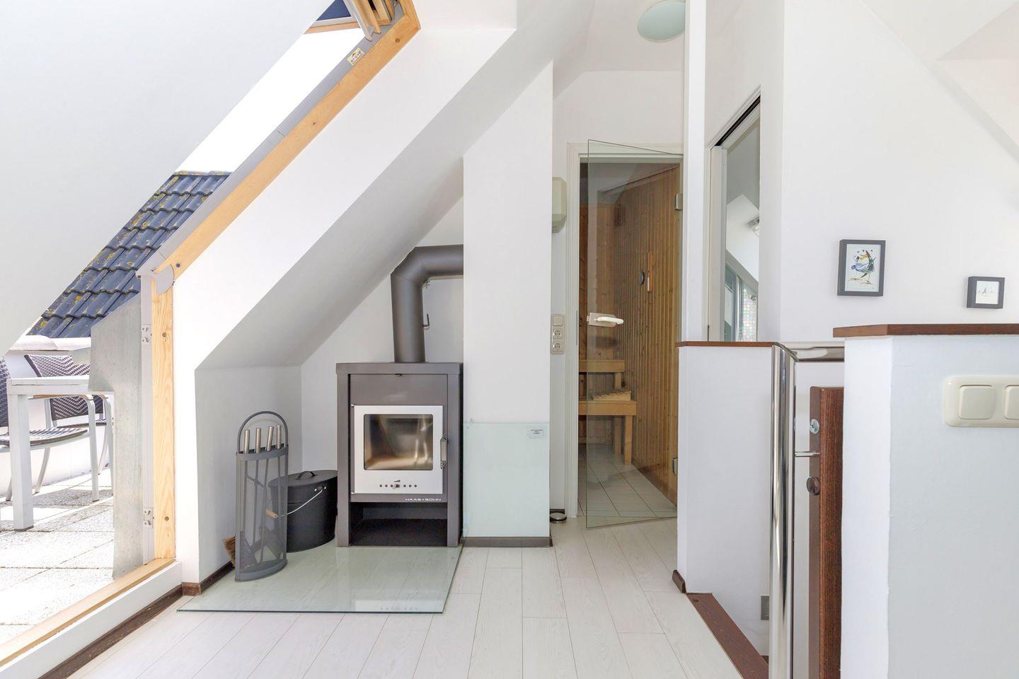 Im oberen Bereich der Wohnung können Sie die Sauna nutzen und nach dem Saunagang herrlich mit Kaminfeuer relaxen. Sie haben hier außerdem einen 2. sichtgeschützten, kleinen Balkon und ein Duschbad mit WC zur Verfügung.