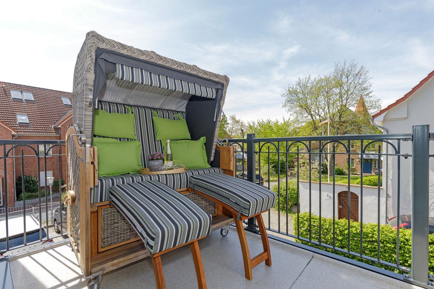 Vom hellen lichtdurchfluteten Wohnbereich mit gemütlicher Leder-Sitzecke, Relaxsessel und Massivholzmöbeln gelangen Sie auf den Süd/West-Balkon mit einem gemütlichen Strandkorb und einem Lounchsofa für einen entspannten Tagesausklang.