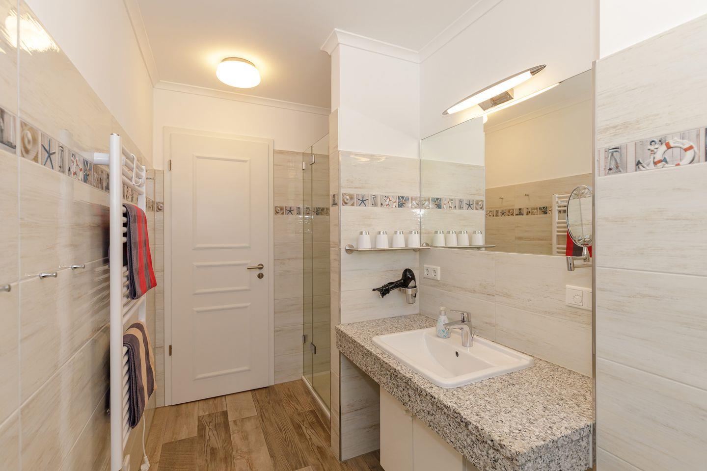Das sehr geräumige Bad hat eine bodengleiche Dusche.