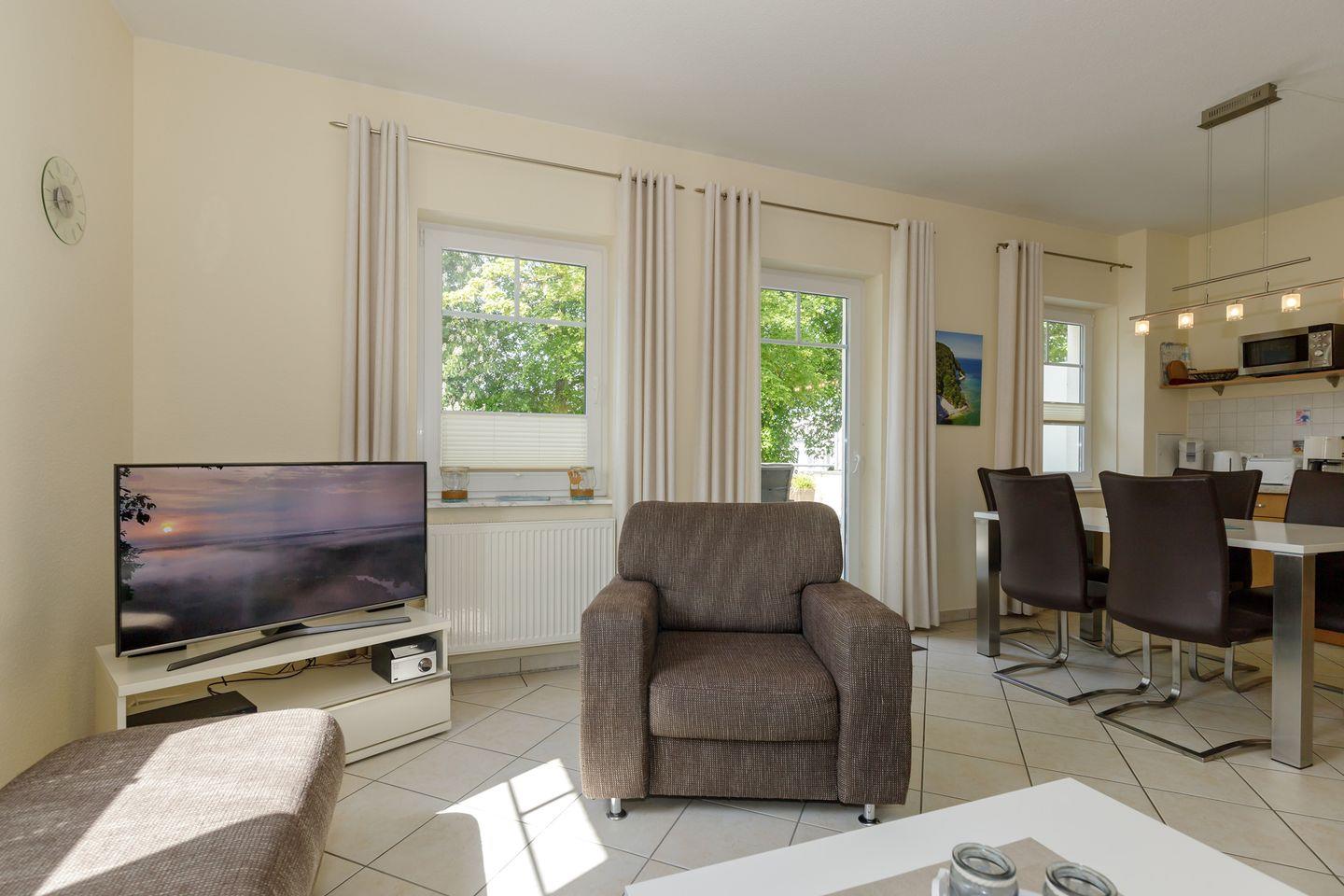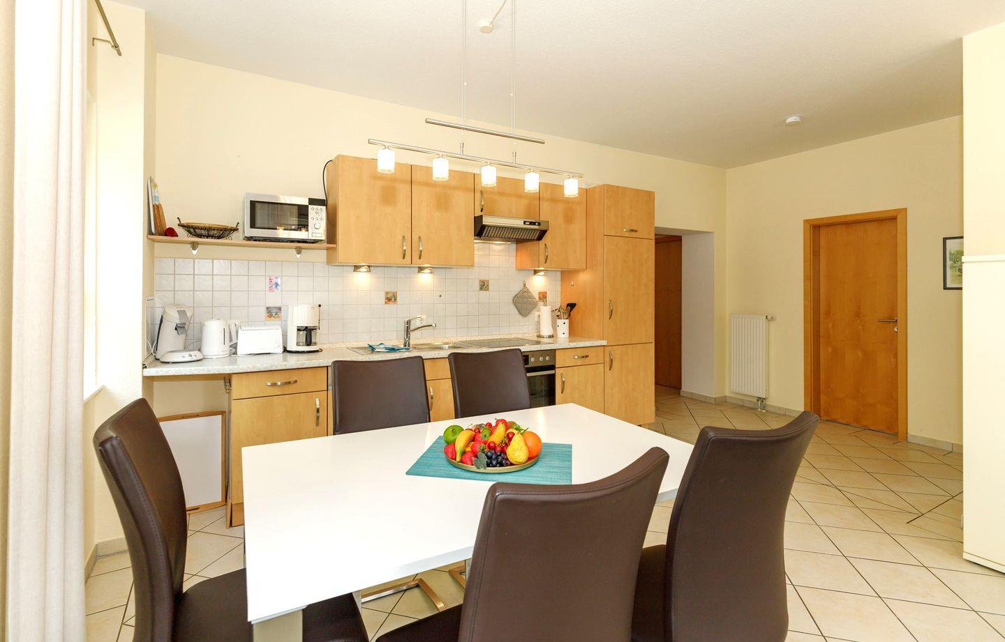 Im hellen und großzügigen Wohn-Essbereich mit Flach-TV, Radio und DVD befinden sich eine sehr bequeme Couchgarnitur und der Esstisch. Von hier aus gelangen Sie auf den großen Balkon. Die offene Küche ist mit allem technischen Komfort ausgestattet, auch eine Senseo-Kaffeepad-Maschine ist vorhanden.