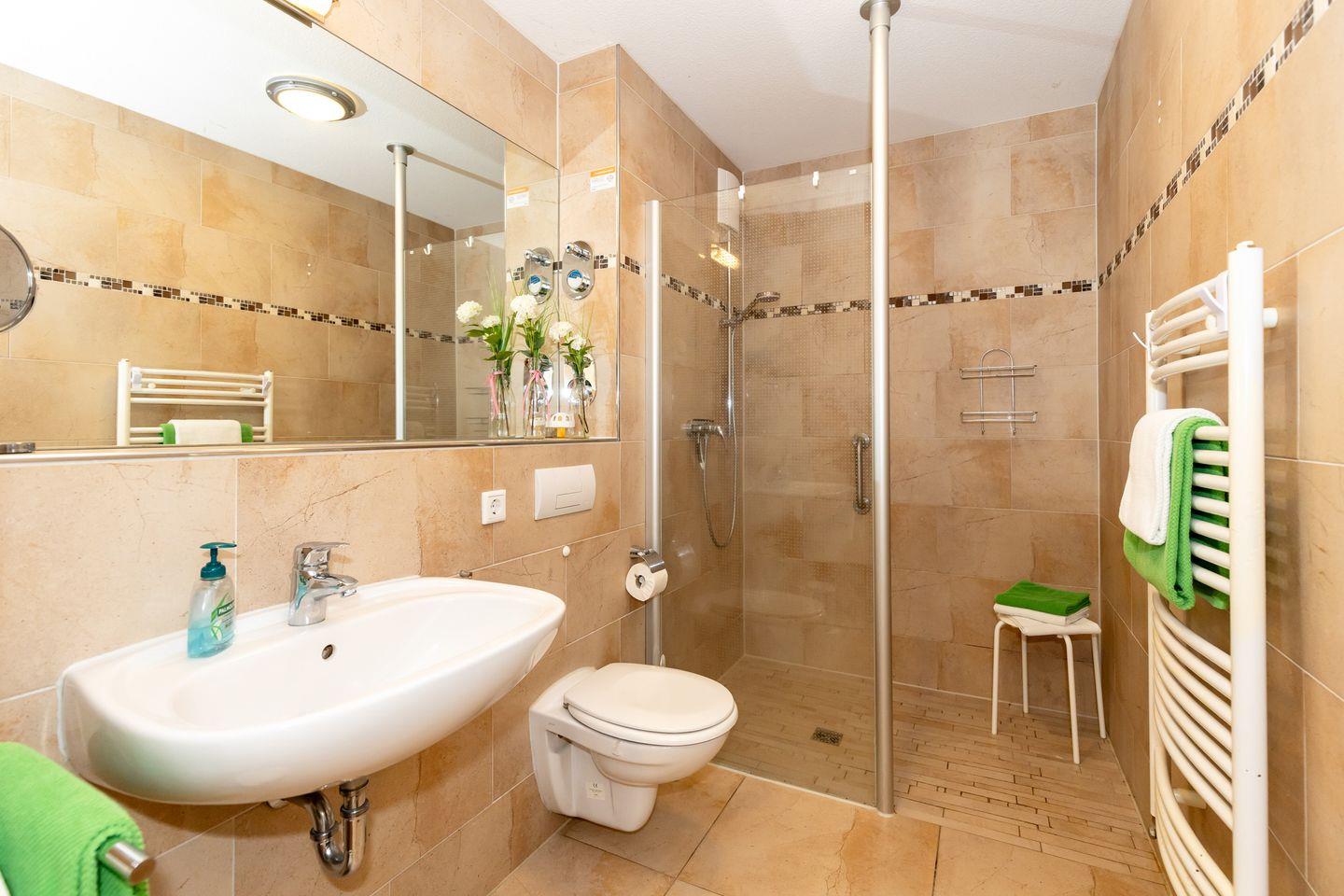 Das schicke Bad hat eine bodengleiche, geräumige Dusche.