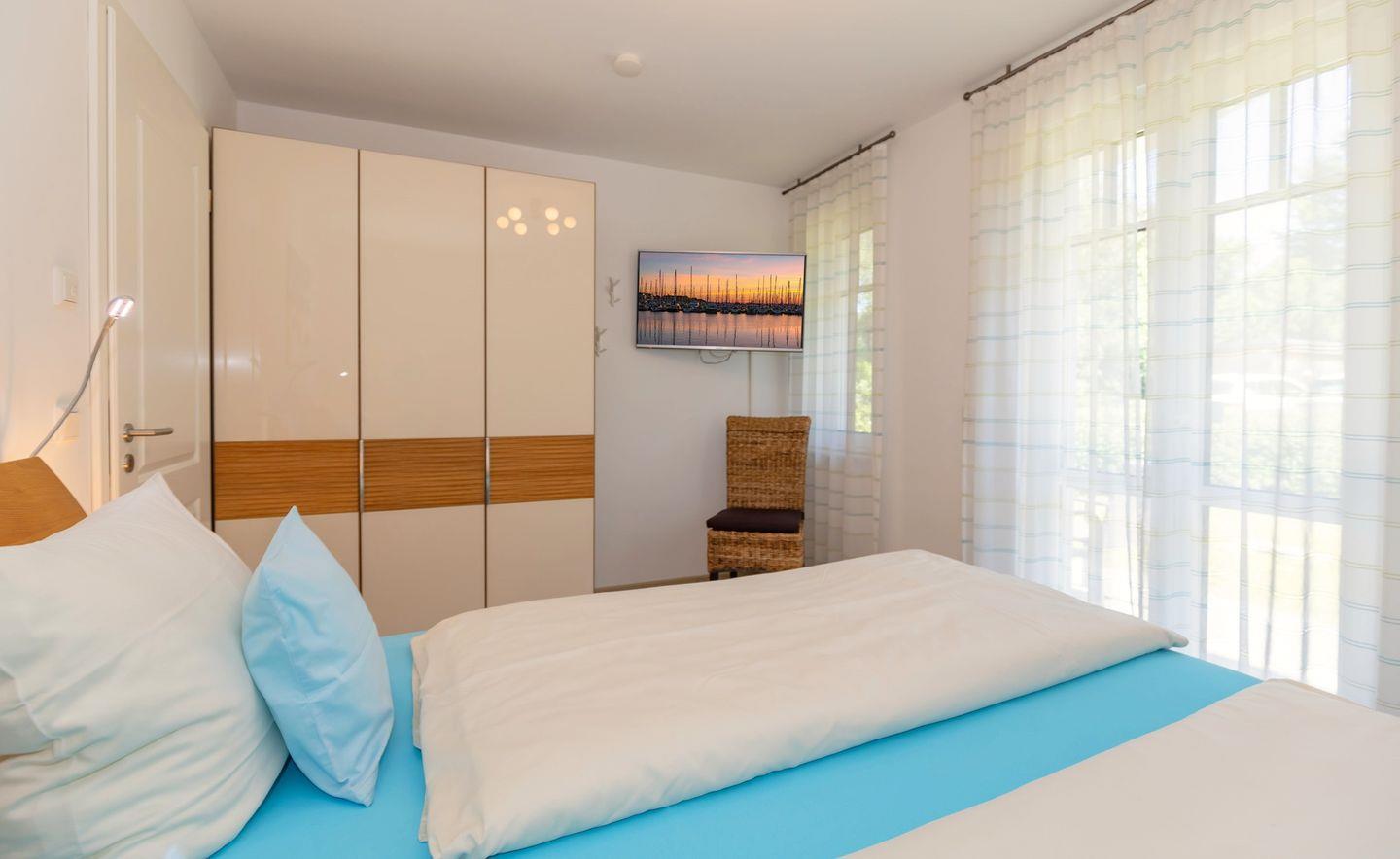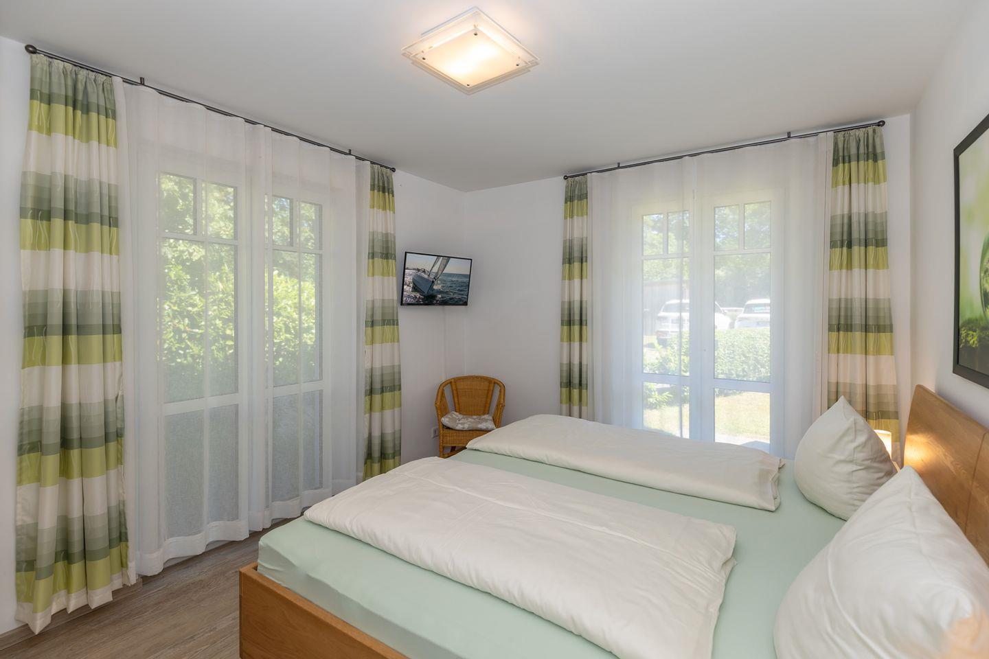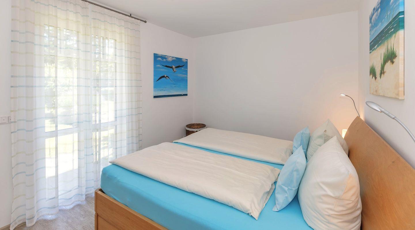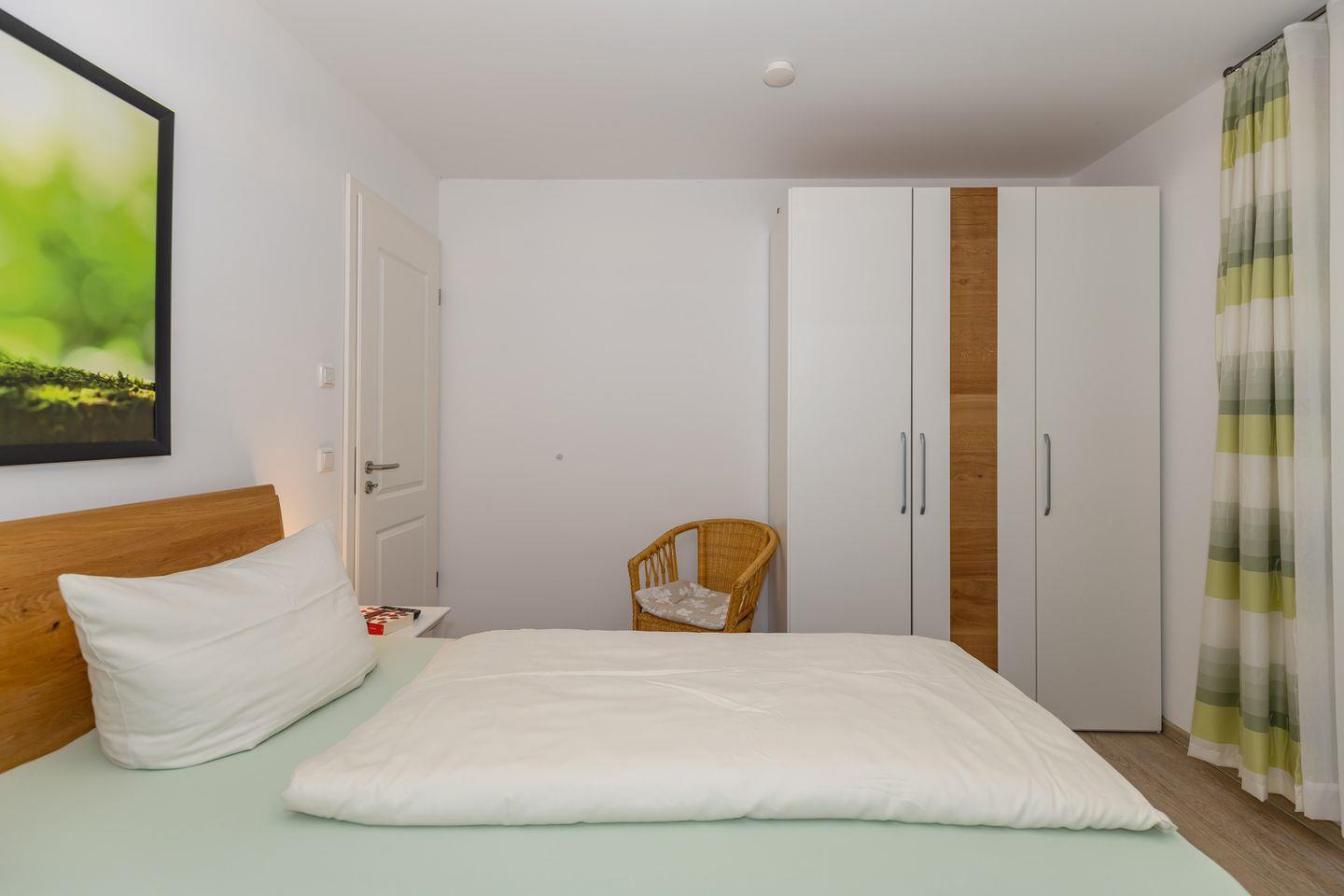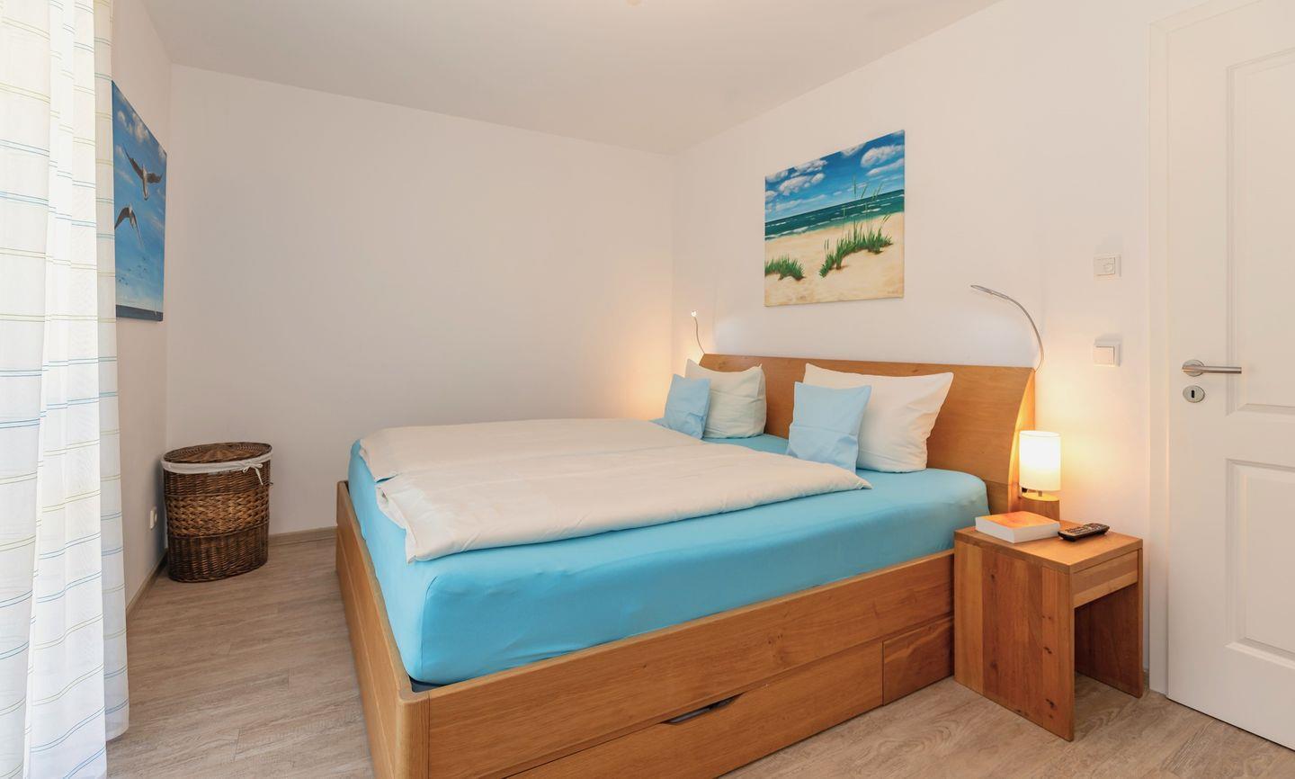 Die Doppelbetten in den beiden großen Schlafzimmern haben Komforthöhe und sind mit 2m x 2m und Decken von 155cm x 220cm sehr komfortabel und angenehm.