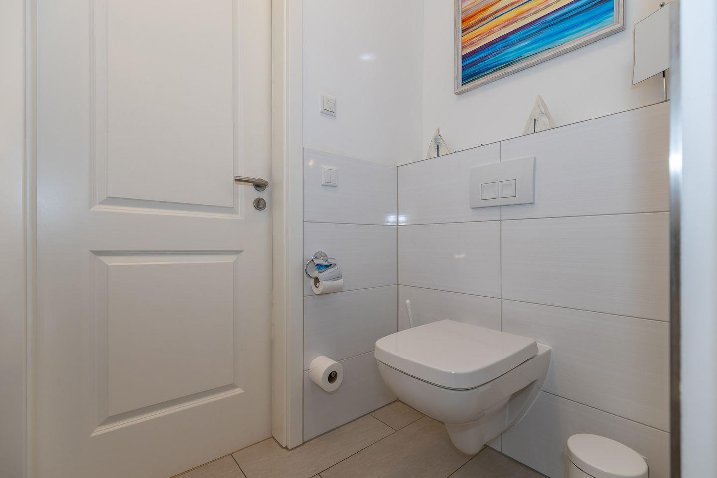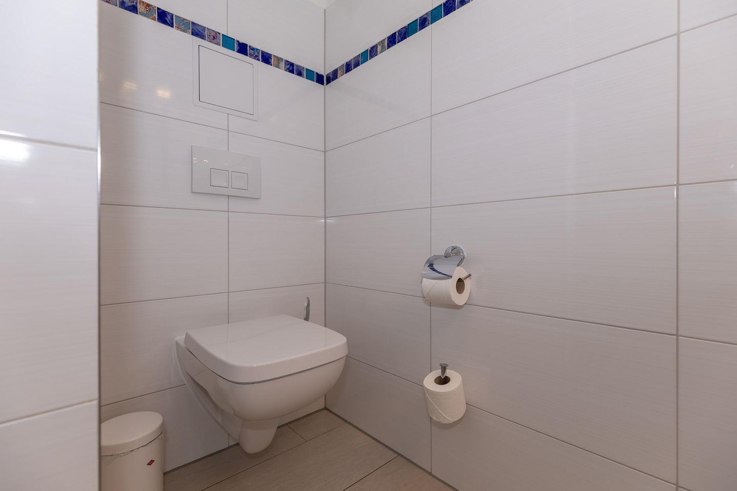 Im Bad gibt es eine geräumige bodengleiche Dusche, zusätzlich eine Gästetoilette.