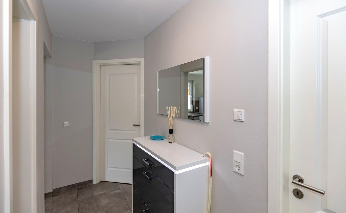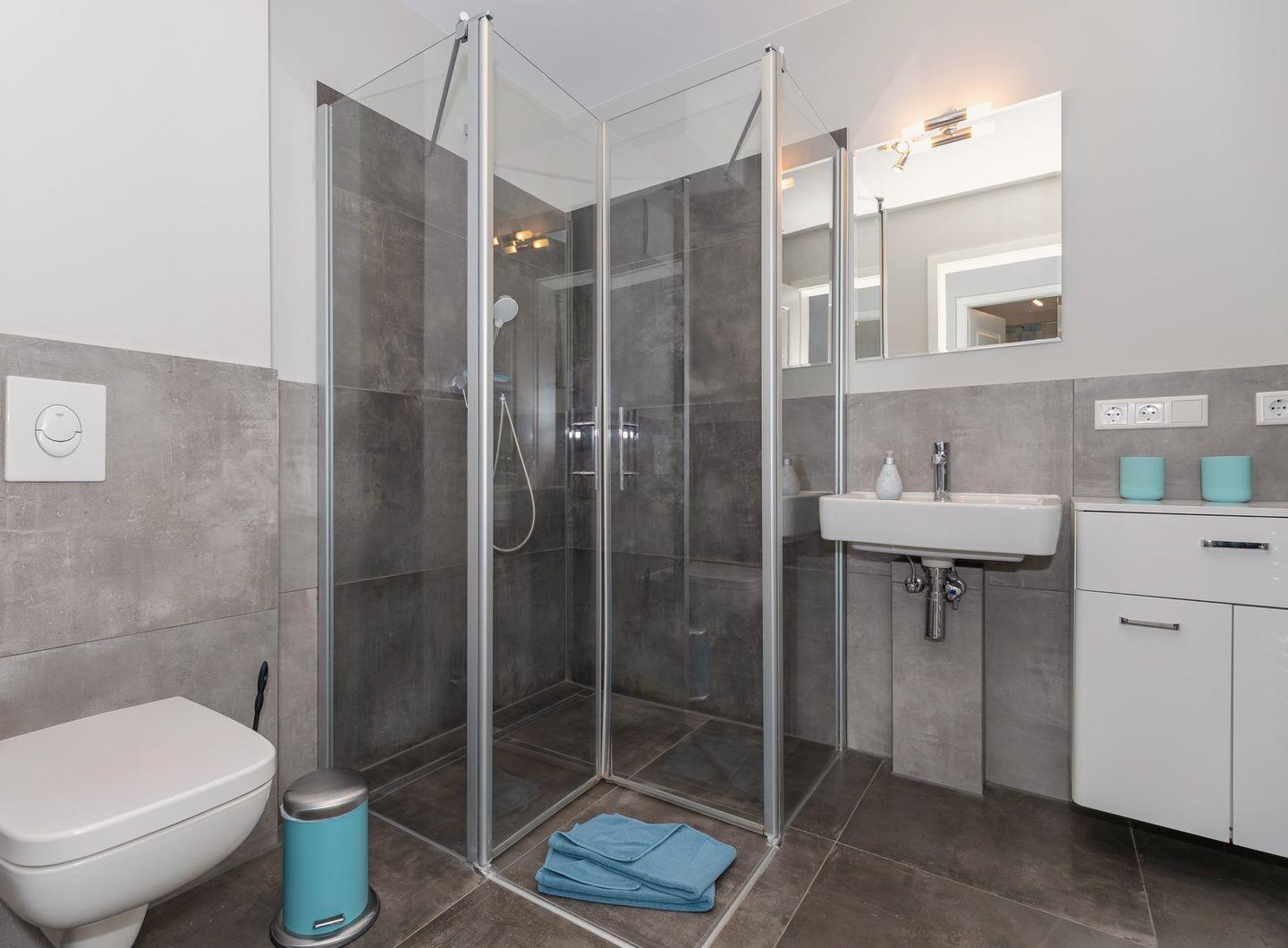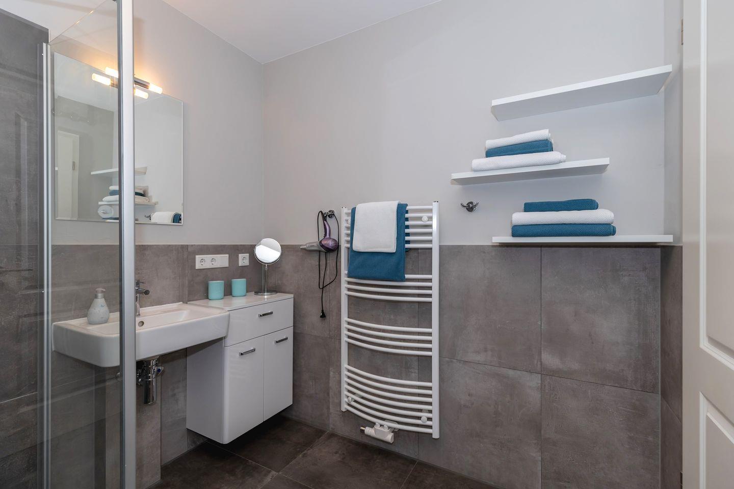 Das Badezimmer: Bodengleiche Dusche, WC, Waschbecken, Spiegel und Haartrockner – stilvoll, praktisch und immer bereit für den Alltag.