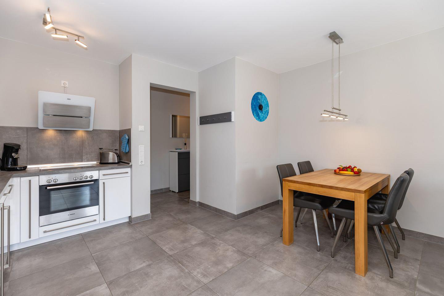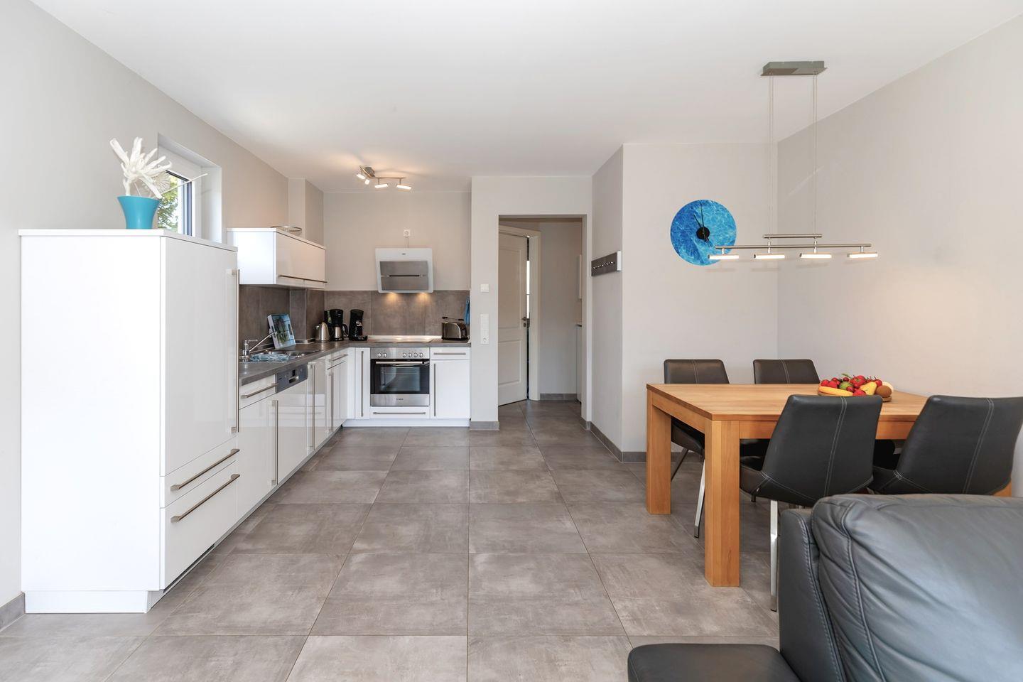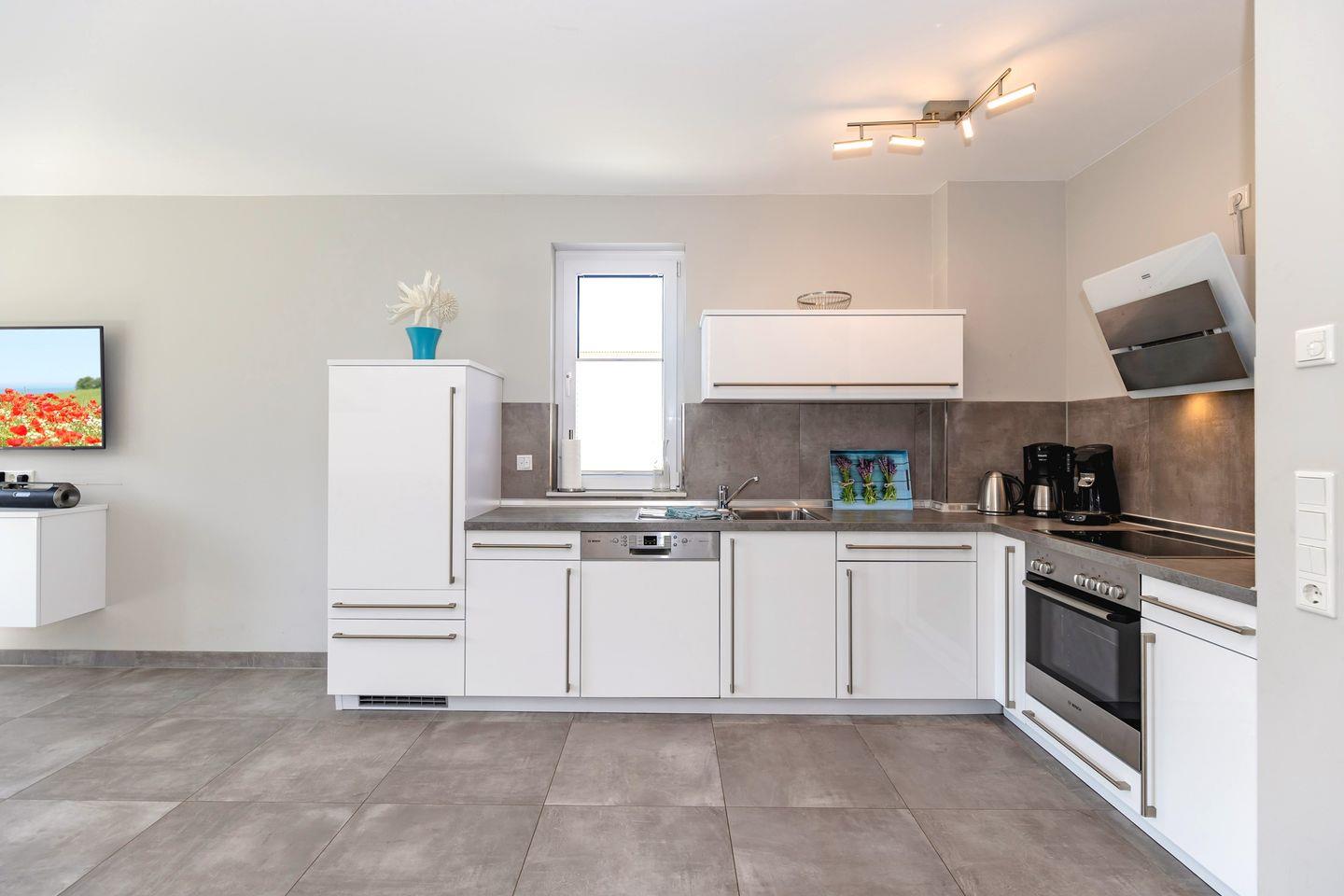Die offene Küche: Vollständig eingerichtet mit Herd, Backofen, Kühlschrank mit Gefrierfach, Spülmaschine und allem, was das Kocherherz begehrt. Für den perfekten Start in den Tag stehen Kaffeemaschine, Wasserkocher, Toaster und eine Senseo-Espressmaschine bereit. Eine Erstausstattung ist inklusive..
