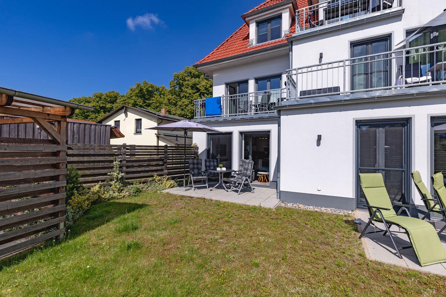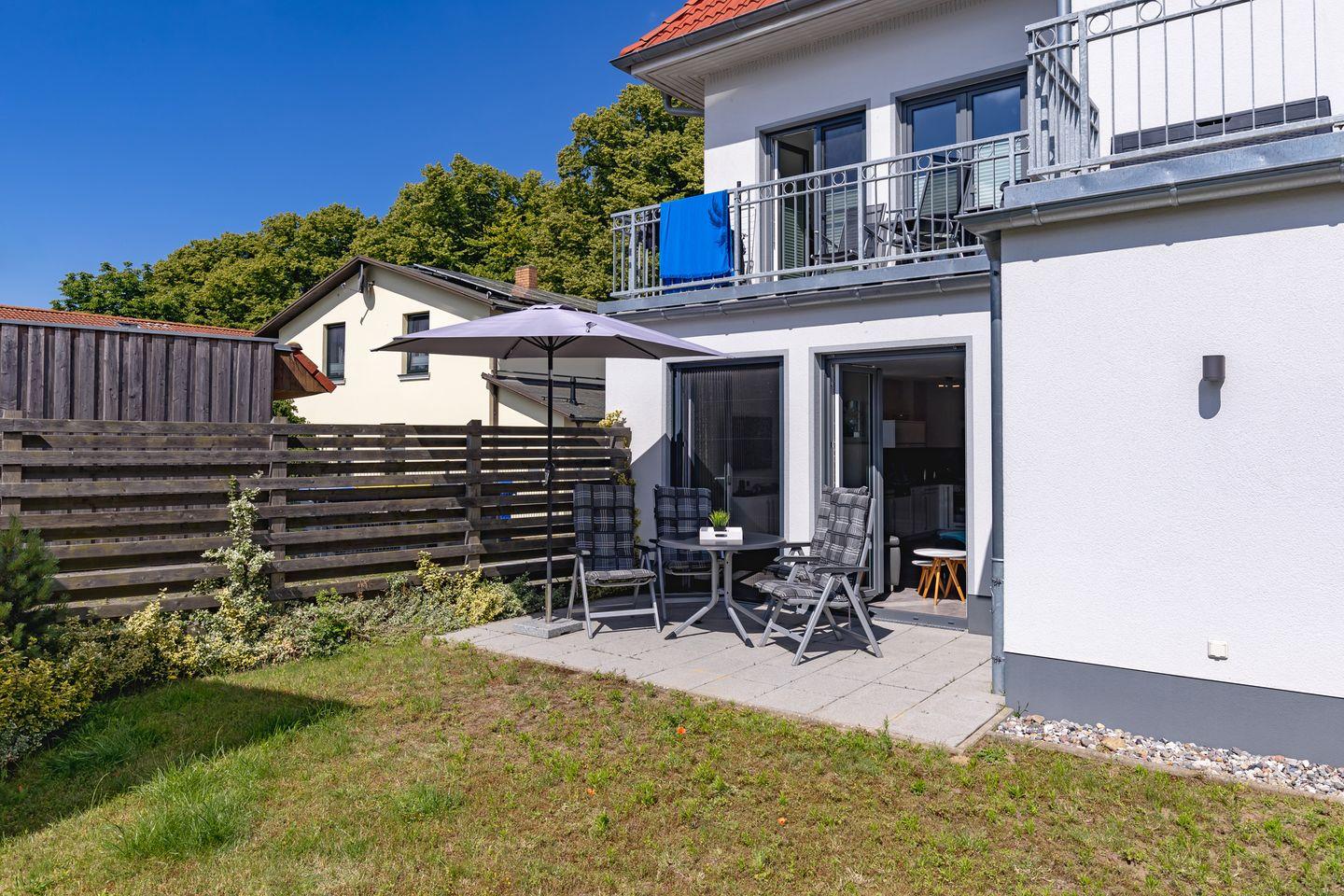 Im Außenbereich erwartet Sie: eine einladende Terrasse mit Gartenmöbeln und Sonnenschirm. Sie laden dazu ein, den Tag im sanften Ostseewind ausklingen zu lassen.