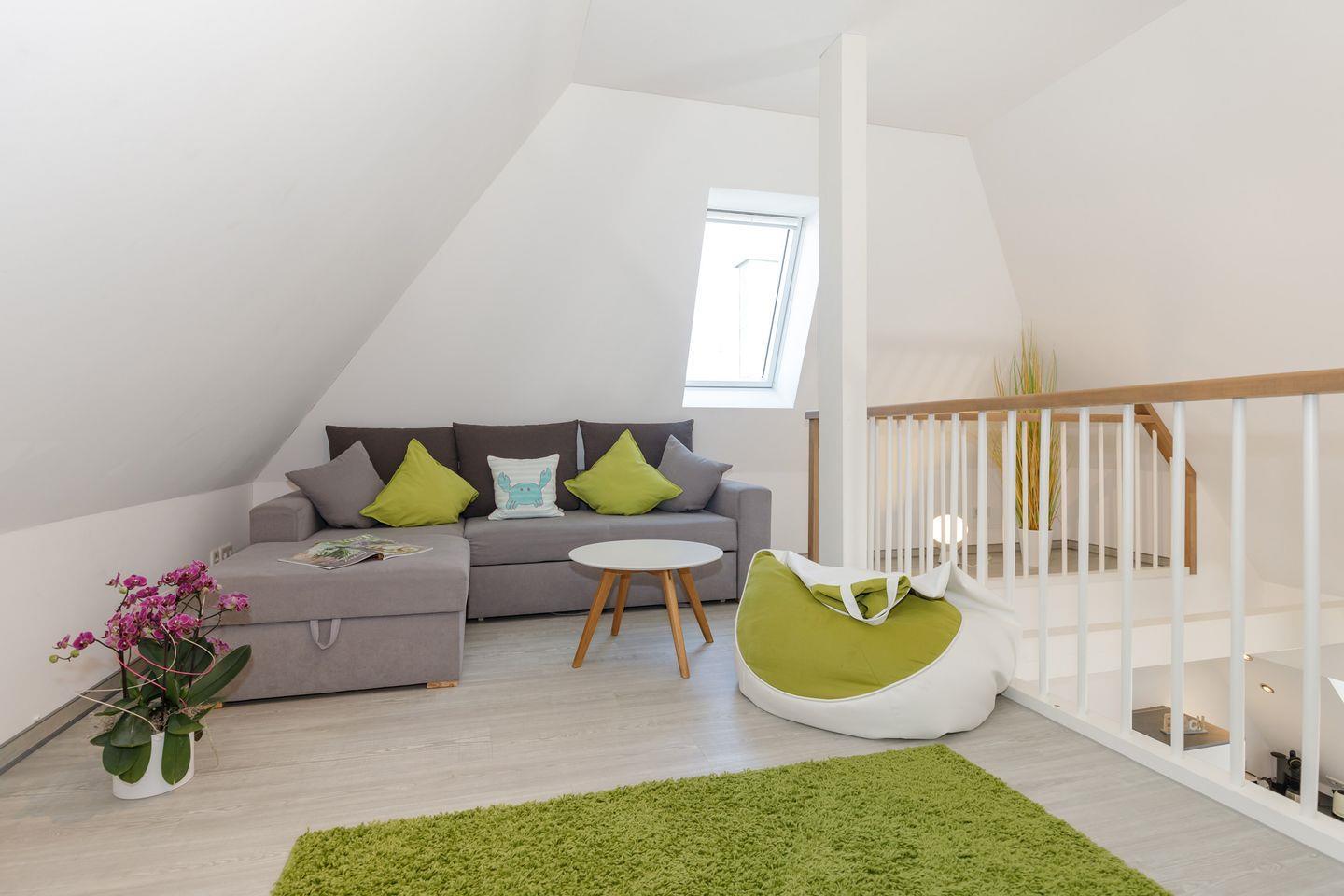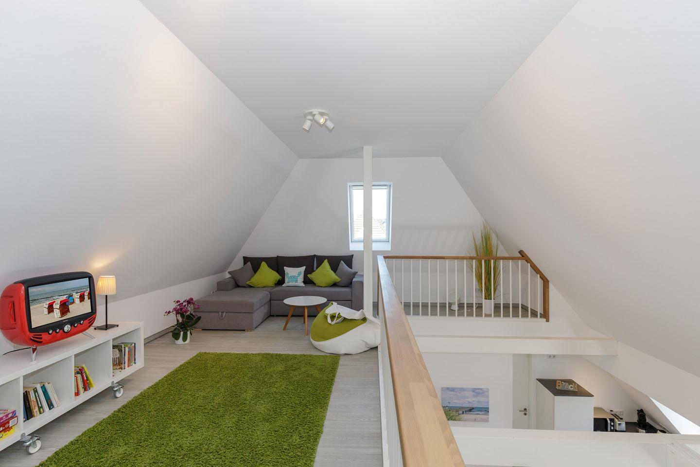 Das moderne Bad mit einer bodengleichen, großen Dusche und einem separaten WC sorgt für zusätzlichen Komfort. Über eine Treppe gelangen Sie nach oben, wo sich der einladende Wohnbereich mit einem ausziehbaren Schlafsofa (130x200) und einem Flach-TV, sowie einem gemütlichen Lesesessel befindet – der perfekte Ort zum Entspannen nach einem Tag am Strand.
