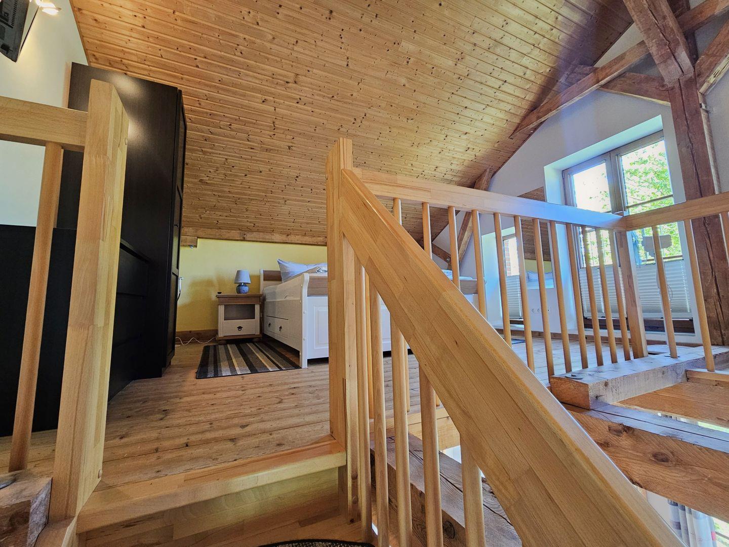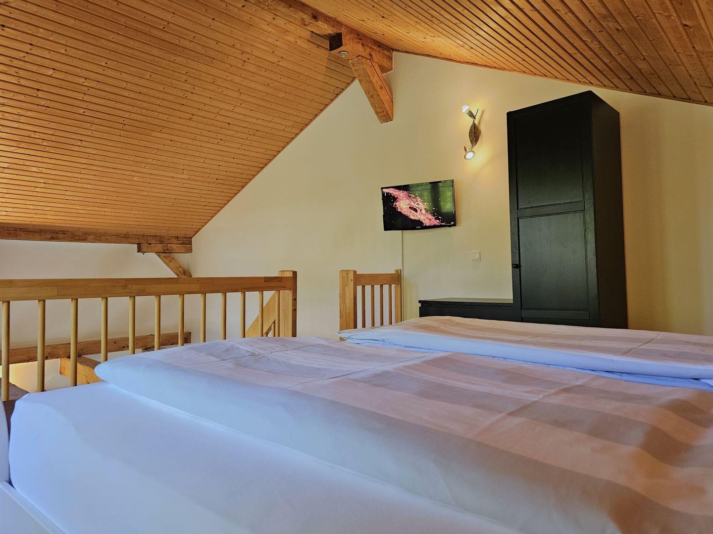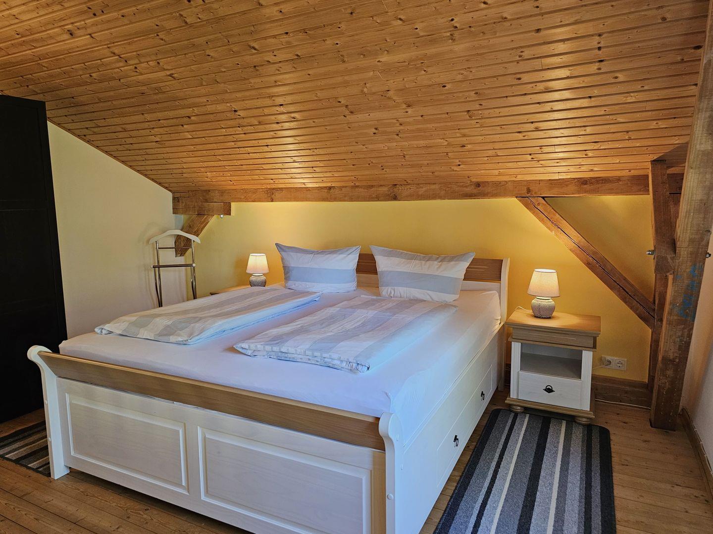 Über eine Holztreppe gelangen Sie nach oben in den gemütlichen Schlafbereich mit großem Bett (180x200), Kleiderschrank, Sideboard und Flachbildfernseher.