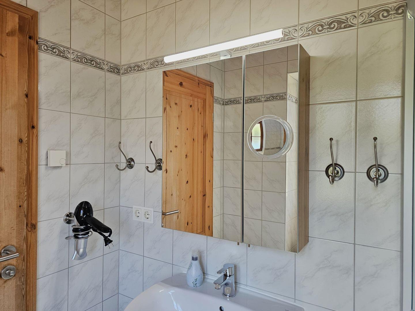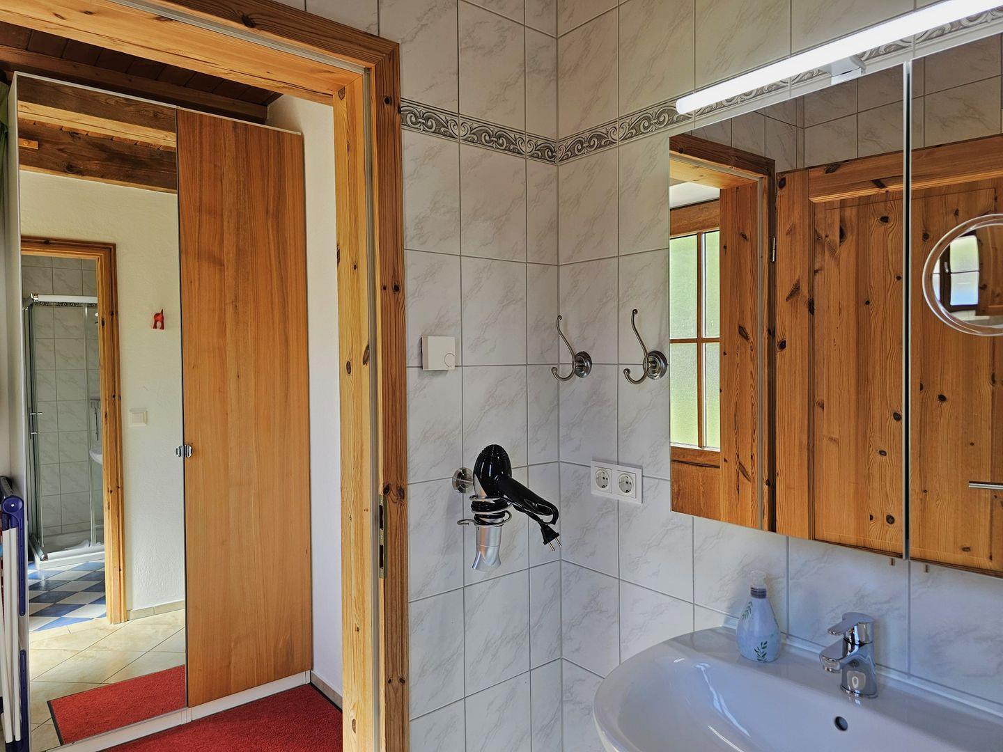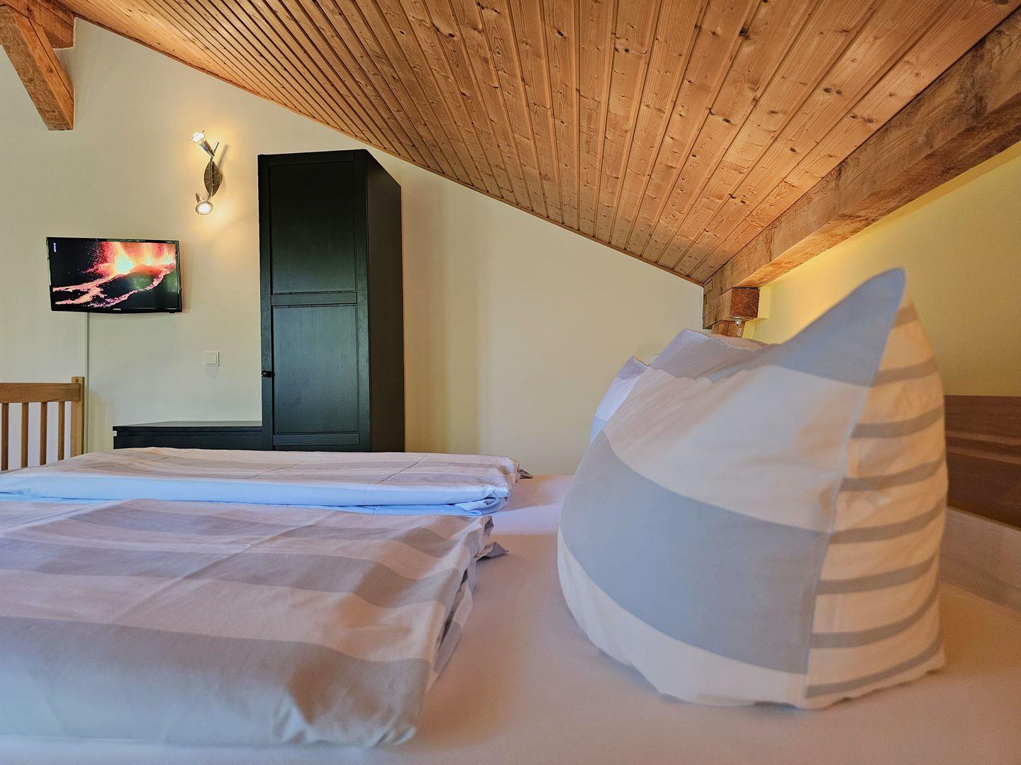 Über eine Holztreppe gelangen Sie nach oben in den gemütlichen Schlafbereich mit großem Bett (180x200), Kleiderschrank, Sideboard und Flachbildfernseher.