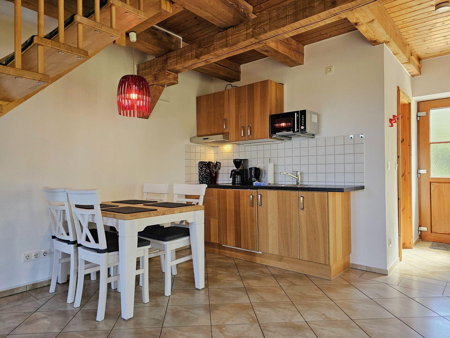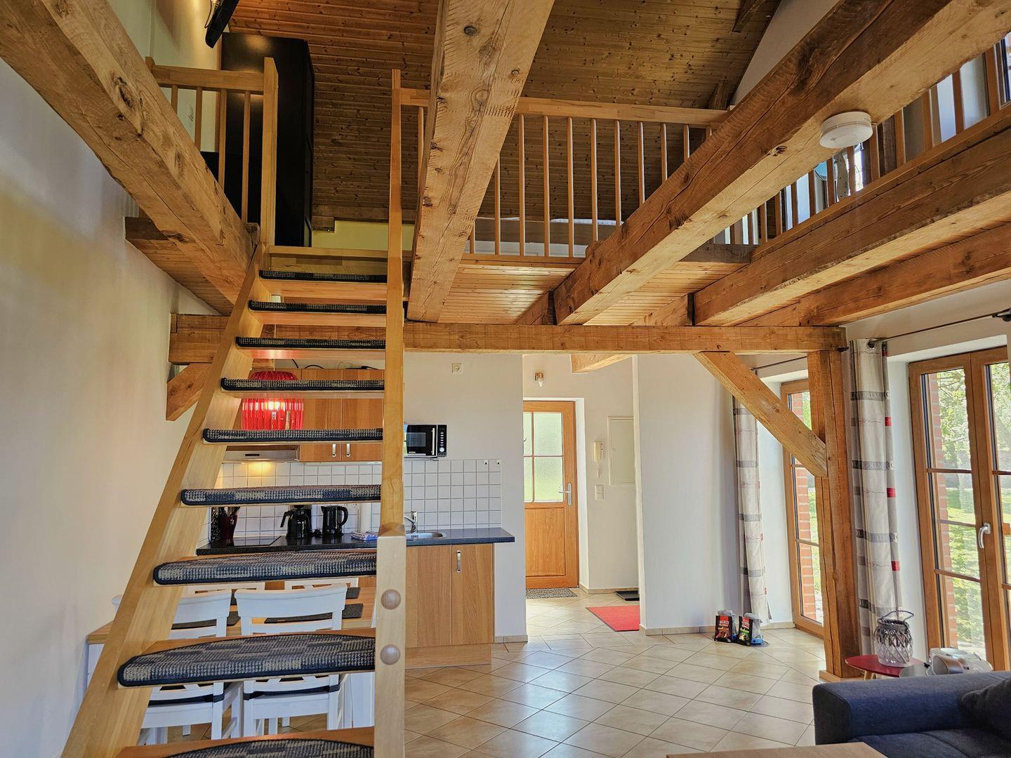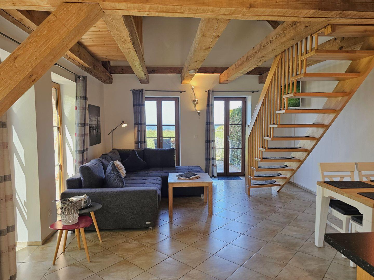 Die offene Balkendecke und die beiden Fensterfronten schaffen ein lichtdurchflutetes Raumerlebnis. Im Erdgeschoss erwartet Sie ein gemütlicher Wohn-Essbereich mit einer großen Eckcouch, die zum Schlafen umfunktioniert werden kann (180x200) und Flachbildfernseher, dazu eine vollausgestattete Küche und ein Bad.