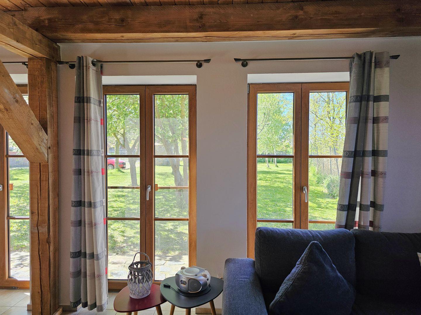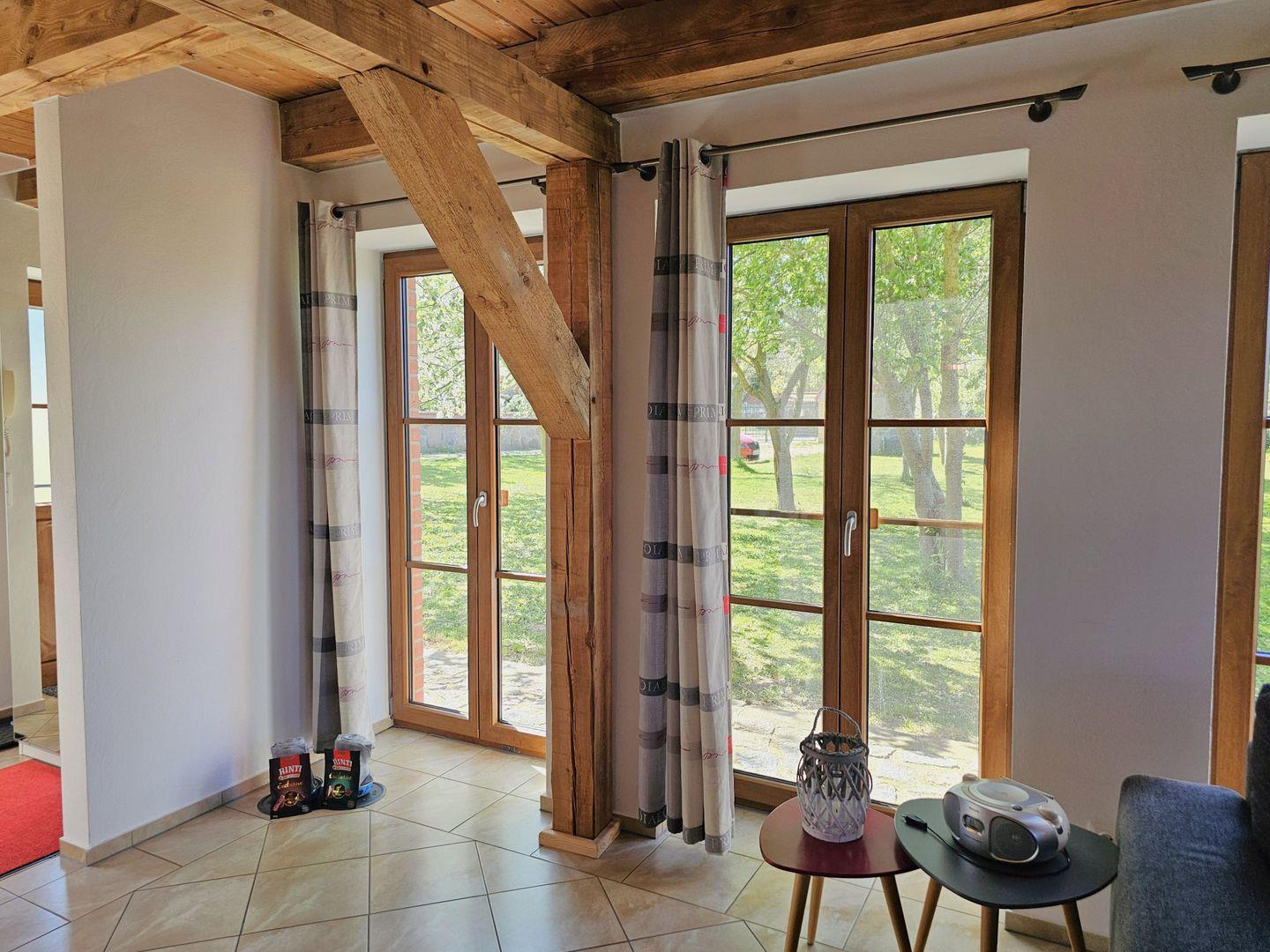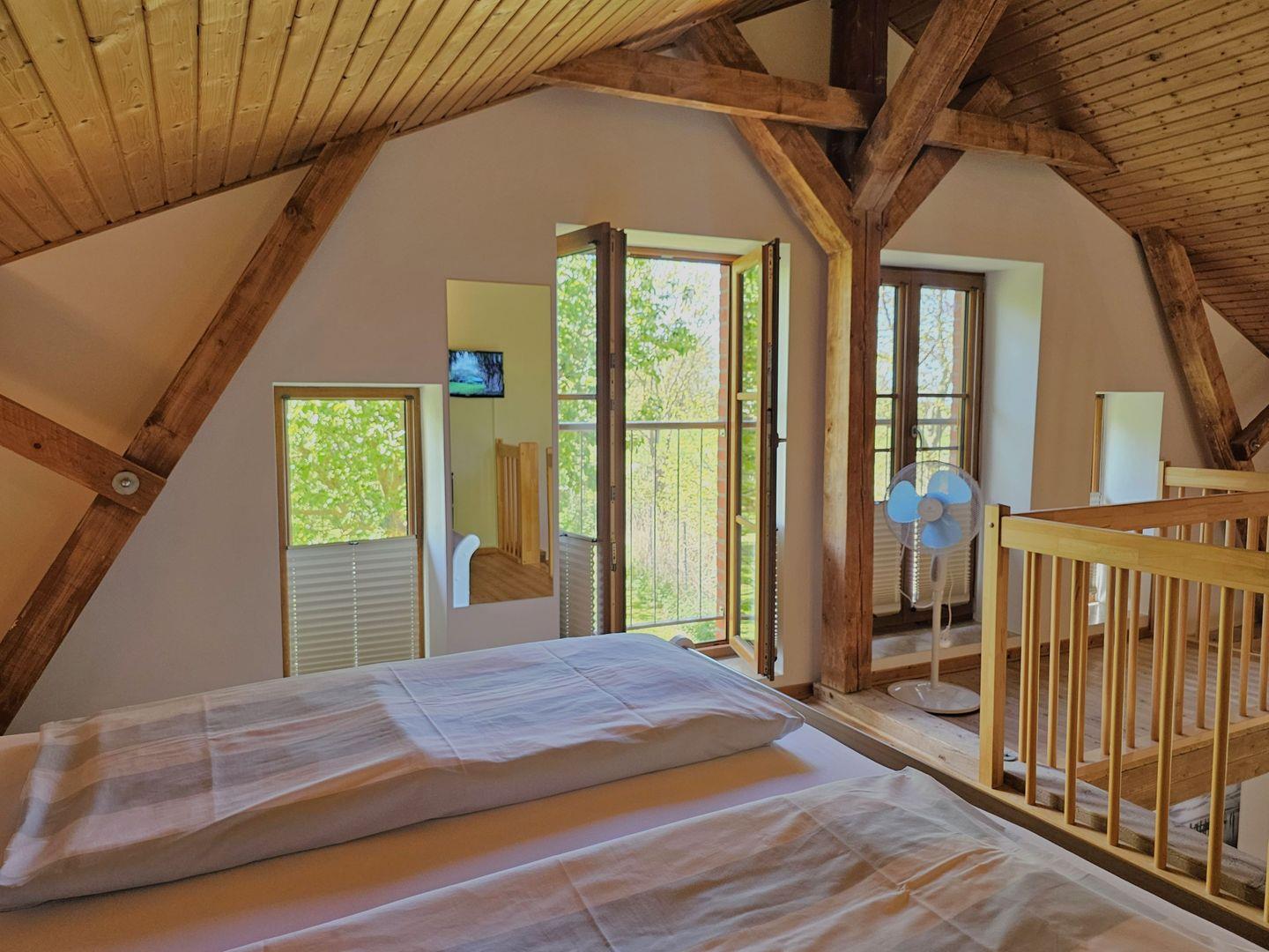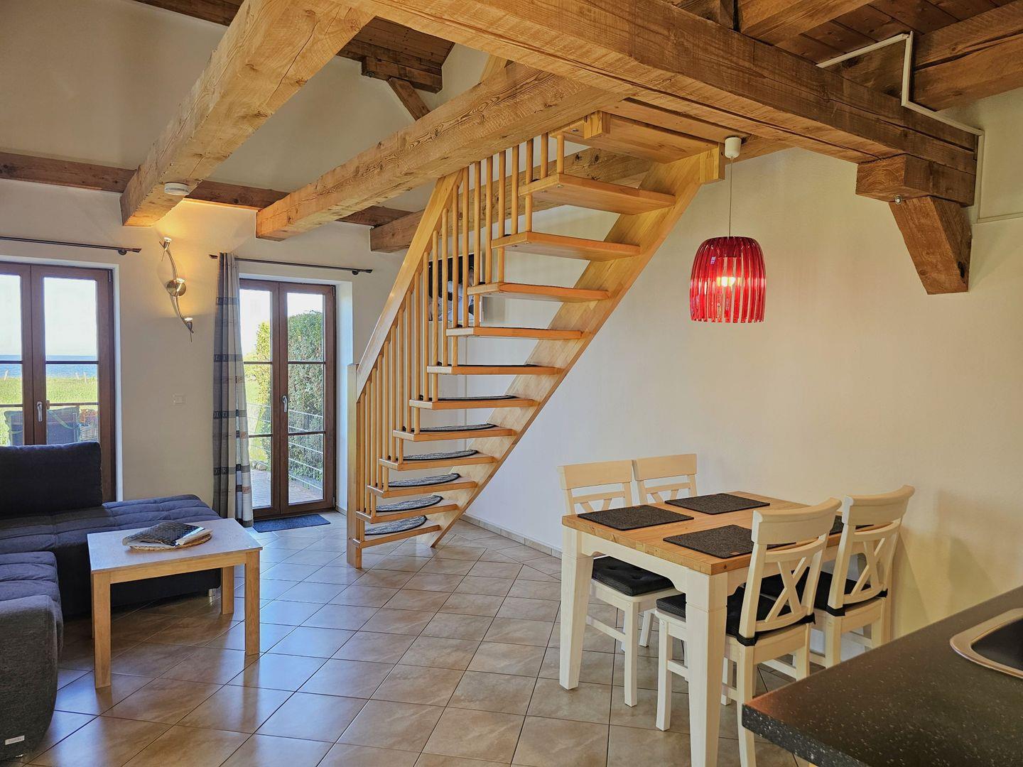 Die offene Balkendecke und die beiden Fensterfronten schaffen ein lichtdurchflutetes Raumerlebnis. Im Erdgeschoss erwartet Sie ein gemütlicher Wohn-Essbereich mit einer großen Eckcouch, die zum Schlafen umfunktioniert werden kann (180x200) und Flachbildfernseher, dazu eine vollausgestattete Küche und ein Bad.