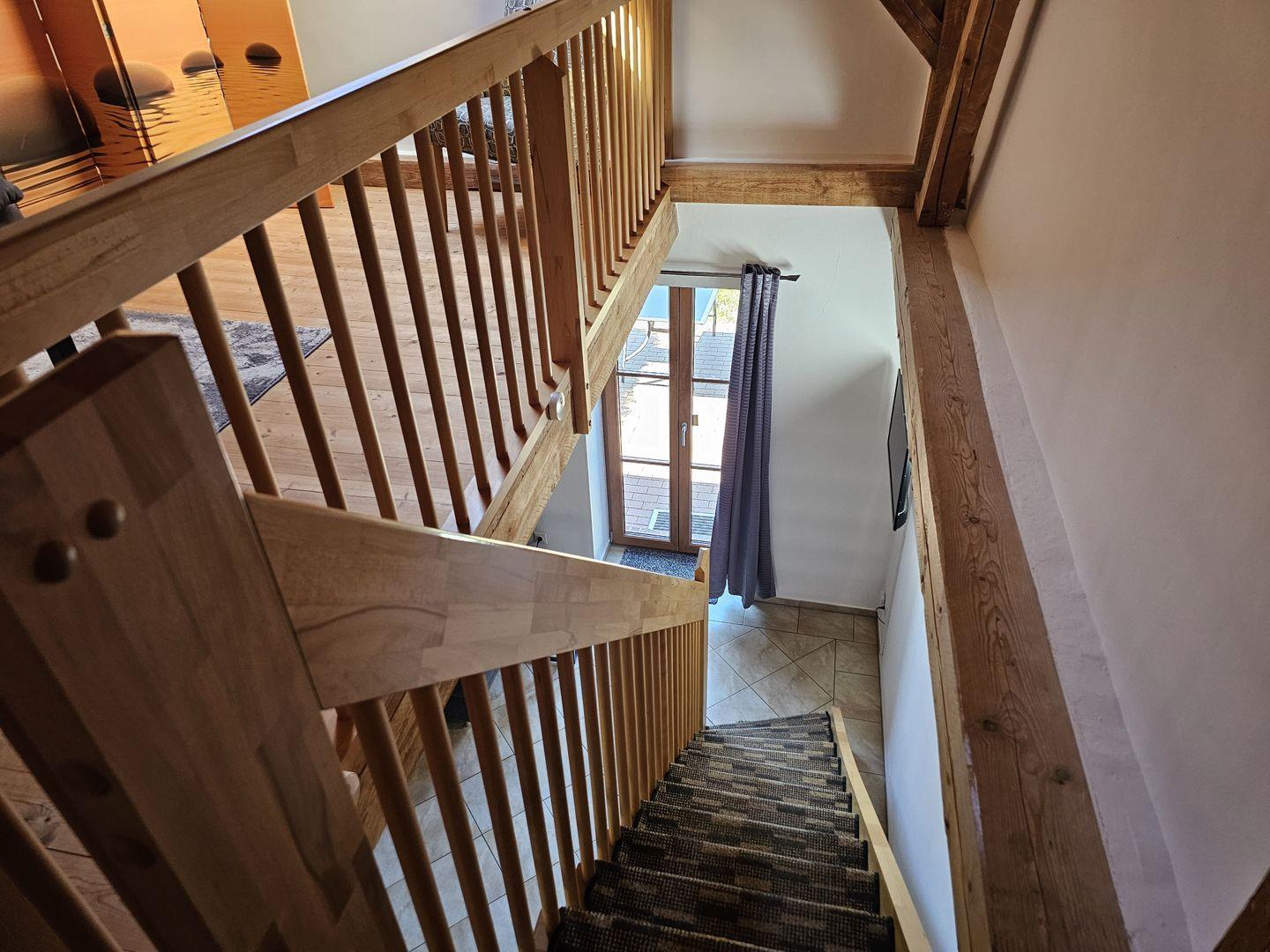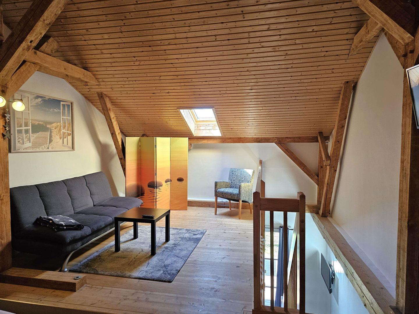 Im Erdgeschoss erwartet Sie der Wohn-Essbereich mit einer Eckcouch und Flachbildfernseher, dazu eine vollausgestattete Küche und ein Bad mit Dusche. Über eine Holztreppe gelangen Sie nach oben in den gemütlichen Schlafbereich mit großem Bett (180x200), Schlafcouch (120x180), Kleiderschrank und Smart-TV.