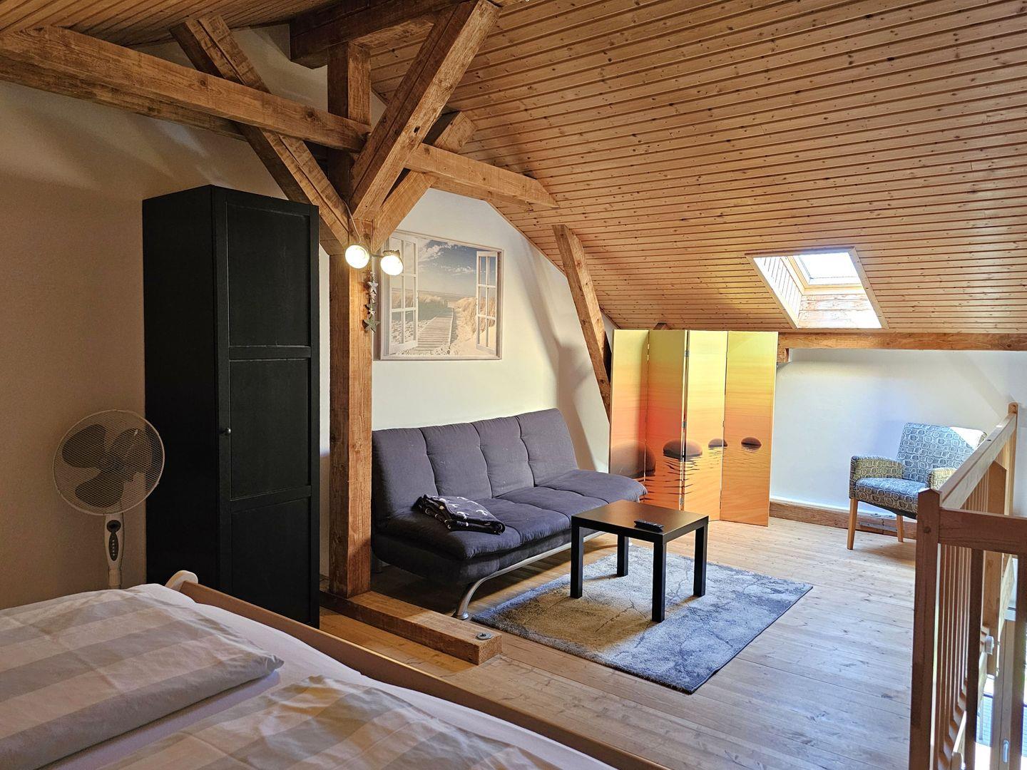 Über eine Holztreppe gelangen Sie nach oben in den gemütlichen Schlafbereich mit großem Bett (180x200), Schlafcouch (120x180), Kleiderschrank, Sideboard und einem 2. Fernseher.