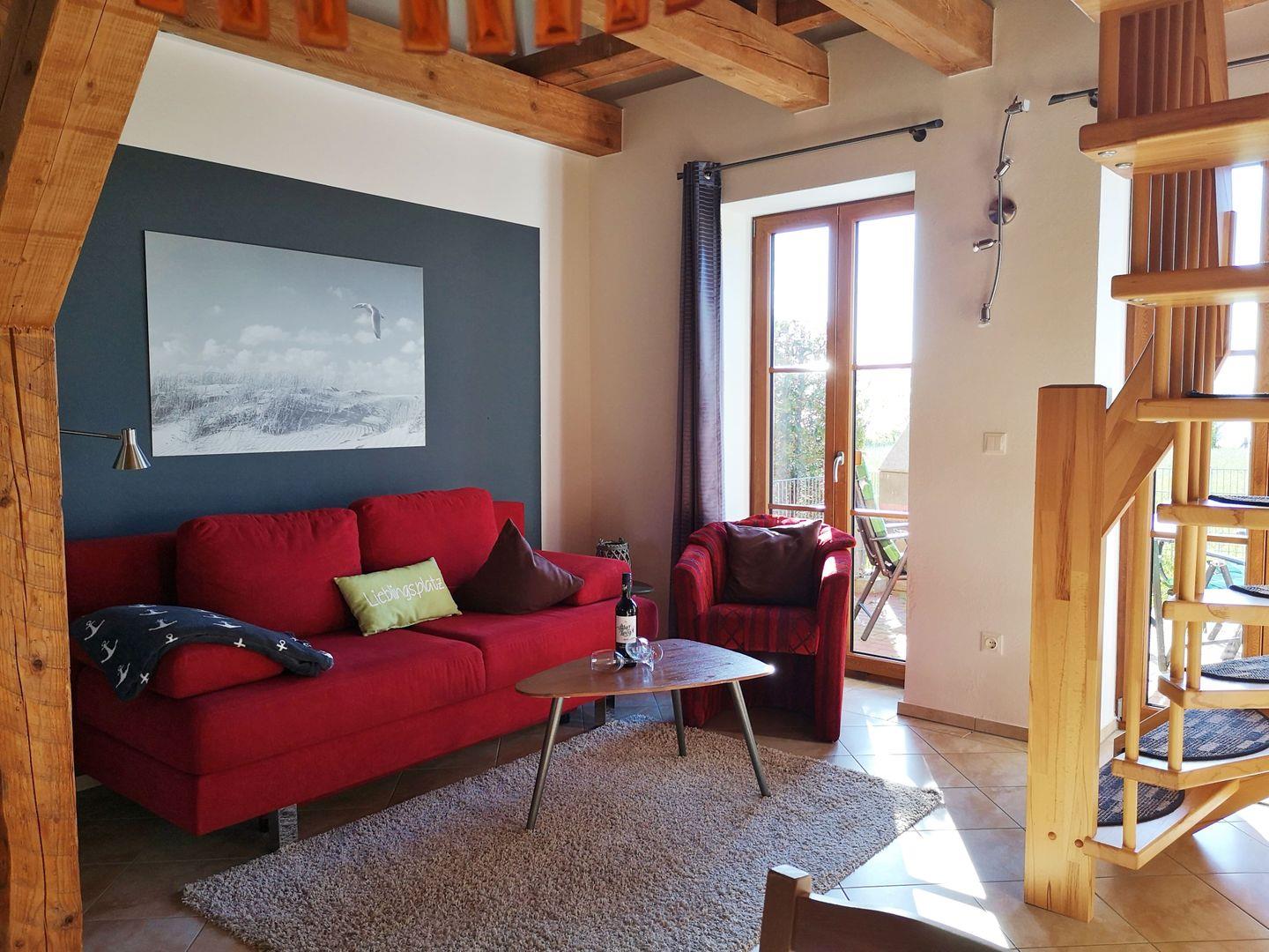 Im Erdgeschoss erwartet Sie der Wohn-Essbereich mit einer Couch und einem Flachbildfernseher, dazu eine vollausgestattete Küche und ein Bad mit Dusche. Über eine Holztreppe gelangen Sie nach oben in den gemütlichen Schlafbereich mit großem Bett (180x200), Kleiderschrank und einem 2. Fernseher.