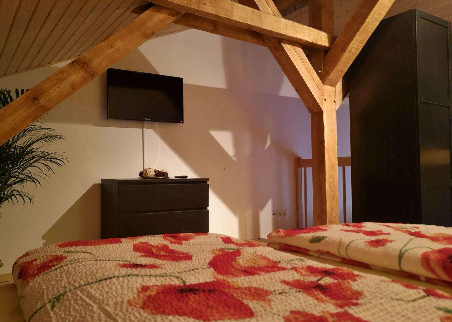 Über eine Holztreppe gelangen Sie nach oben in den gemütlichen Schlafbereich mit großem Bett (180x200), Kleiderschrank, Sideboard und Flachbildfernseher.