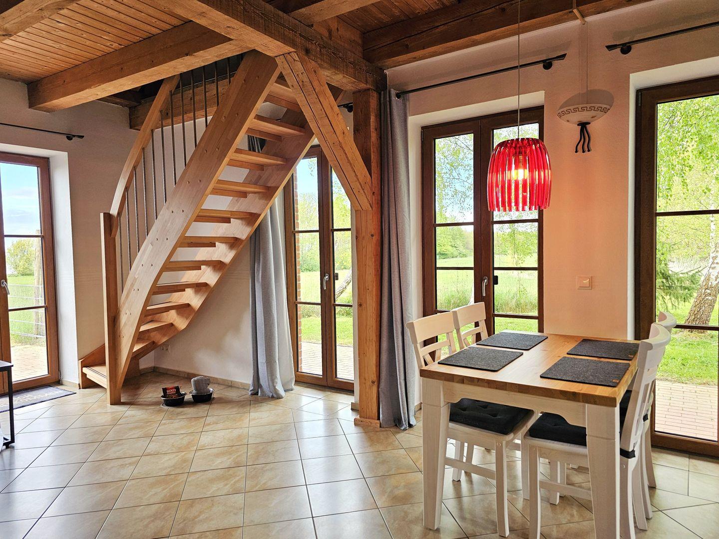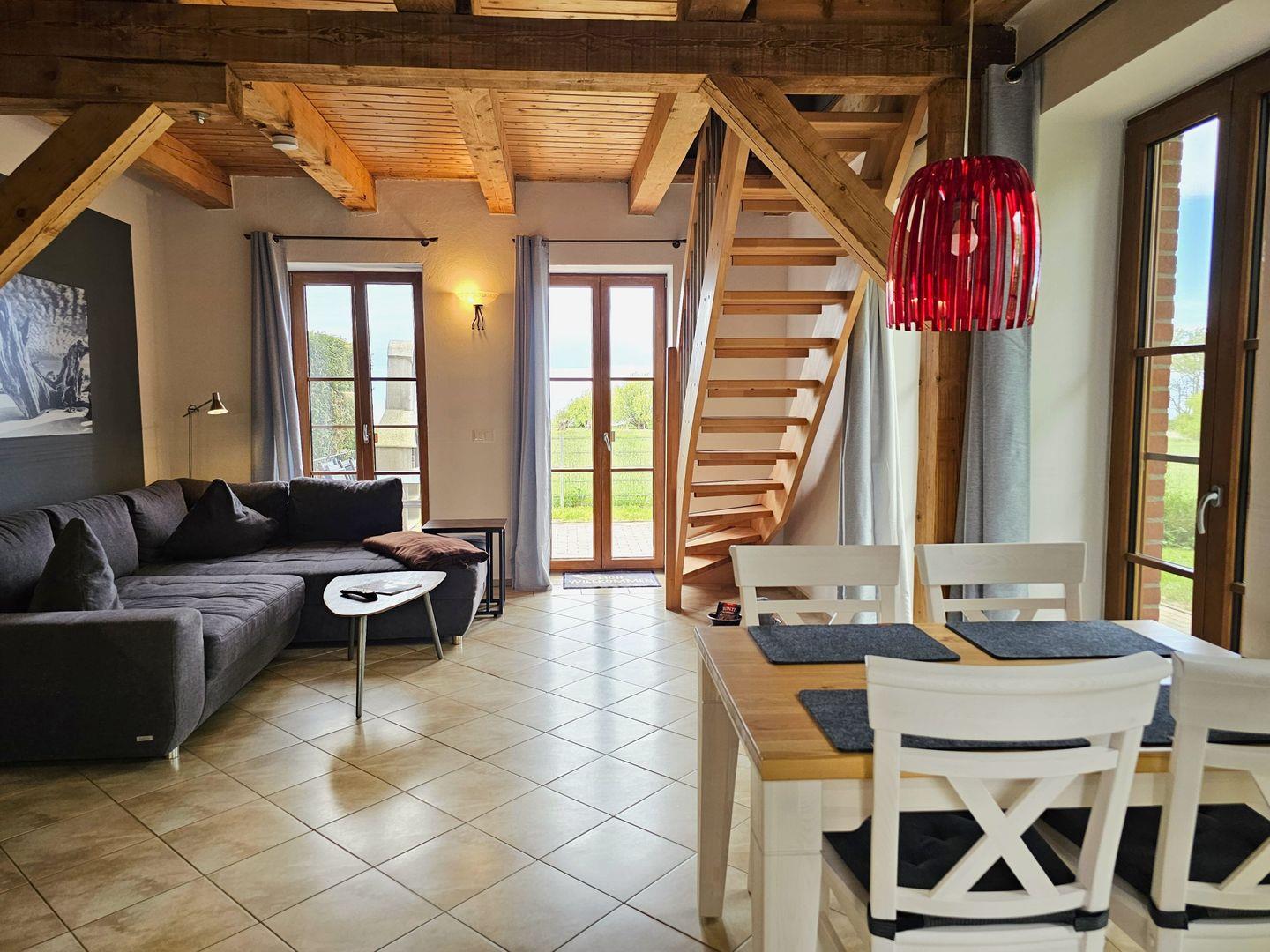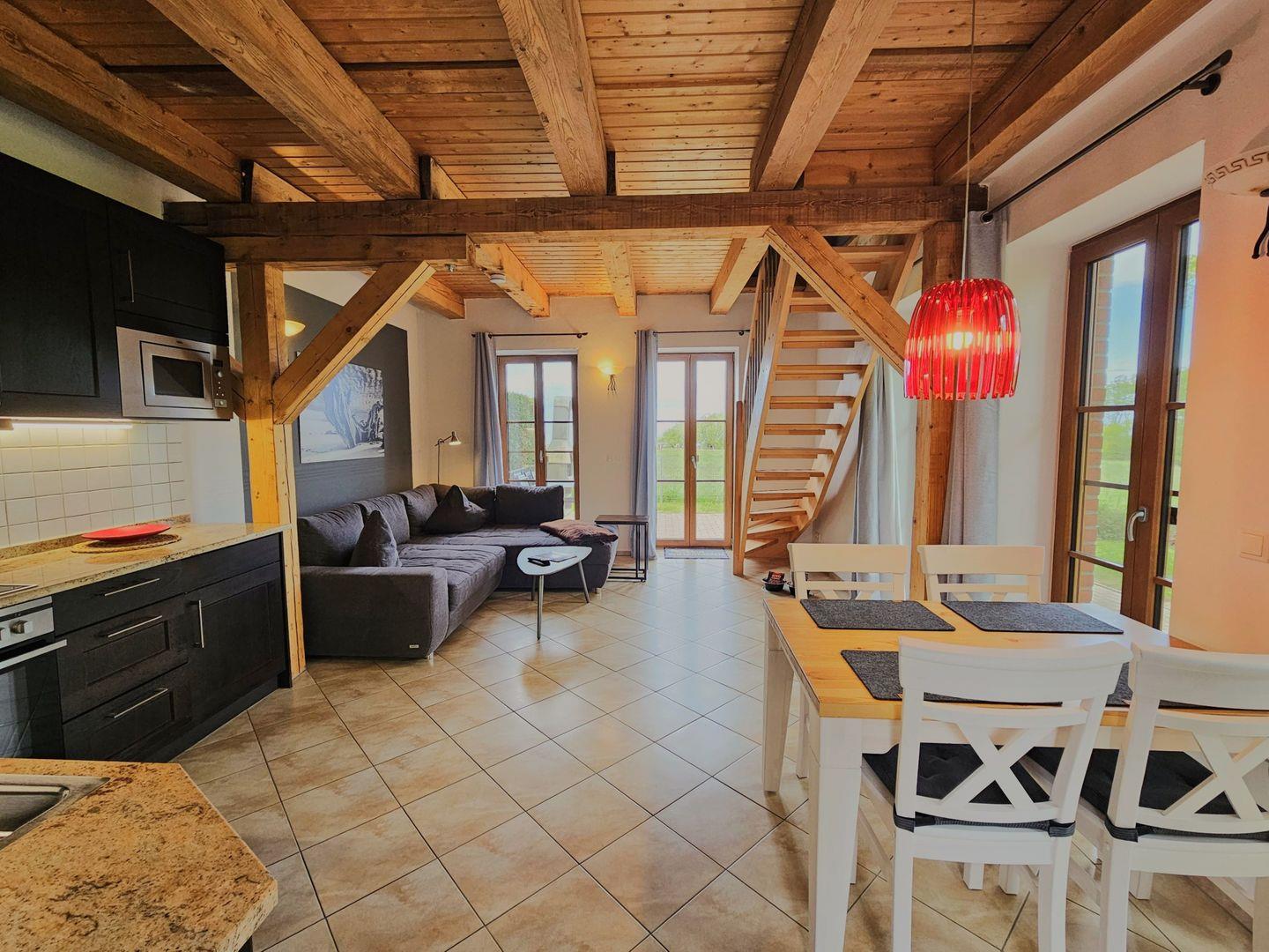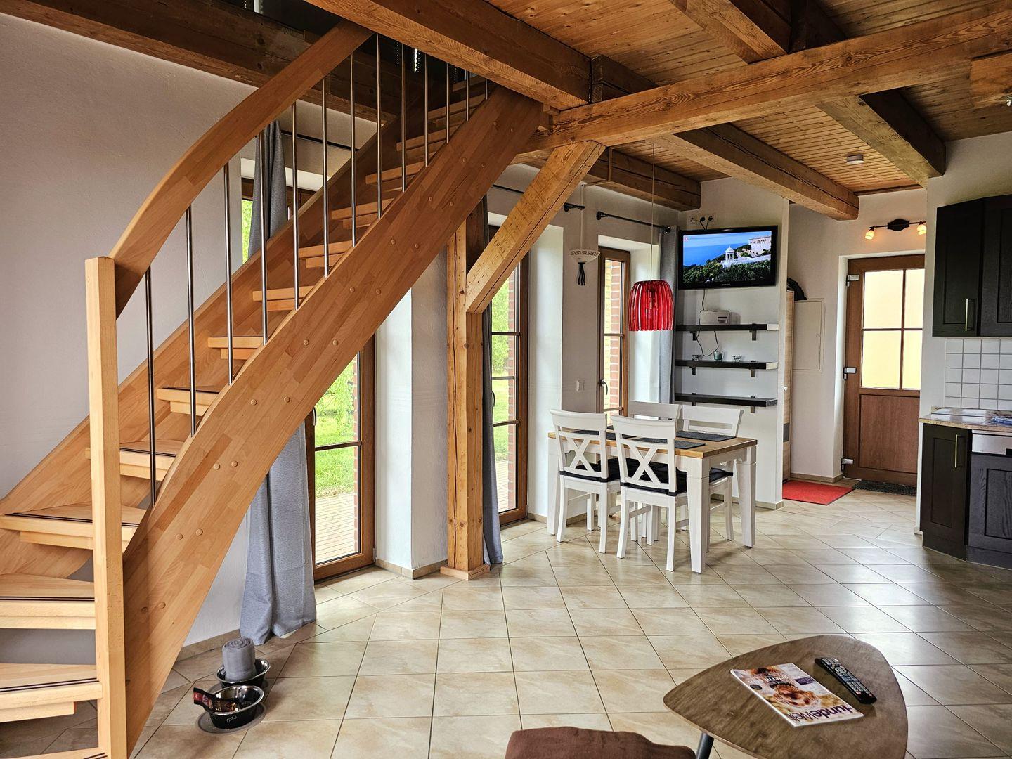 Im Erdgeschoss erwartet Sie der Wohn-Essbereich mit einer Eckcouch und Flachbildfernseher, eine vollausgestattete Küche und ein Bad mit Dusche. Über eine Holztreppe gelangen Sie nach oben in den Schlafbereich mit großem Boxspringbett (180x200), Kleiderschrank und einem 2. TV.