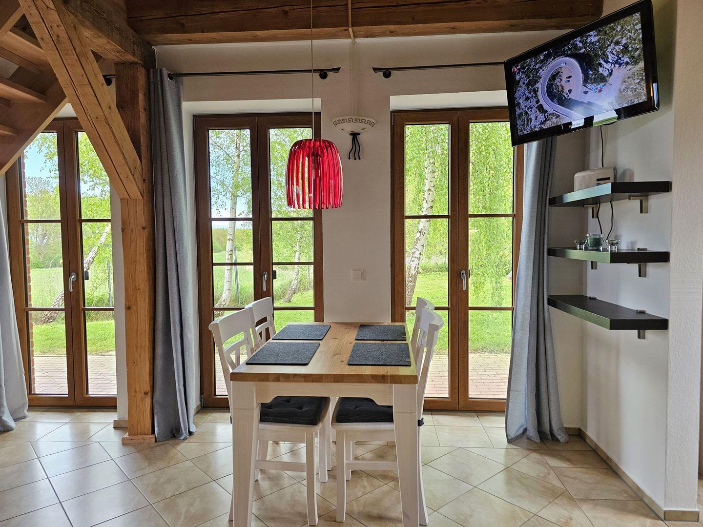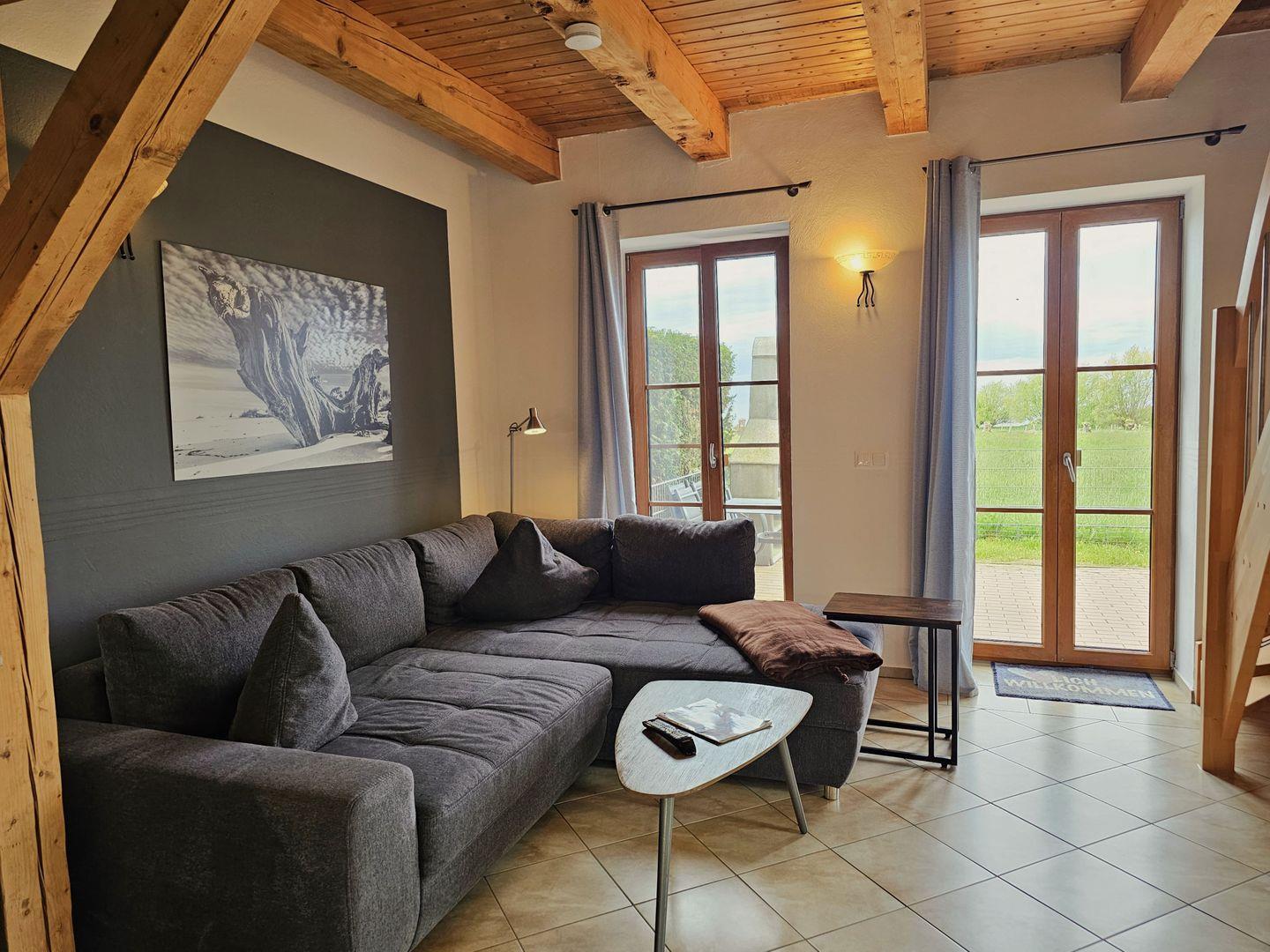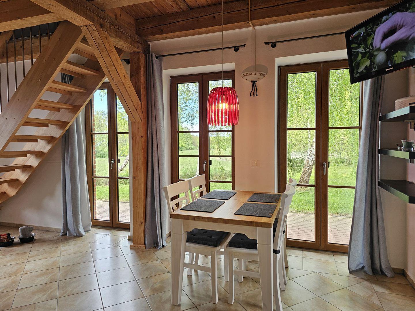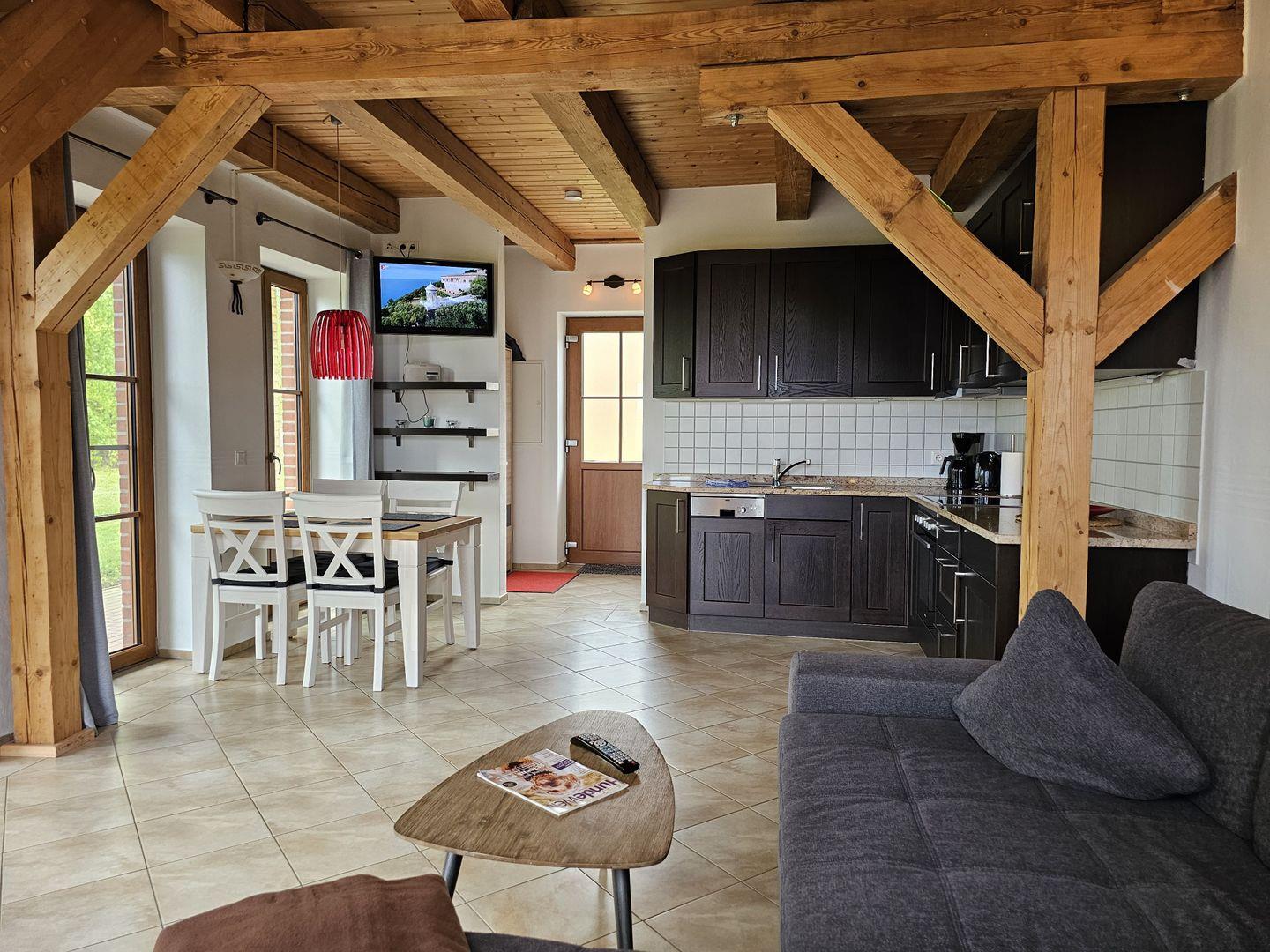 Im Erdgeschoss erwartet Sie ein gemütlicher Wohn-Essbereich mit großer Eckcouch mit Schlaffunktion (180x200) und Flachbildfernseher, dazu eine vollausgestattete Küche und ein Bad mit Dusche.
