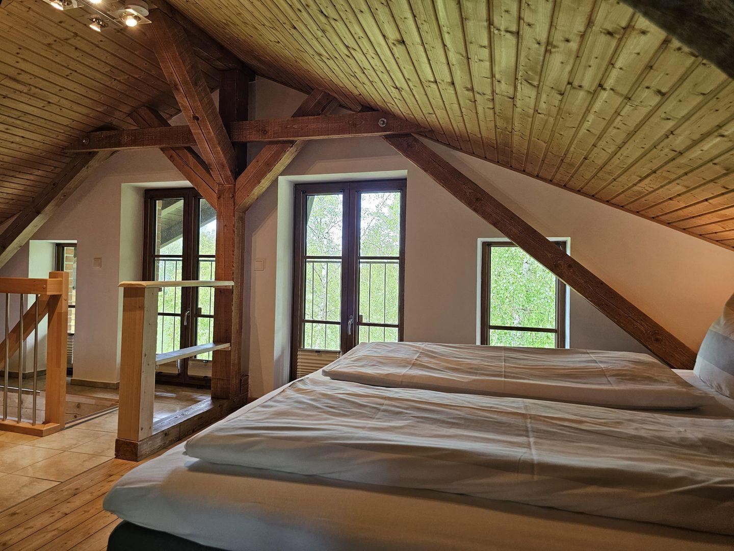 Über eine Holztreppe gelangen Sie nach oben in den Schlafbereich mit einem gemütlichen Boxspringbett (180x200), Kleiderschrank, Sideboard und Flachbildfernseher.