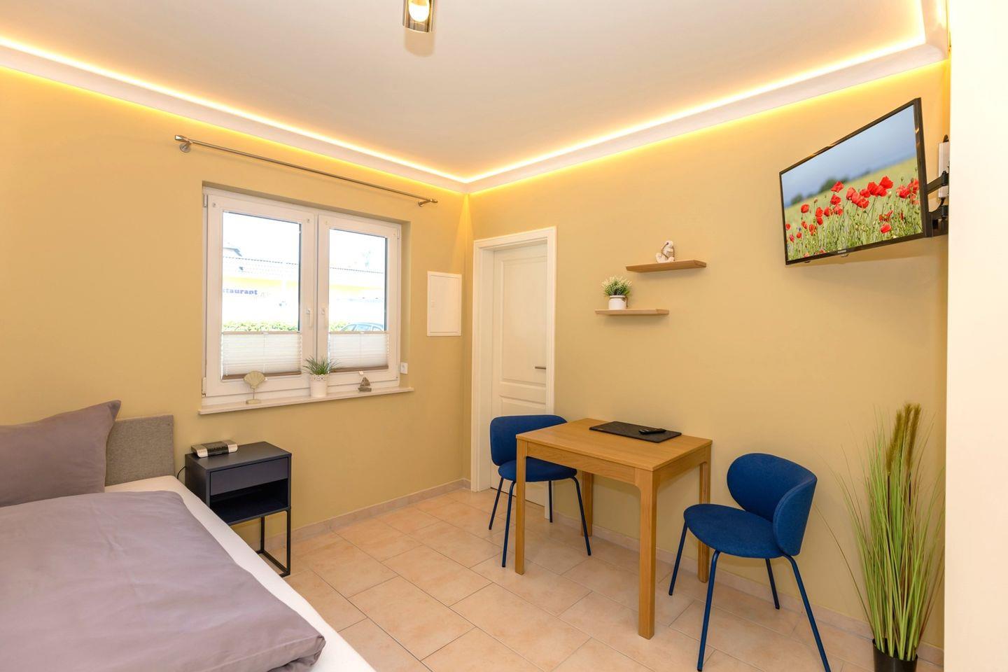 Das kombinierte Wohn-/Schlafzimmer verfügt über einen gemütlichen Essbereich. Im Schlafbereich finden Sie ein bequemes Einzelbett mit Nachttisch und einen Kleiderschrank vor.