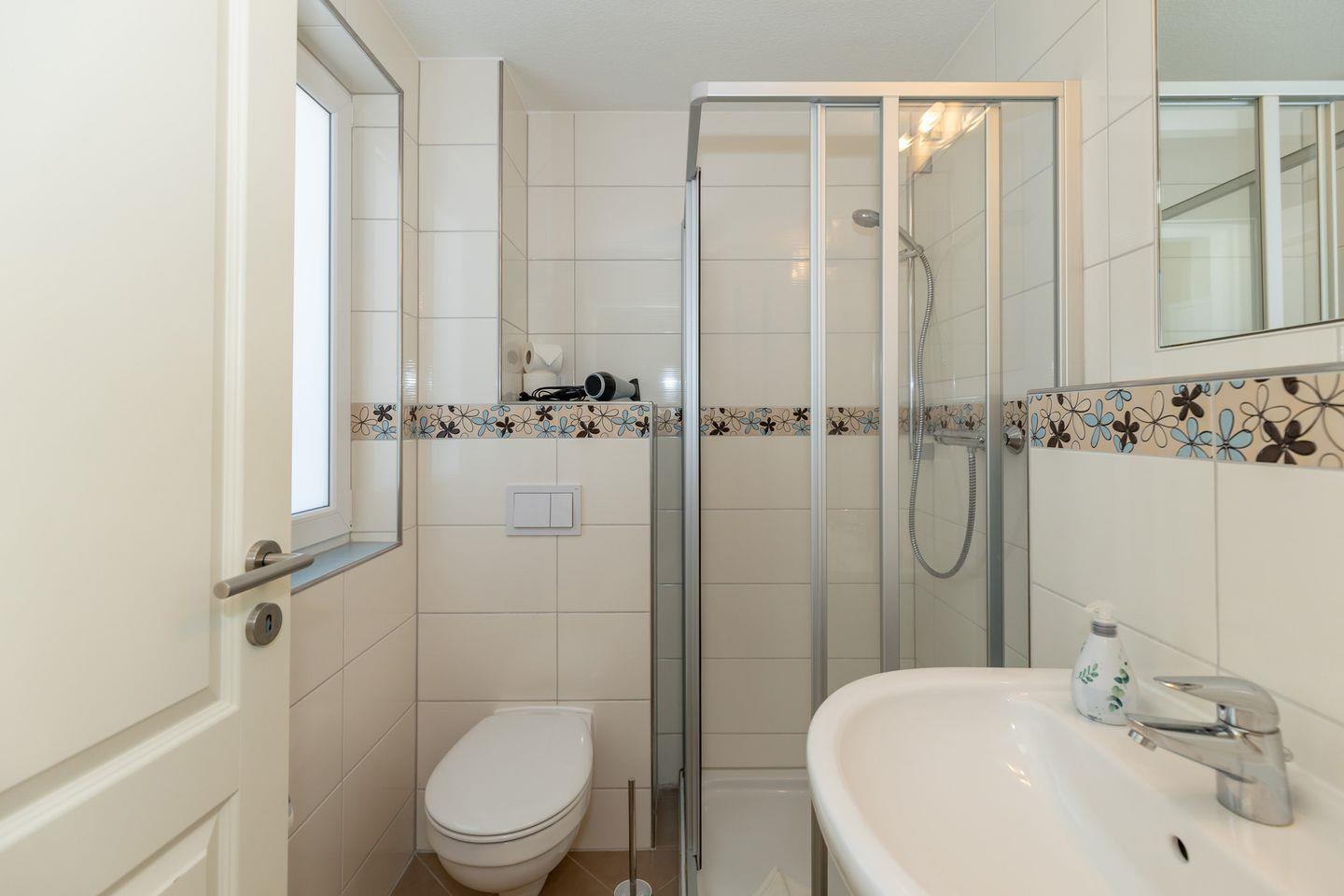 Das helle und moderne Badezimmer (mit Tageslicht / Fenster) verfügt über eine Dusche mit flachem Einstieg (seniorenfreundlich!), Waschbecken, WC, Föhn, Handtuch-Heizkörper, Fußbodenheizung sowie ausreichend Ablagemöglichkeiten.