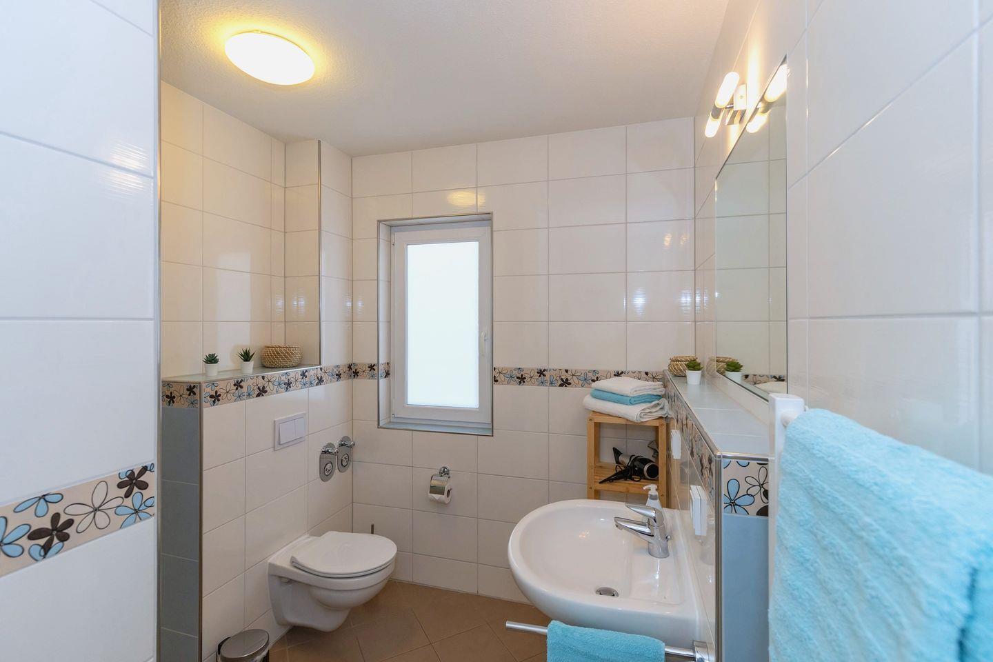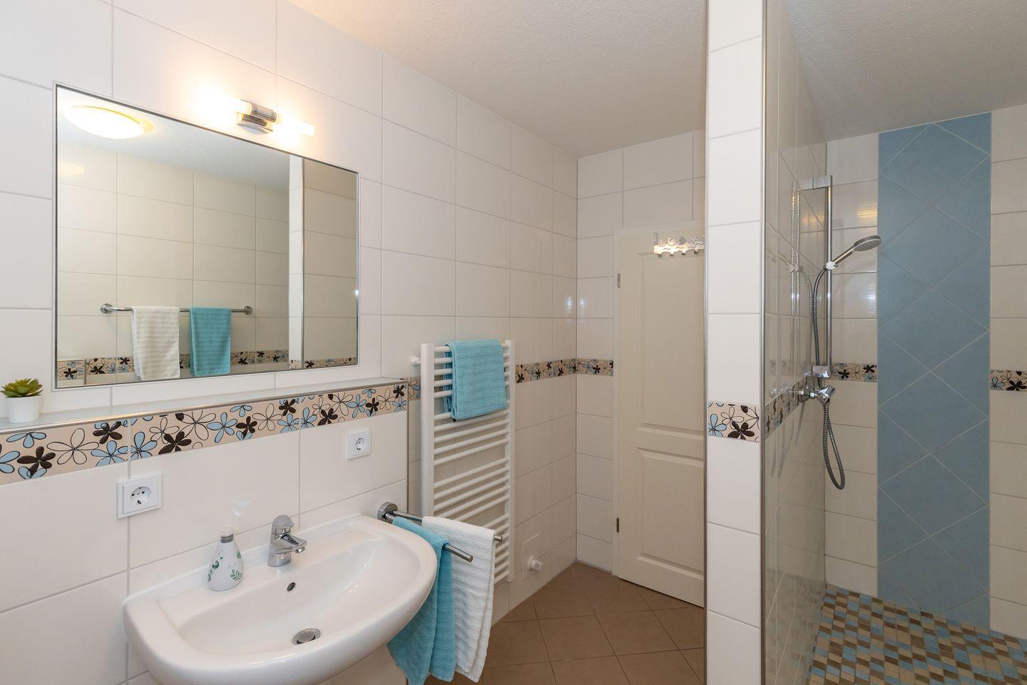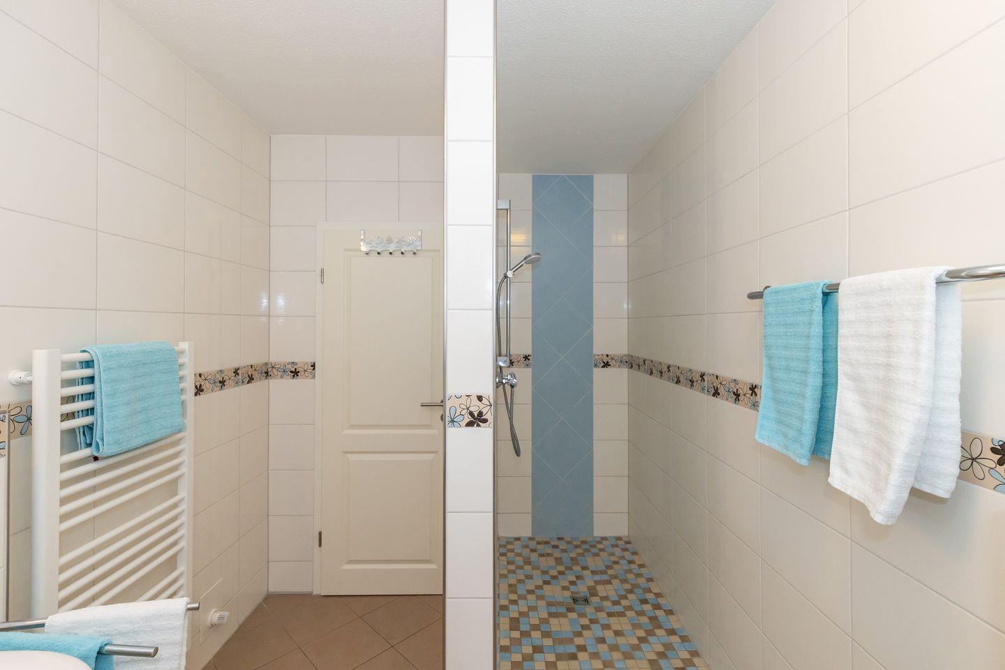 Das große und moderne Badezimmer (mit Tageslicht / Fenster) verfügt über einen sehr großen Duschbereich (180 cm x 90 cm) mit ebenerdigem Einstieg (seniorenfreundlich!) und thermostatgeregelter Duschbrause, Waschbecken, WC, Föhn, Handtuch-Heizkörper, Fußbodenheizung sowie ausreichend Ablagemöglichkeiten.