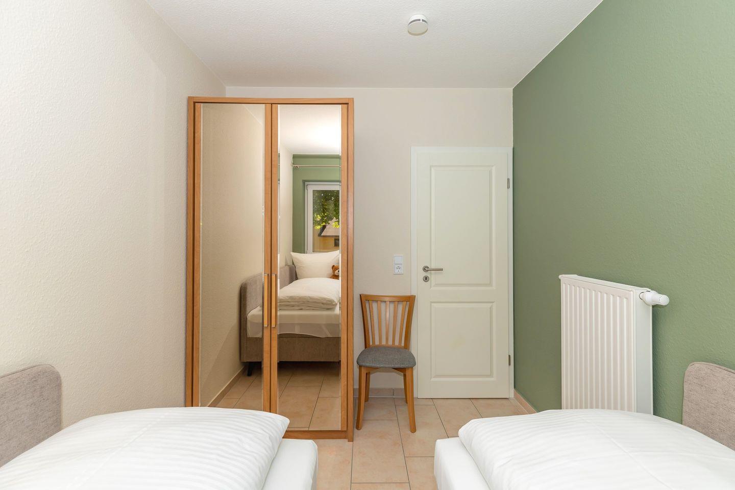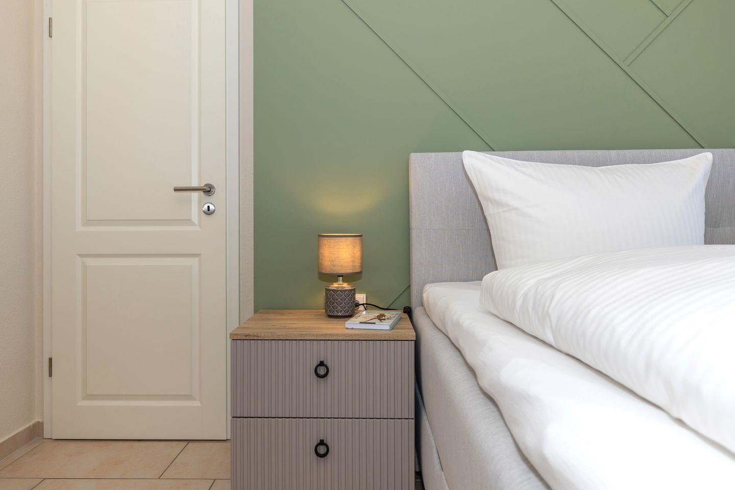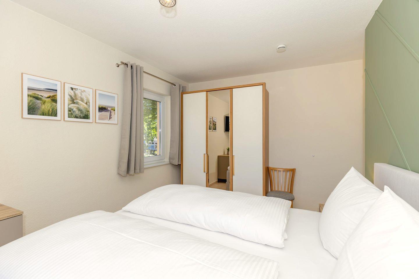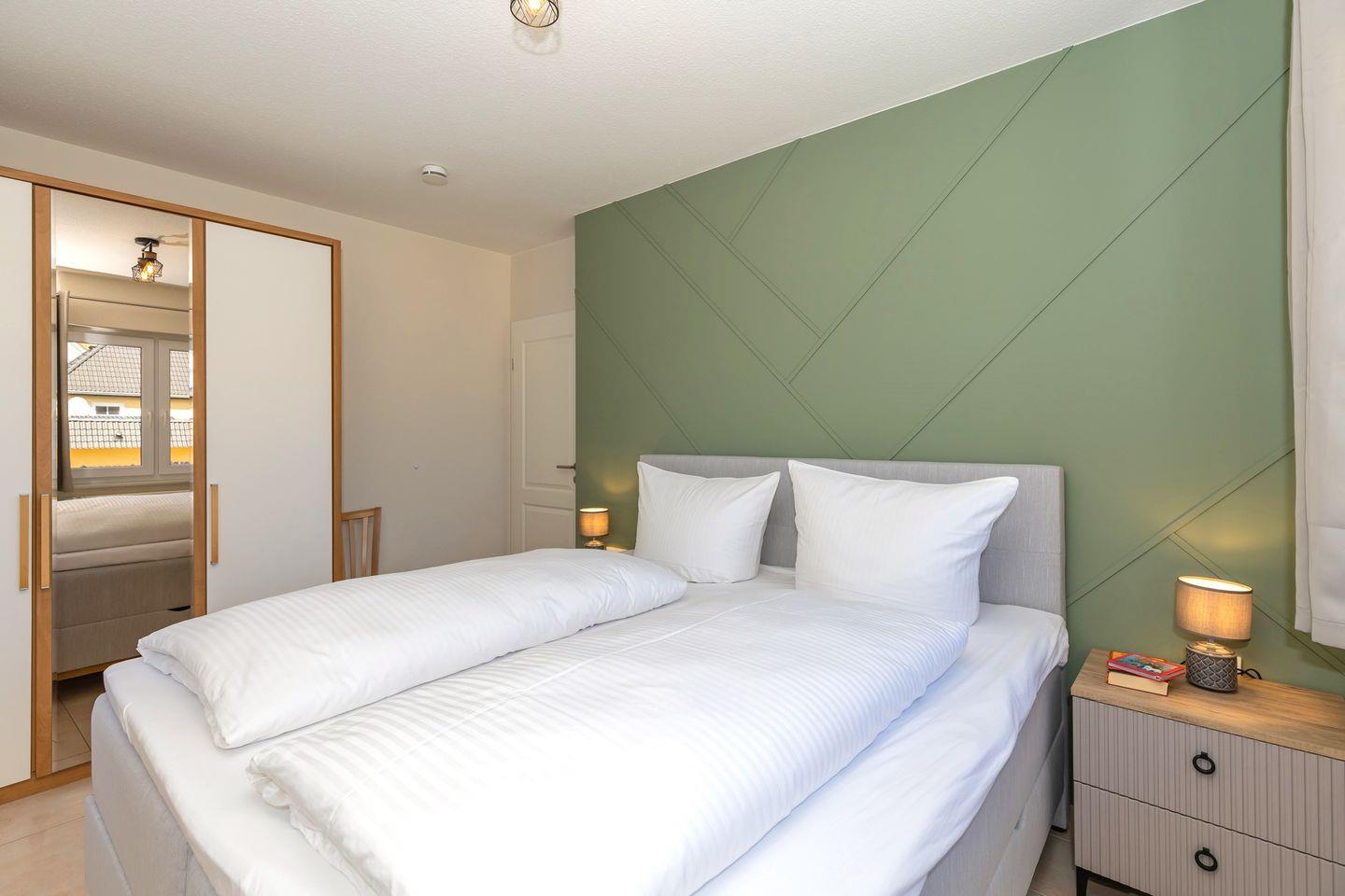 Das freundliche 1. Schlafzimmer ist mit einem bequemen Doppelbett, Nachttischen sowie einem geräumigen Kleiderschrank eingerichtet. Das separate 2. Schlafzimmer verfügt über 2 getrennte Boxspring-Einzelbetten, einen Nachttisch sowie einen geräumigen Kleiderschrank. Bettwäsche und Handtücher können hinzugebucht werden.