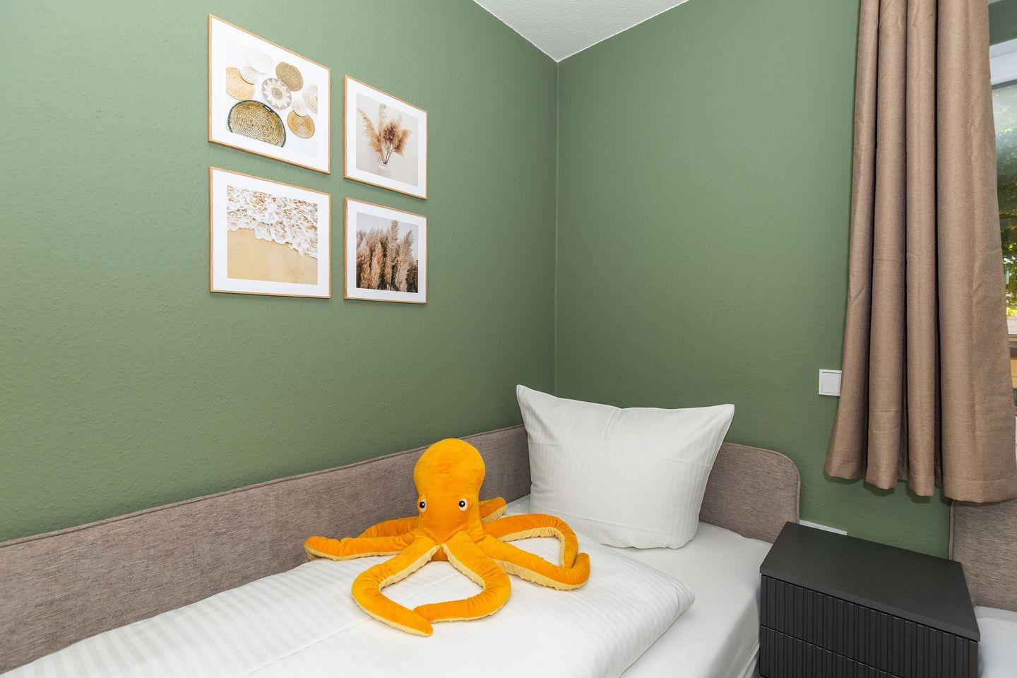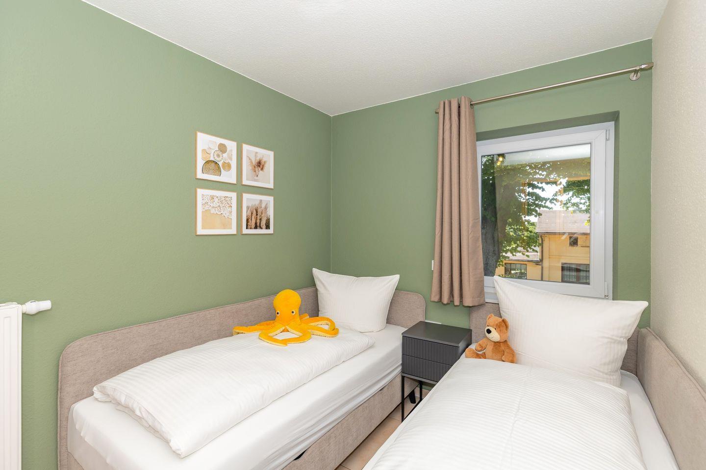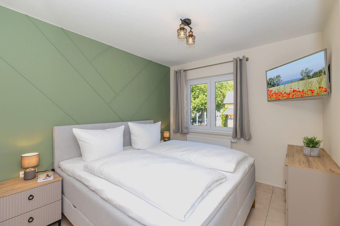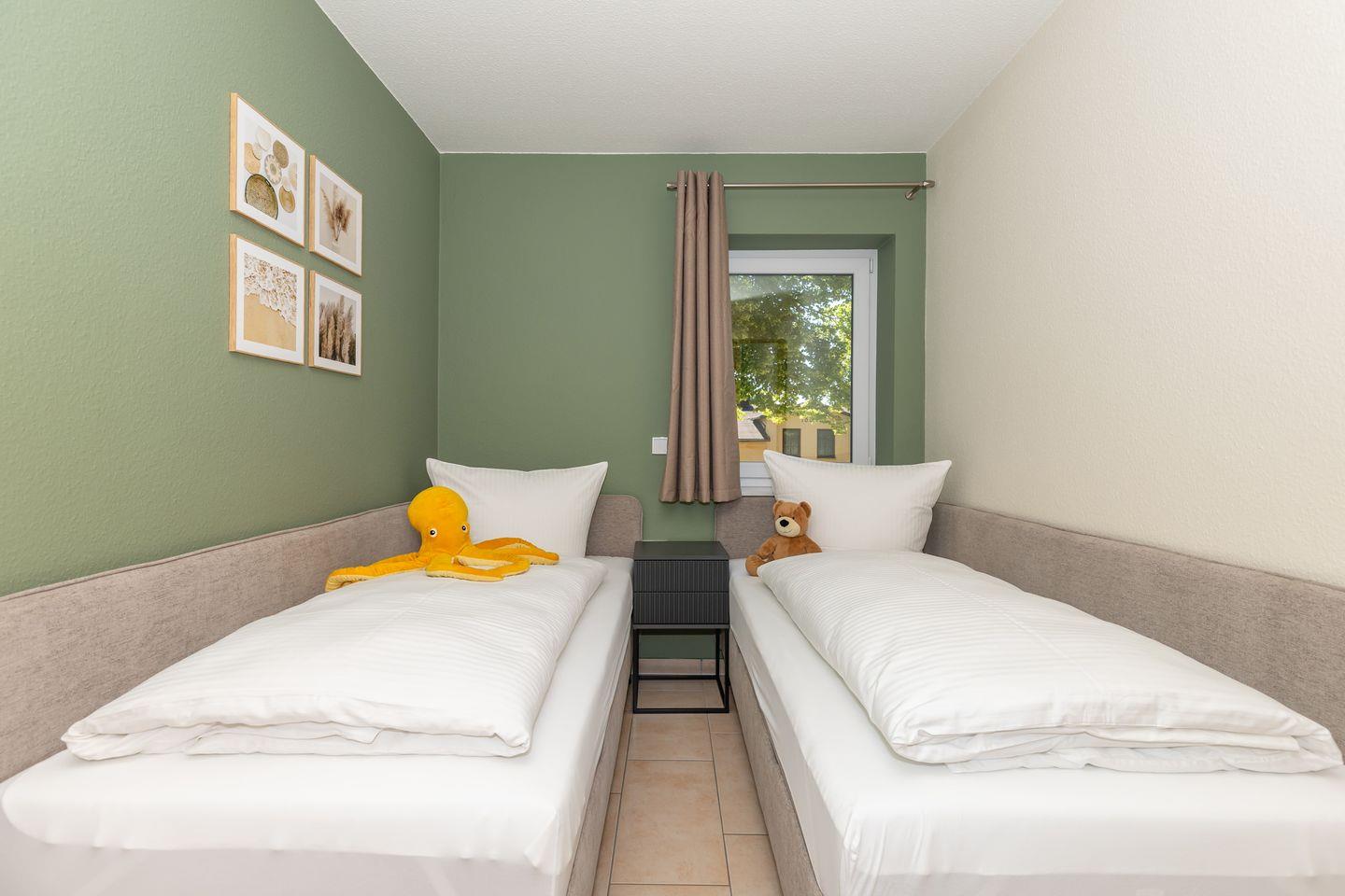 Das freundliche 1. Schlafzimmer ist mit einem bequemen Doppelbett, Nachttischen sowie einem geräumigen Kleiderschrank eingerichtet. Das separate 2. Schlafzimmer verfügt über 2 getrennte Boxspring-Einzelbetten, einen Nachttisch sowie einen geräumigen Kleiderschrank. Bettwäsche und Handtücher können hinzugebucht werden.