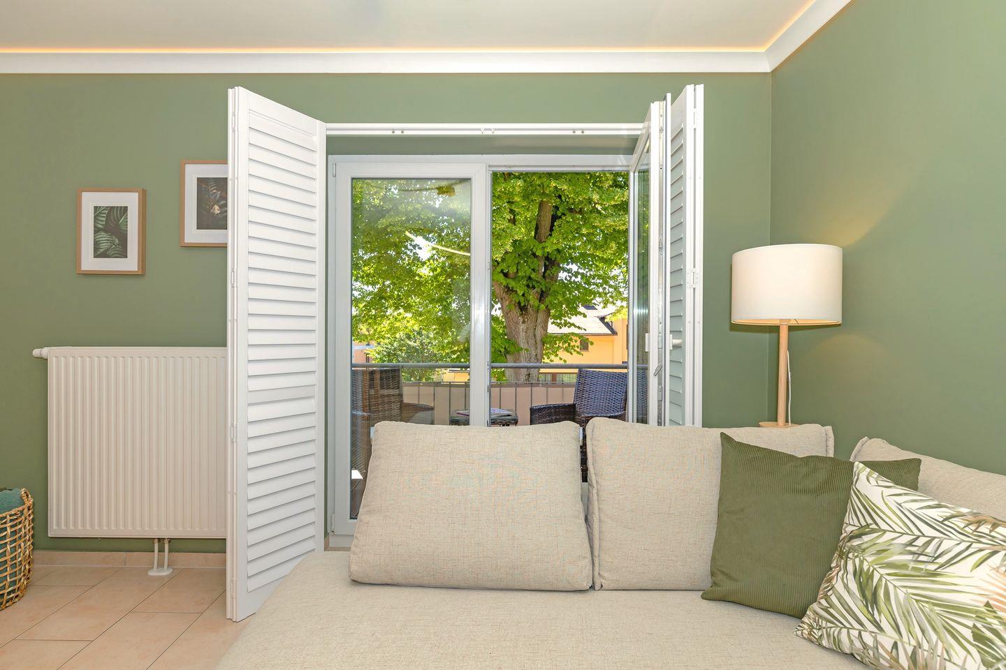 Das geräumige Wohn-/Esszimmer verfügt über eine separate Sitzgruppe mit großer, bequemer Couch und Couchtisch, eine Schrankwohnwand sowie einen separaten Esstisch mit 4 Stühlen. Vom Wohnzimmer aus haben Sie direkten Zugang zu dem großen und sonnigen Balkon (nach Süden ausgerichtet) mit Balkonmöbeln - hier sitzen Sie entspannt und gemütlich im Grünen!