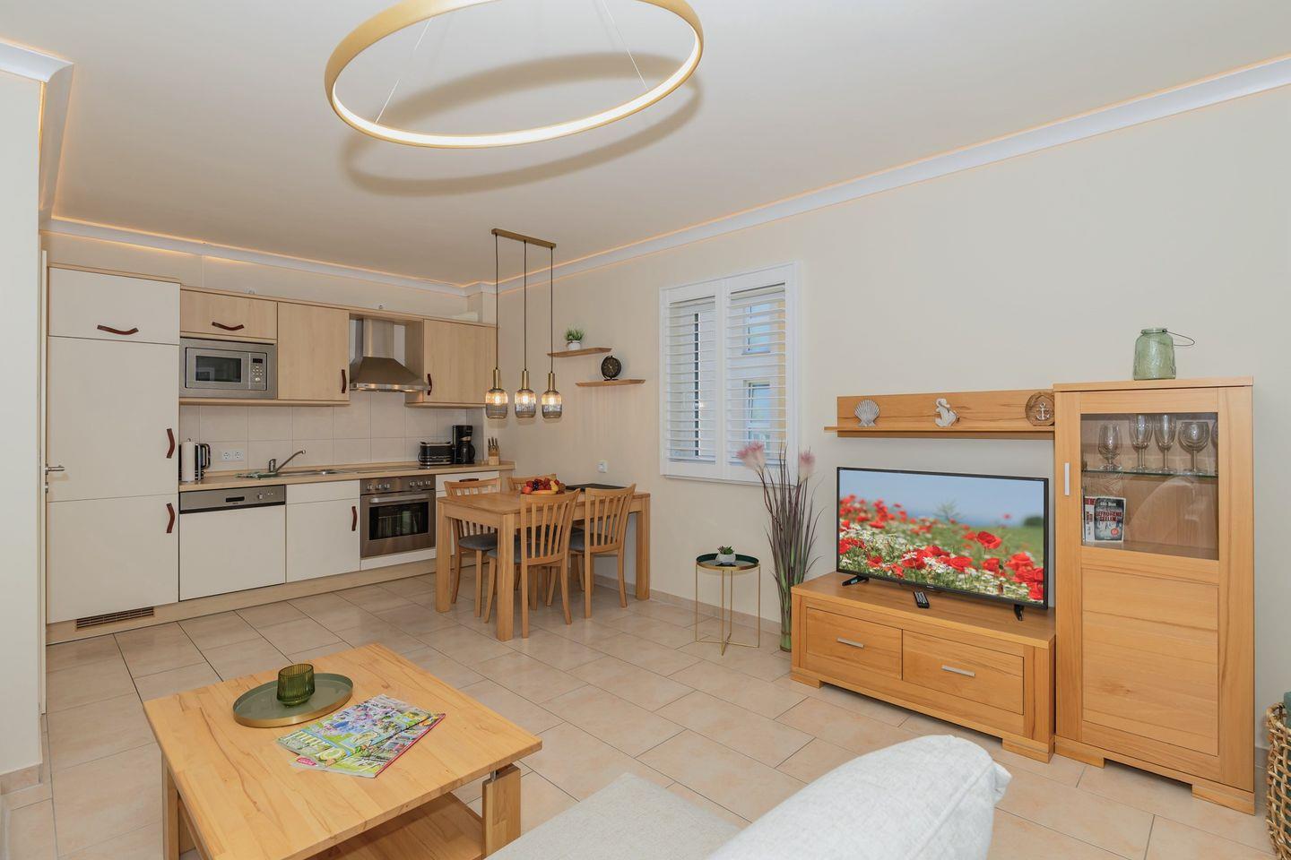 Die offene Küche beinhaltet eine voll ausgestattete Einbauküchenzeile mit 4-Platten-Ceran-Kochfeld, Backofen, Dunstabzug, Mikrowelle, Kühlschrank mit Gefrierfach, Geschirr-spülmaschine, Kaffeemaschine, Wasserkocher und Toaster. Die Küche ist mit Geschirr, Gläsern, Besteck und Töpfen bestens und ausreichend ausgestattet.