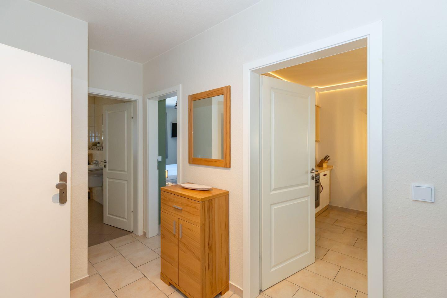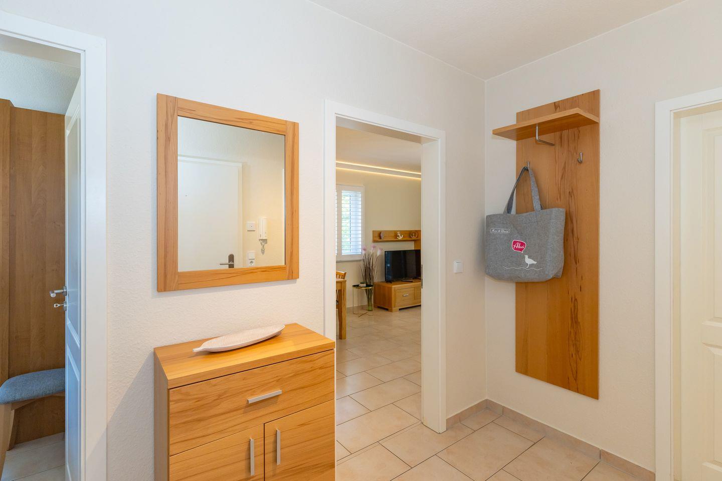 Vom Flur mit Garderobe, Spiegel und Kommode erreichen Sie bequem alle Räume Ihrer Ferienwohnung.