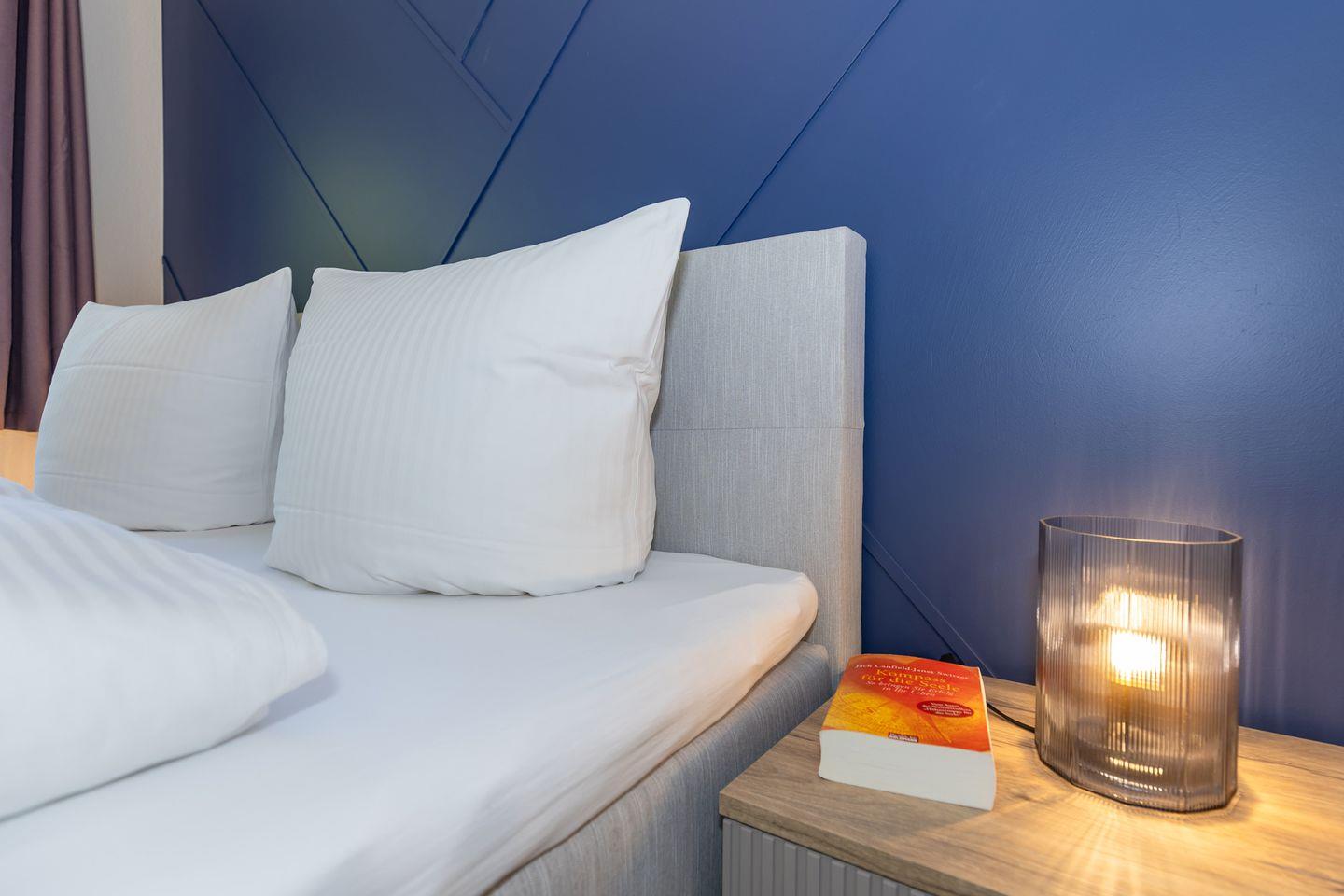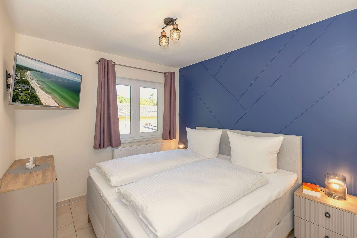 Das freundliche 1. Schlafzimmer ist mit einem bequemen Doppelbett, Nachttischen sowie einem geräumigen Kleiderschrank eingerichtet. Das separate 2. Schlafzimmer verfügt über ein separates Boxspring-Einzelbett, ein Etagen-/Doppelstockbett (für Kinder), einen Nachttisch sowie einen geräumigen Kleiderschrank. Bettwäsche und Handtücher können hinzugebucht werden.