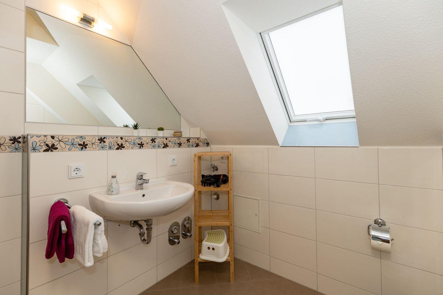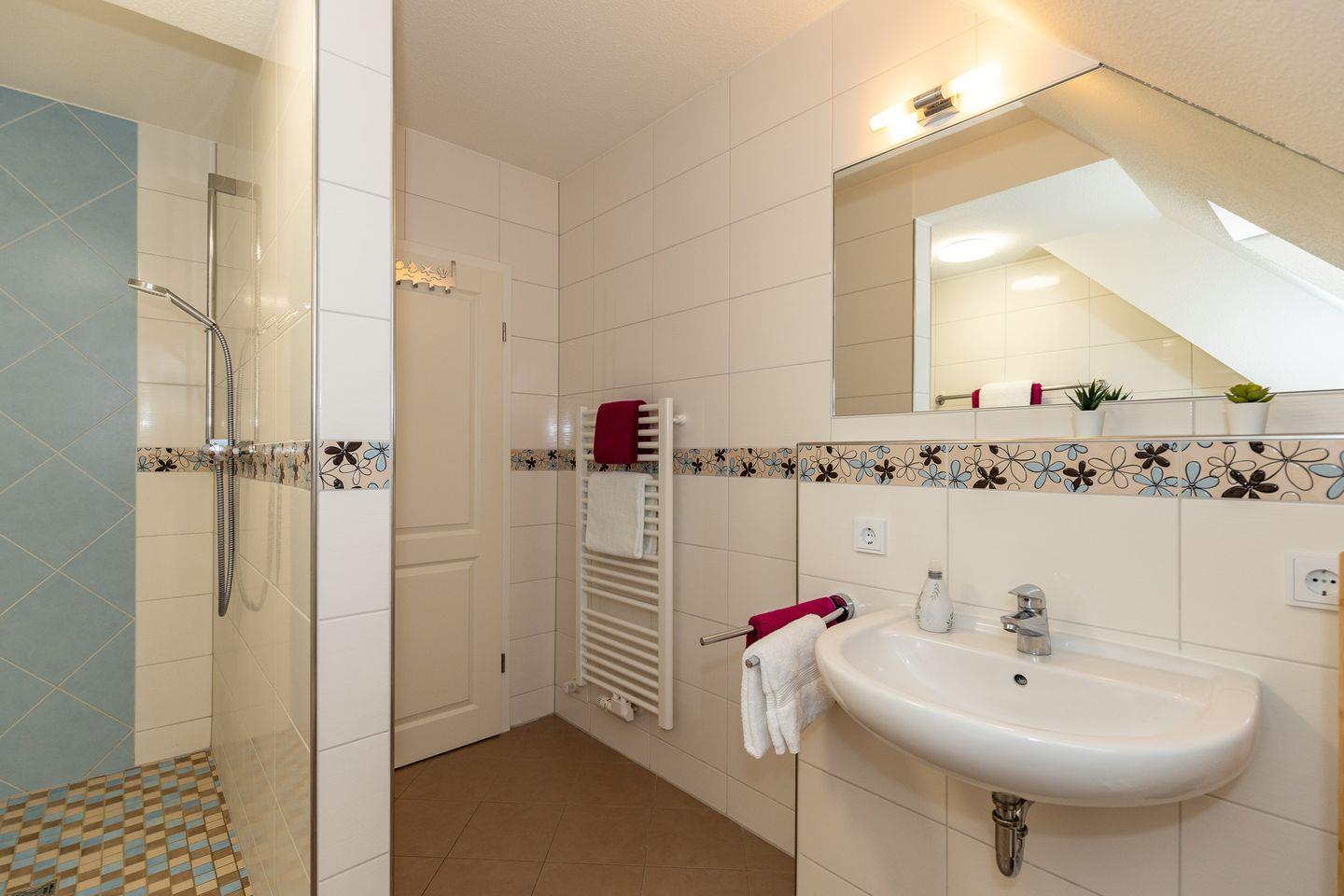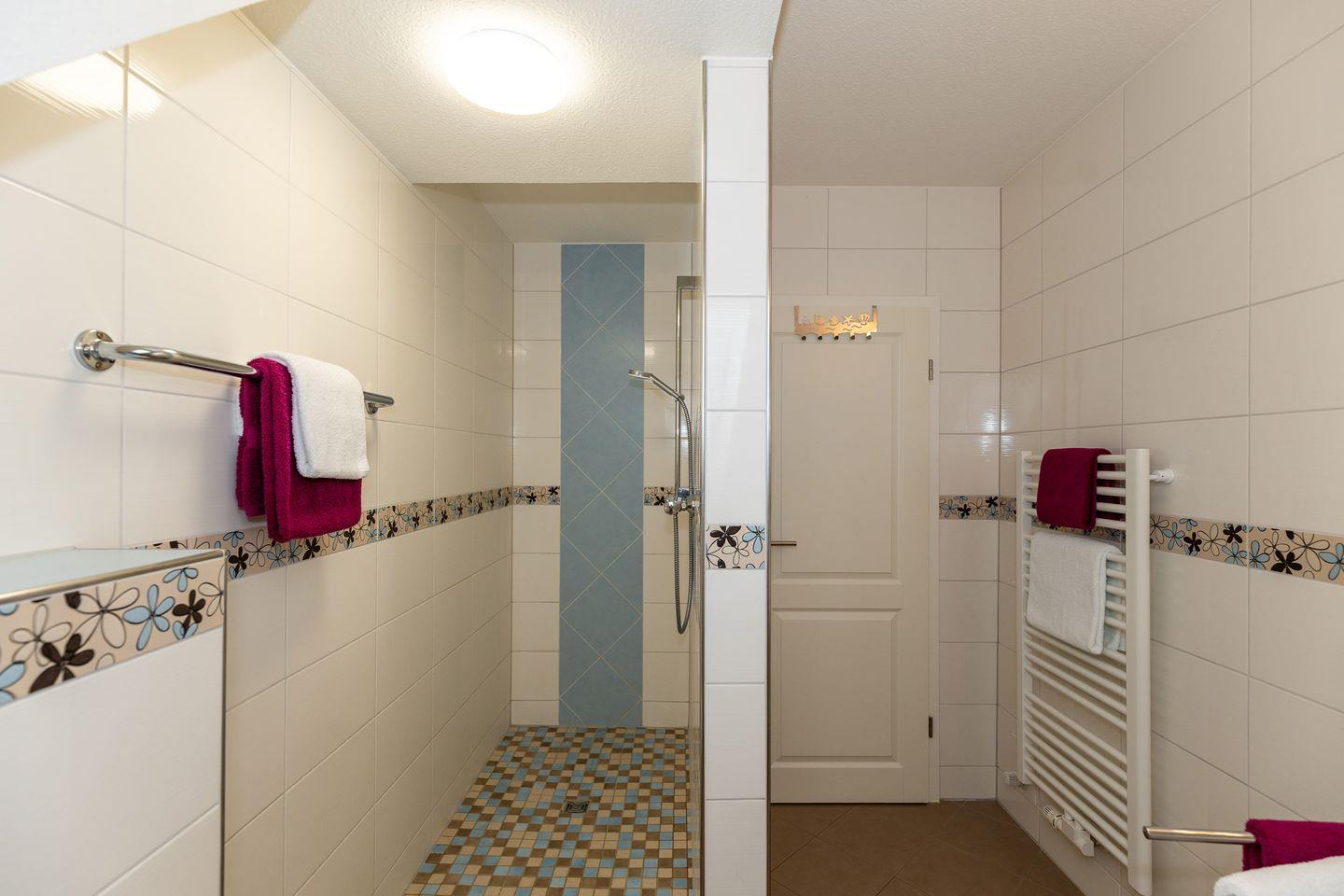 Das große und moderne Badezimmer (mit Tageslicht / Fenster) verfügt über einen sehr großen Duschbereich (180 cm x 90 cm) mit ebenerdigem Einstieg (seniorenfreundlich!) und thermostatgeregelter Duschbrause, Waschbecken, WC, Föhn, Handtuch-Heizkörper, Fußbodenheizung sowie ausreichend Ablagemöglichkeiten.