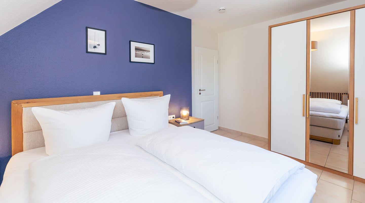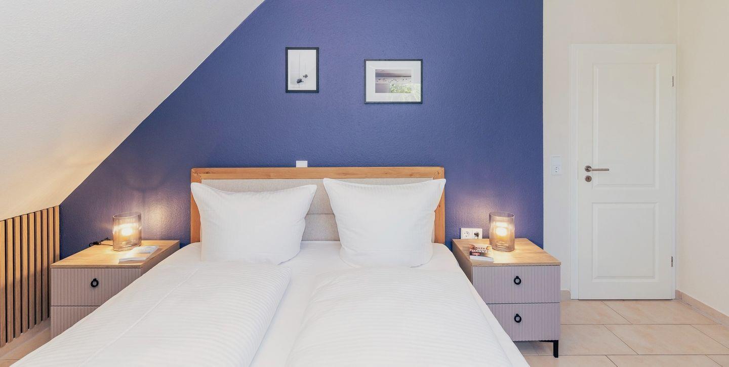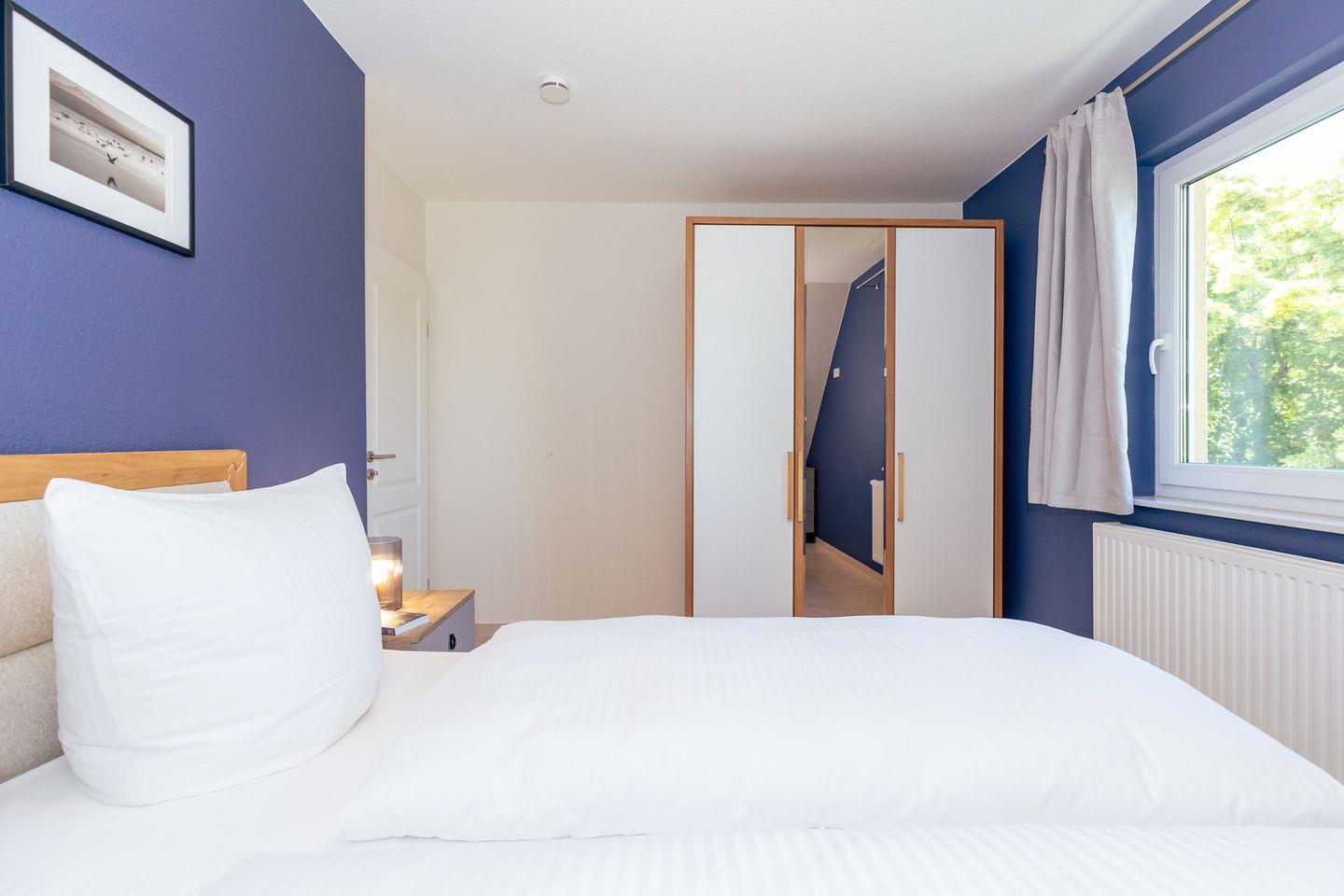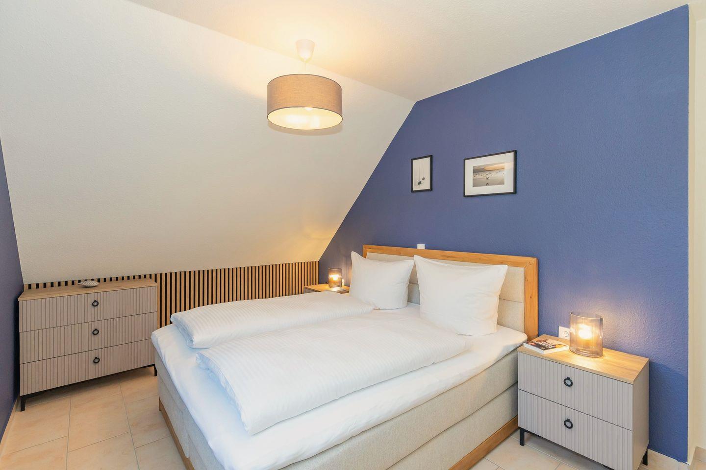 Das freundliche 1. Schlafzimmer ist mit einem bequemen Boxspringbett (180x200), Nachttischen, sowie einem geräumigen Kleiderschrank eingerichtet. Das separate 2. Schlafzimmer verfügt über ein Boxspring-Einzelbett, einen Nachttisch sowie einen Kleiderschrank. Das separate 3. Schlafzimmer in der 2. Etage ist mit einem bequemen Doppelbett, Nachttischen, einem Kleiderschrank sowie einm breiten Schlafsessel für 1 Person eingerichtet. Bettwäsche und Handtücher können hinzugebucht werden.