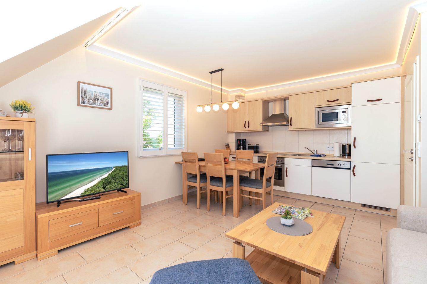 Die offene Küche beinhaltet eine voll ausgestattete Einbauküchenzeile mit 4-Platten-Ceran-Kochfeld, Backofen, Dunstabzug, Mikrowelle, Kühlschrank mit Gefrierfach, Geschirr-spülmaschine, Kaffeemaschine, Wasserkocher und Toaster. Die Küche ist mit Geschirr, Gläsern, Besteck und Töpfen bestens und ausreichend ausgestattet.