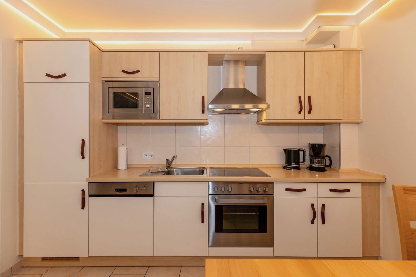 Die offene Küche beinhaltet eine voll ausgestattete Einbauküchenzeile mit 4-Platten-Ceran-Kochfeld, Backofen, Dunstabzug, Mikrowelle, Kühlschrank mit Gefrierfach, Geschirrspülmaschine, Kaffeemaschine, Wasserkocher und Toaster. Die Küche ist mit Geschirr, Gläsern, Besteck und Töpfen bestens und ausreichend ausgestattet.