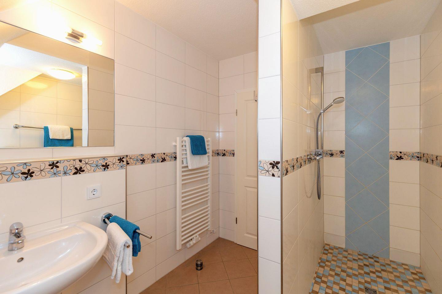 Das große und moderne Badezimmer (mit Tageslicht / Fenster) verfügt über einen sehr großen Duschbereich (180 cm x 90 cm) mit ebenerdigem Einstieg (seniorenfreundlich!) und thermostatgeregelter Duschbrause, Waschbecken, WC, Föhn, Handtuch-Heizkörper, Fußbodenheizung, sowie vielen Ablagemöglichkeiten.