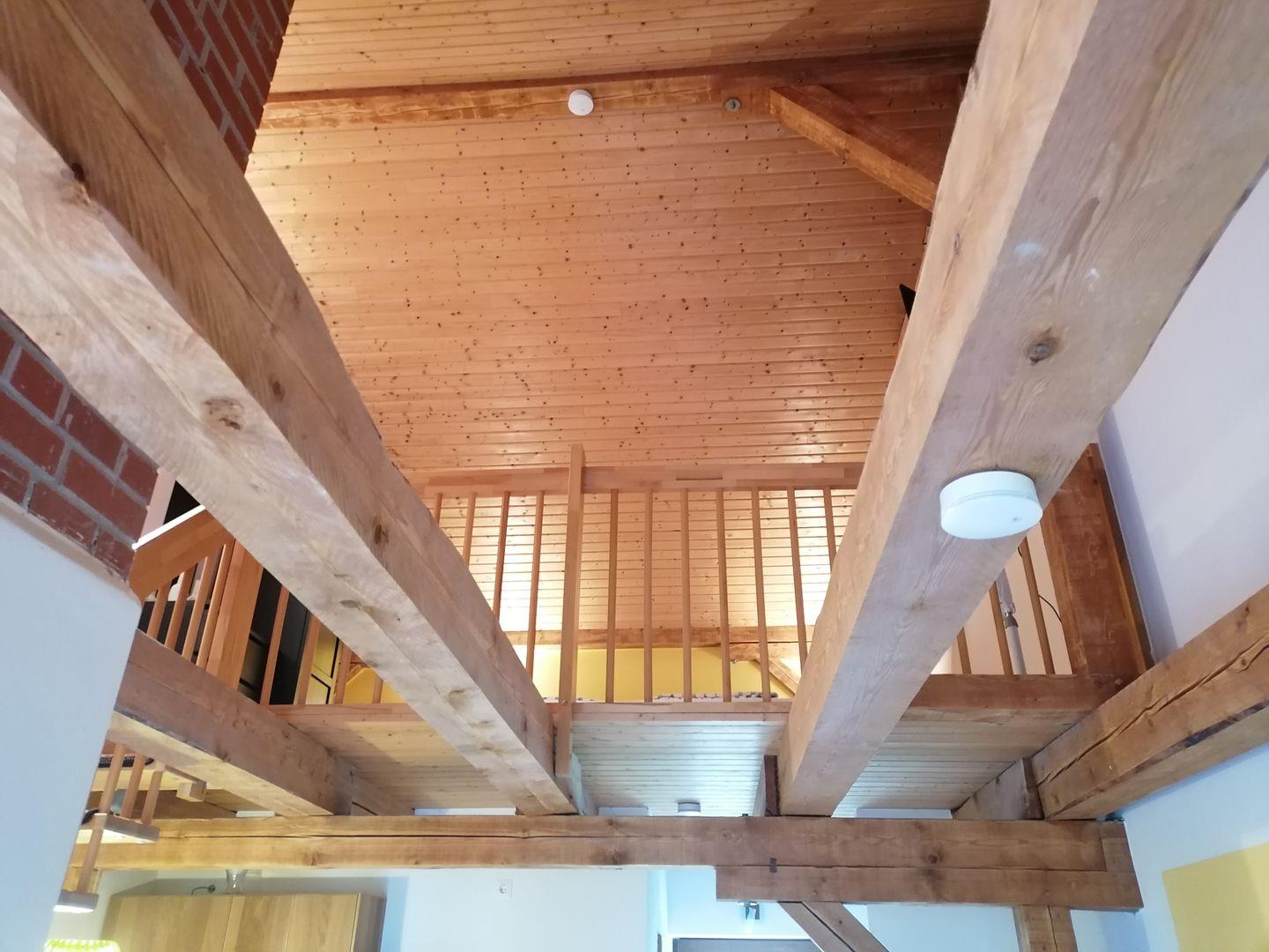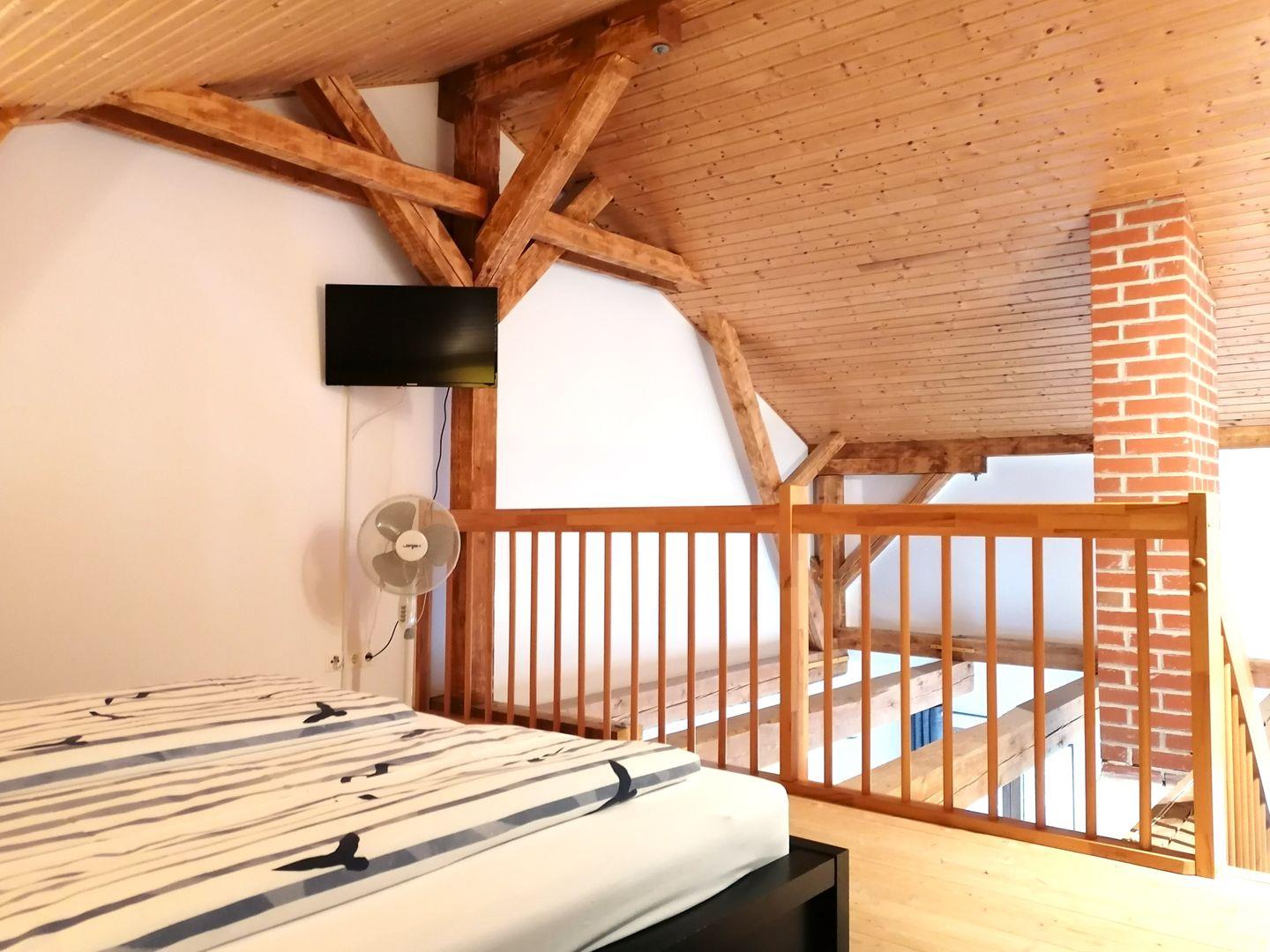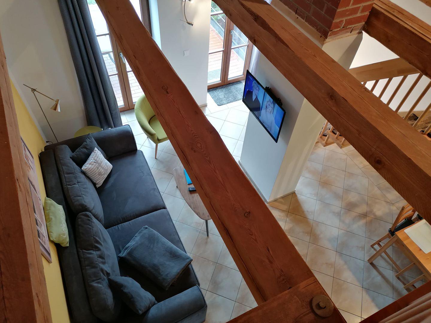 Im Erdgeschoss erwartet Sie der Wohn-Essbereich mit einer Couch und einem Flachbildfernseher, dazu eine vollausgestattete Küche und ein Bad mit Dusche. Über eine Holztreppe gelangen Sie nach oben in den gemütlichen Schlafbereich mit großem Bett (180x200), Kleiderschrank und einem 2. Fernseher.