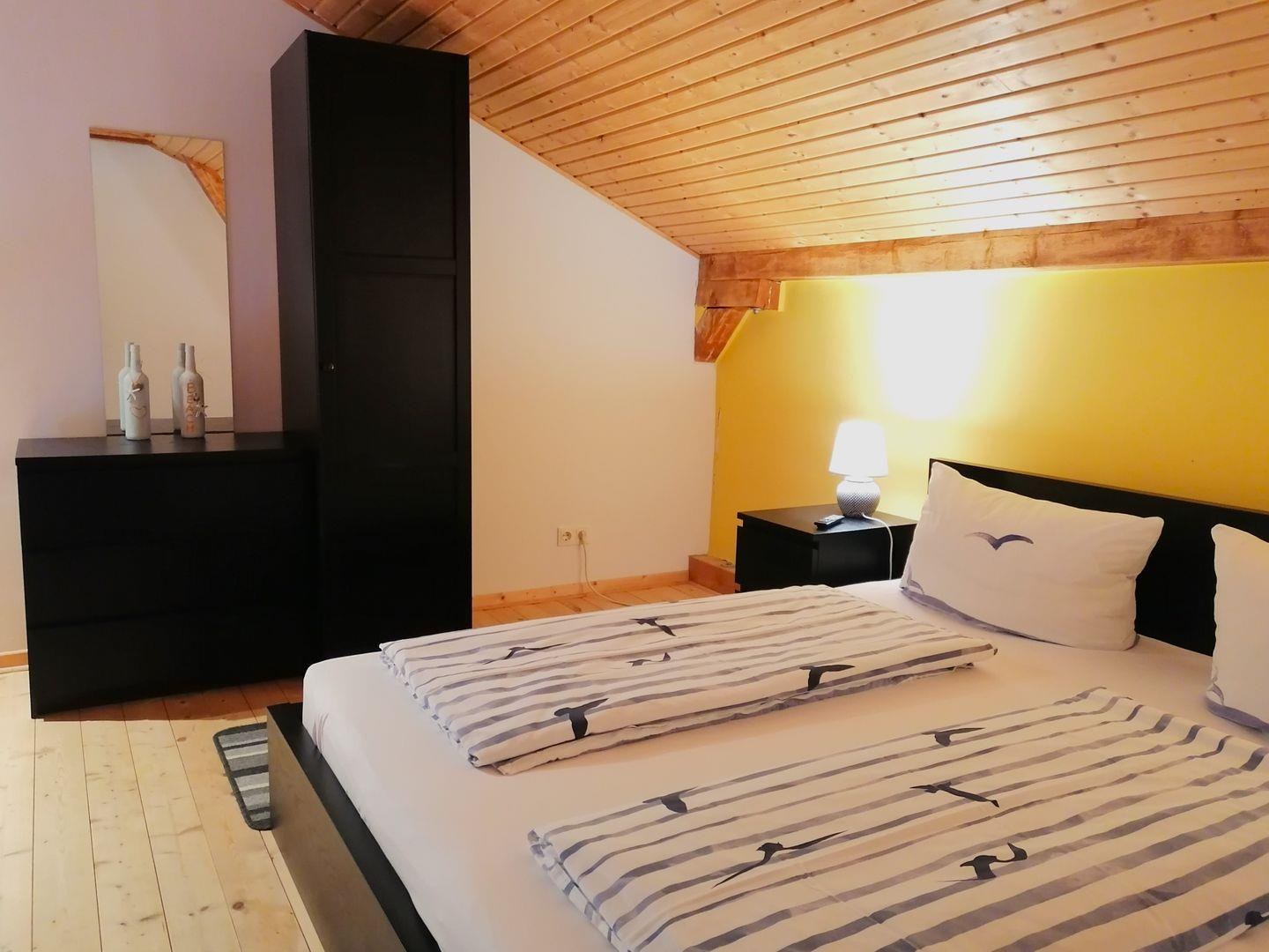 Über eine Holztreppe gelangen Sie nach oben in den gemütlichen Schlafbereich mit großem Bett (180x200), Schlafcouch (120x180), Kleiderschrank, Sideboard und Smart-TV.