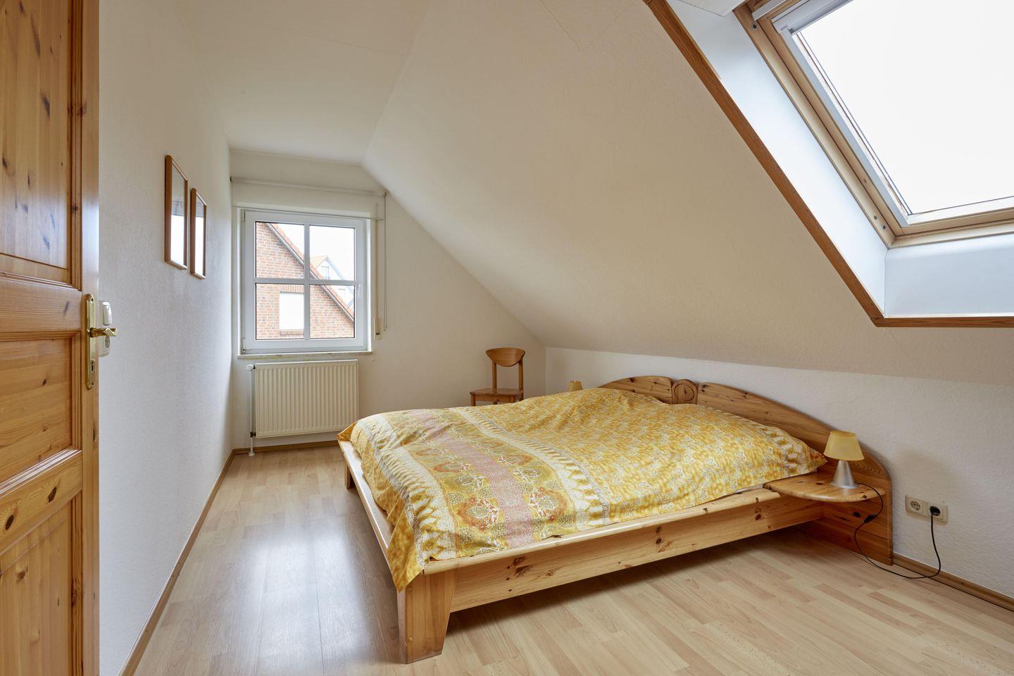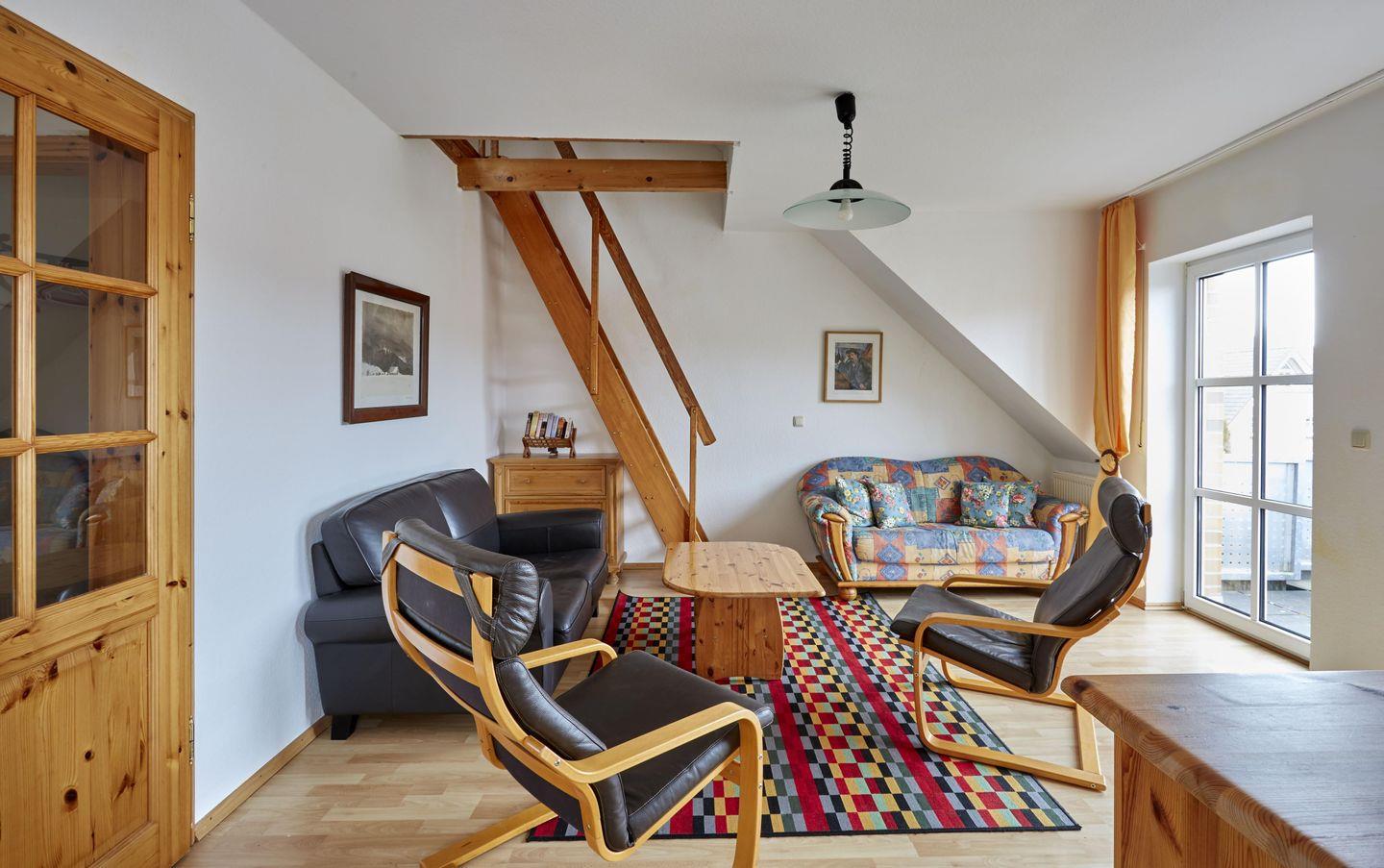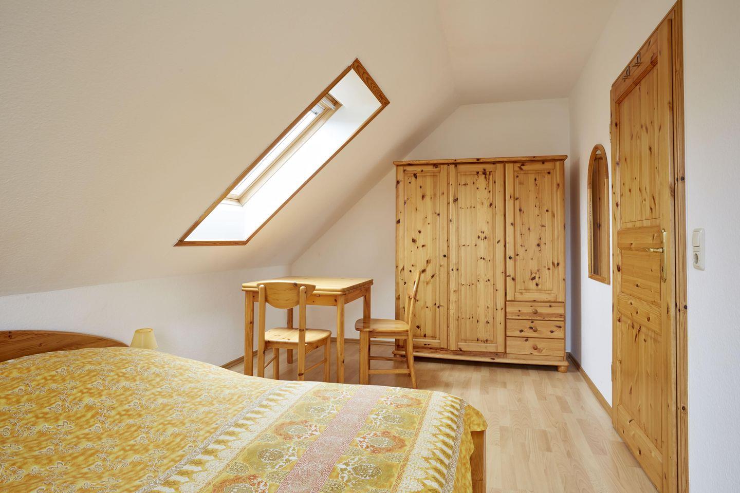 Die Ferienwohnung befindet sich im 1. Stock. Dort gibt es ein Schlafzimmer mit Doppelbett mit getrennten Matratzen, jeweils ca. 90×200 cm, ein geräumiges Bad, eine Küche mit Essecke, ein geräumiges Wohnzimmer mit Sitzecke und Zugang zum Balkon. Vom Wohnzimmer gelangt man über eine Treppe zu einem Kinderzimmer mit zwei getrennten Betten jeweils 90×200 cm im ausgebauten Spitzboden.