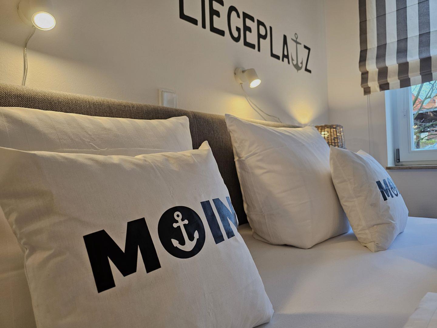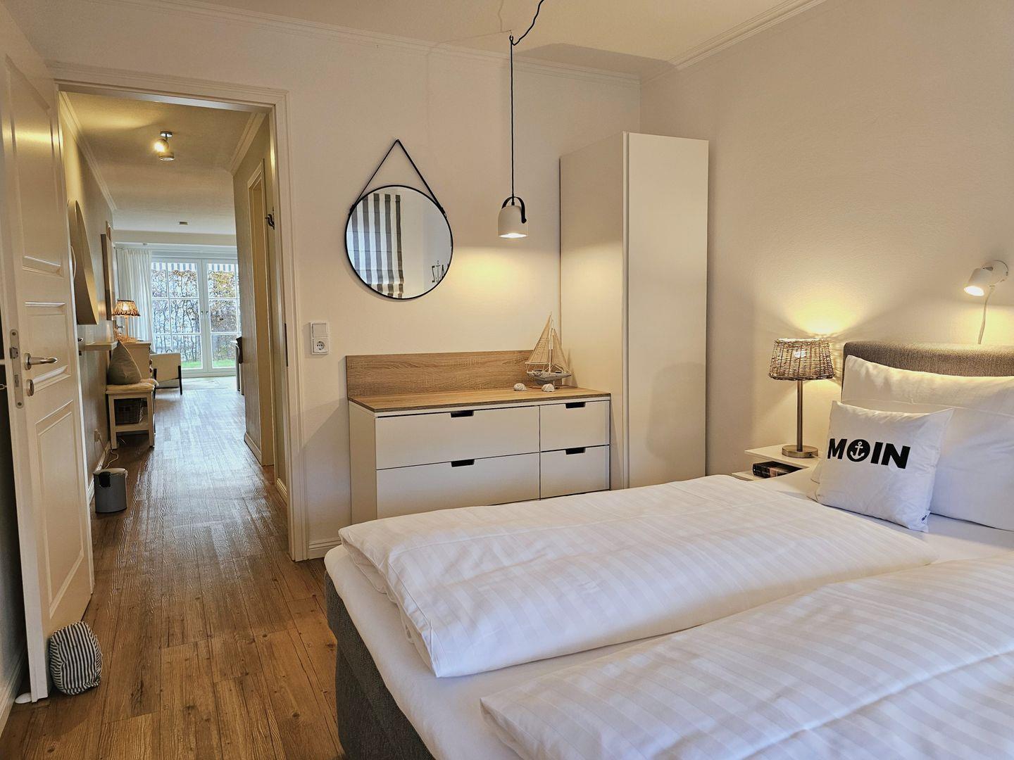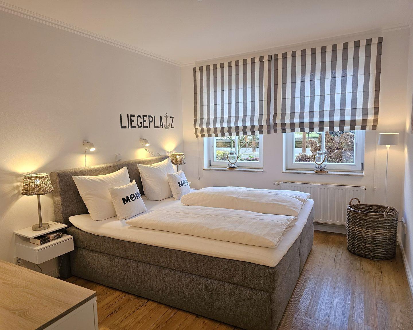 Das helle Schlafzimmer mit einem komfortablen Box-Springbett ist der Rückzugsort für erholsame Nächte. Hier finden Sie Ruhe und Geborgenheit, während der Alltag draußen bleibt. Die Bettwäsche und flauschige Handtücher können Sie gerne hinzubuchen.