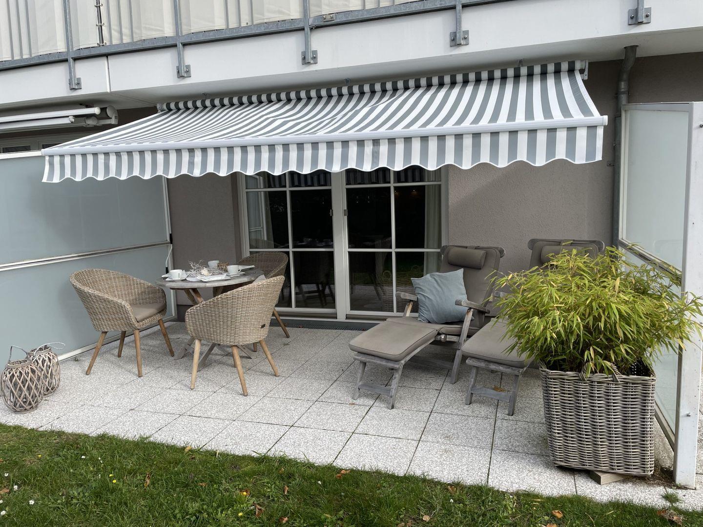 Vom modernen Wohn/Essbereich gelangen Sie direkt auf die große Süd/West-Terrasse mit Gartenmöbeln und Markise.