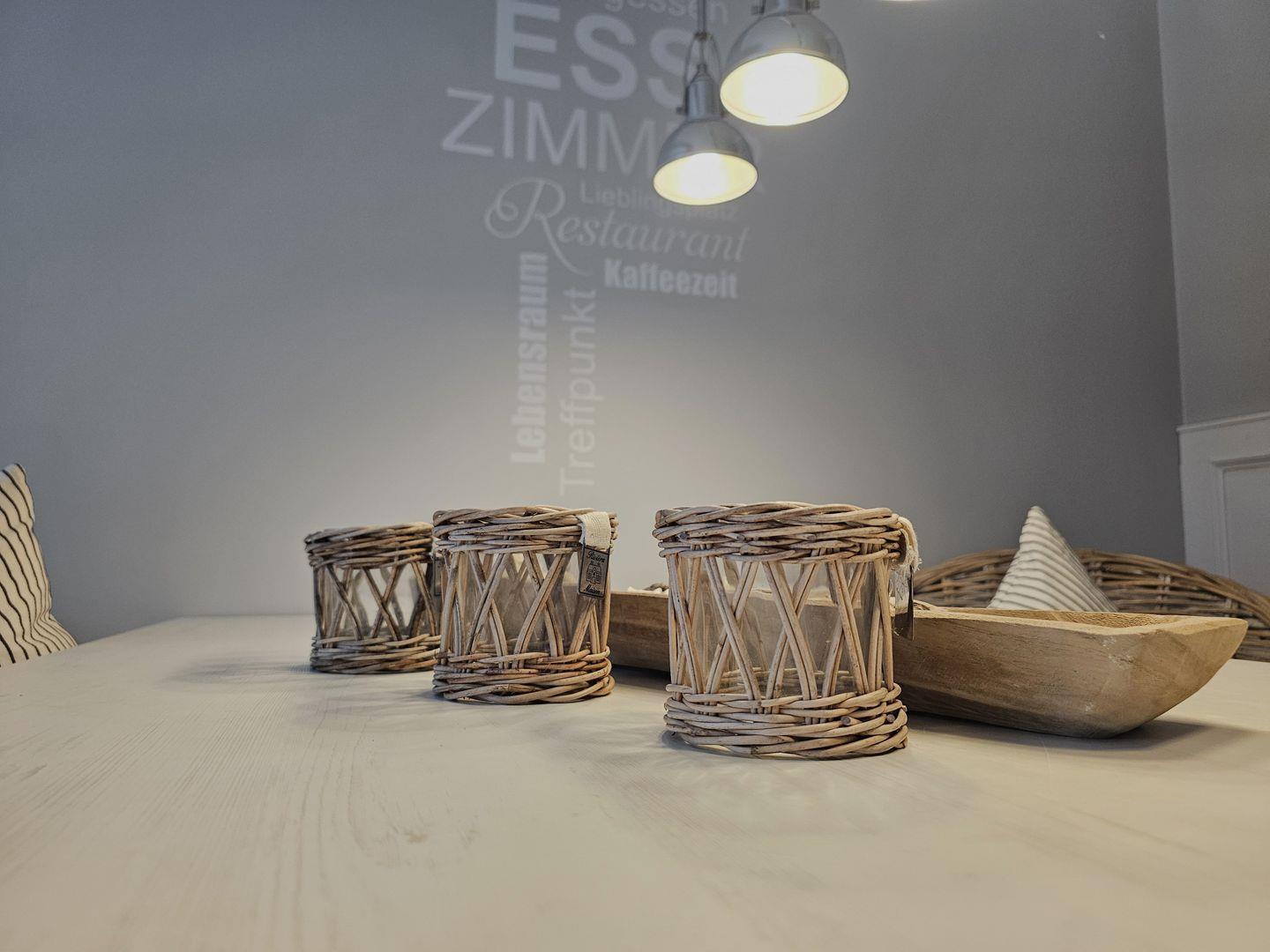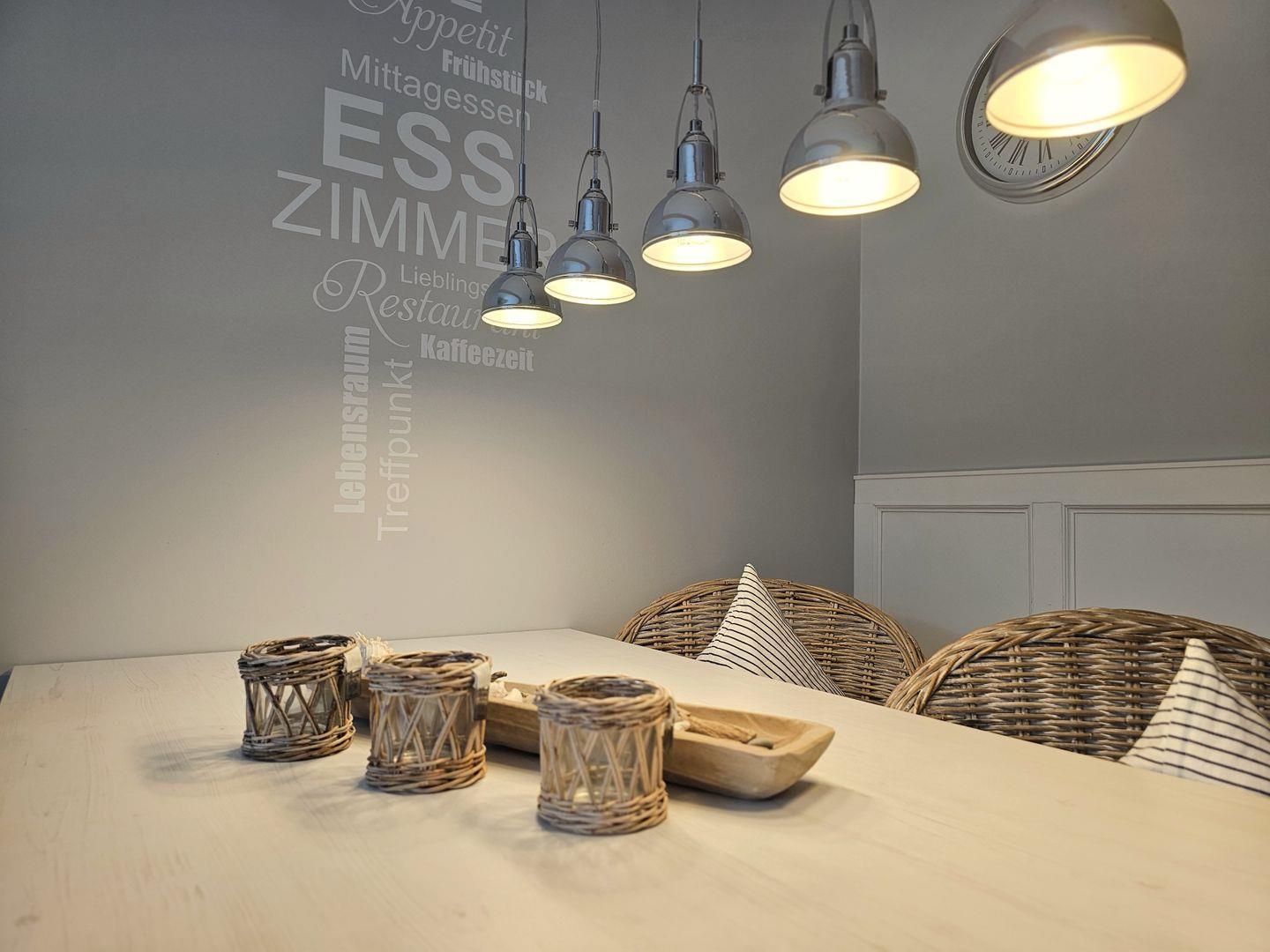 Der Esstisch bietet den perfekten Rahmen für romantische Abendessen, während die sorgfältig ausgewählten Details der Einrichtung ein Gefühl von Geborgenheit und Stil vermitteln.
