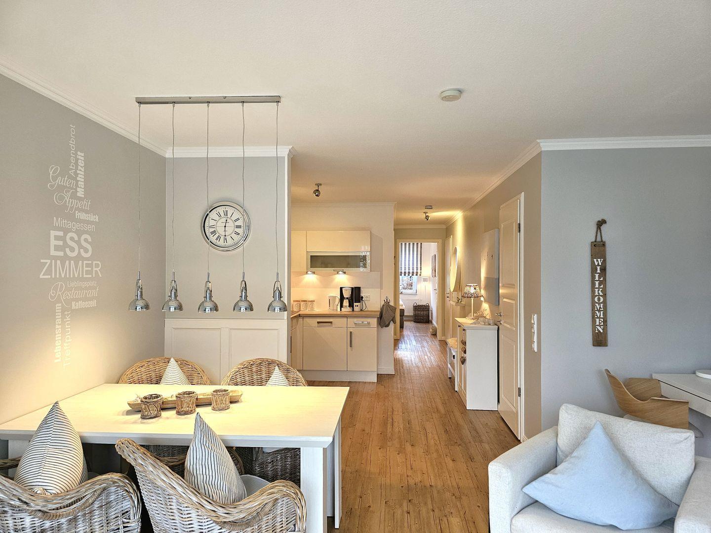 Der einladende Flur mit Garderobe und Spiegel heißt Sie herzlich willkommen und führt Sie in die liebevoll gestalteten Räume. Das einladende Wohn-/Esszimmer ist der perfekte Ort, um gemütliche Abende zu verbringen. Lassen Sie sich auf der bequemen, ausziehbaren Couch nieder, während Sie gemeinsam einen Film auf dem modernen Flachbild-TV genießen oder einfach nur bei einem Glas Wein die Seele baumeln lassen.