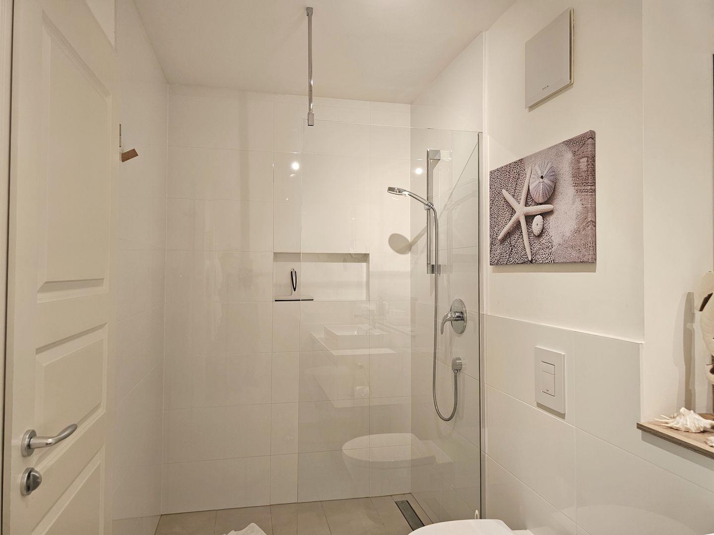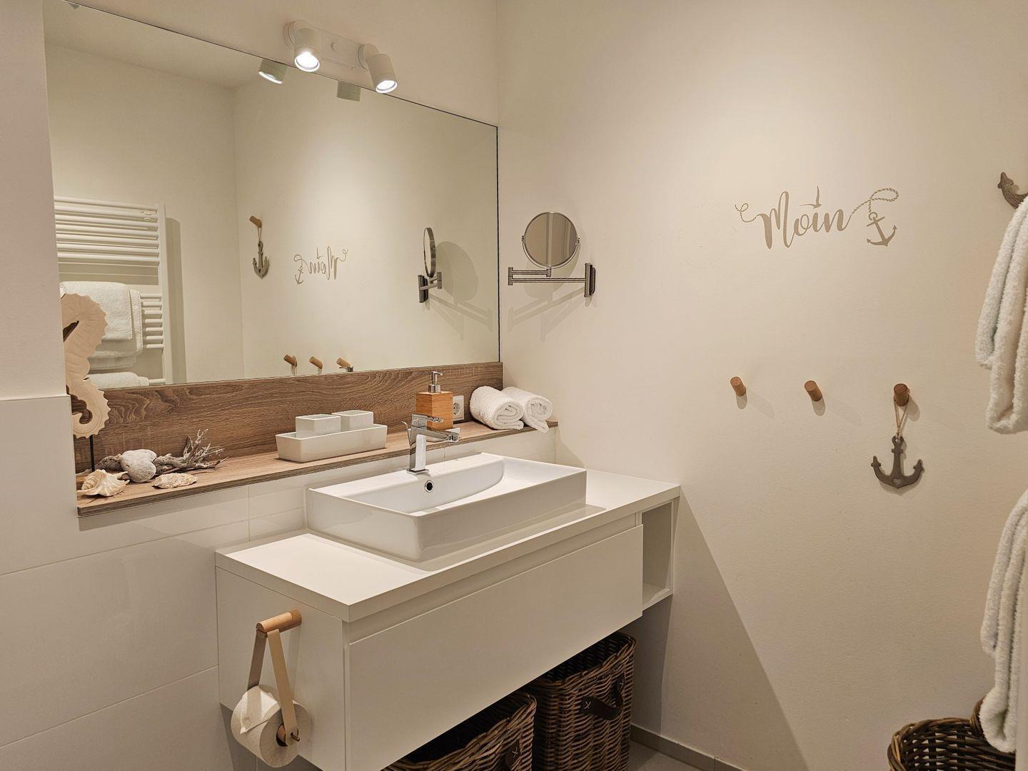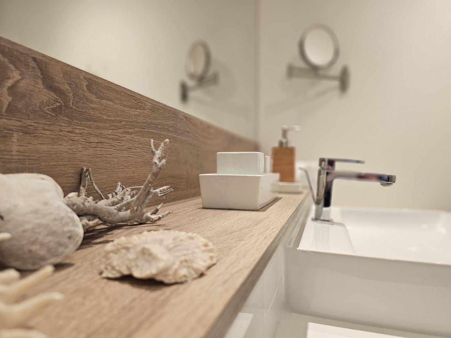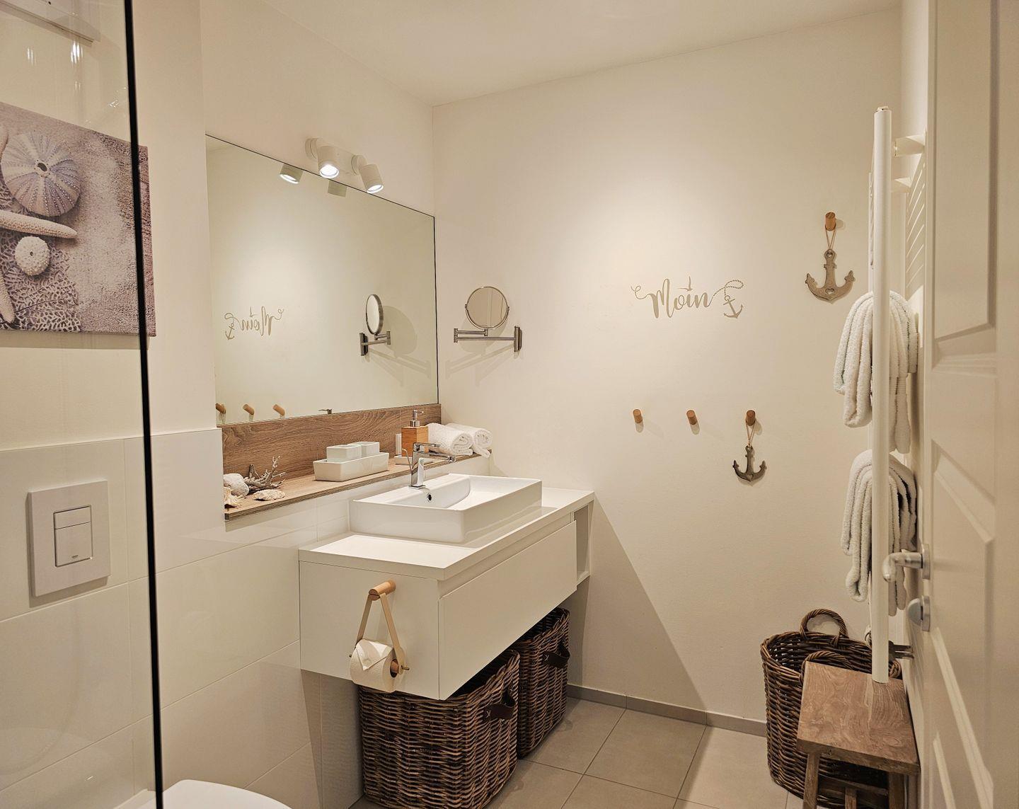 Das moderne Badezimmer mit einem bodengleichen Einstieg in die Dusche lädt zu erfrischenden Momenten nach einem Tag in der Sonne ein. Genießen Sie entspannende Duschen und den Luxus, sich einfach wohlzufühlen.