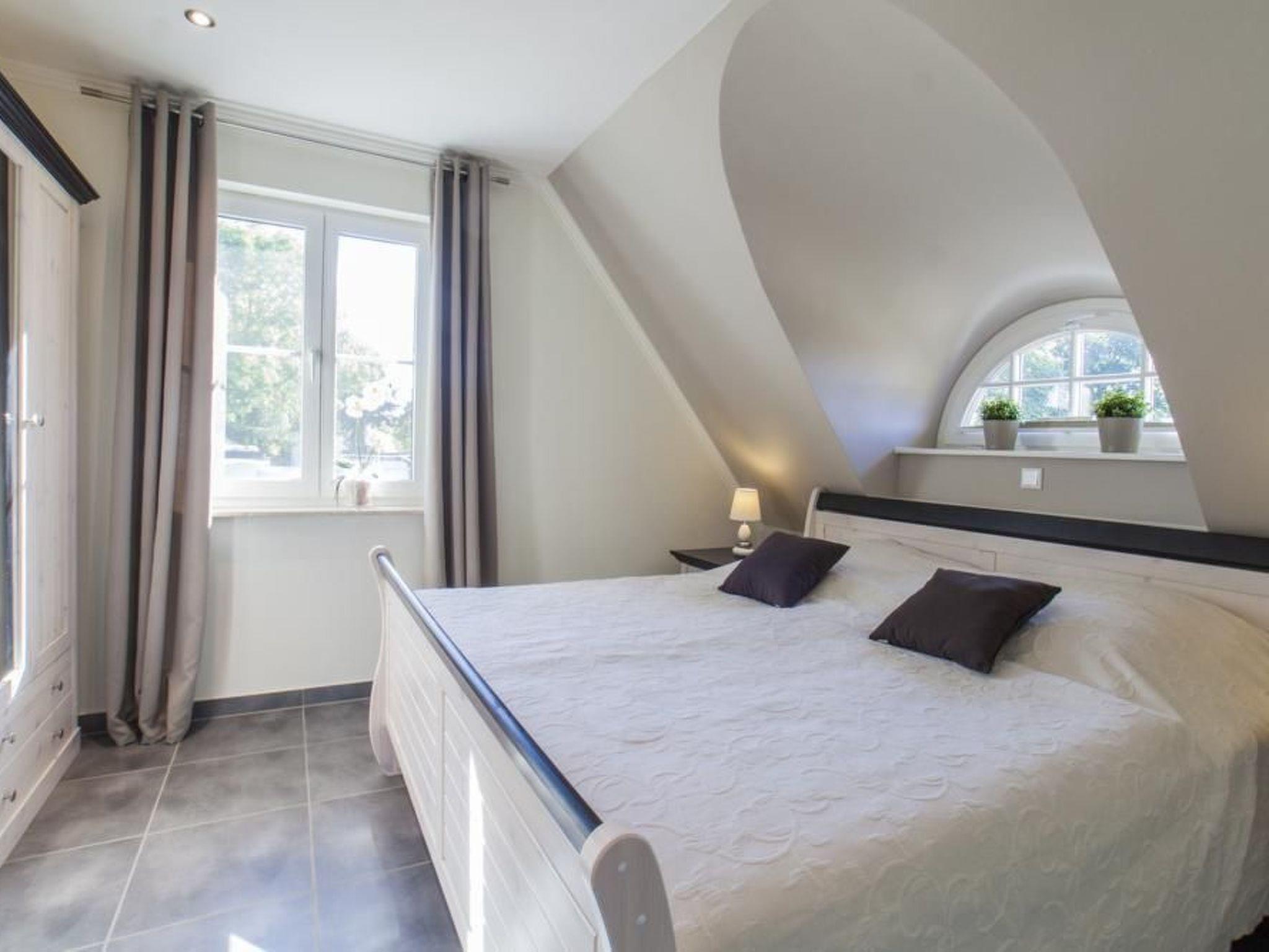 Das Obergeschoss bietet die Möglichkeit sich zurückzuziehen, um die Nachtruhe zu genießen oder evtl. auch mal einen schönen Mittagsschlaf zu halten. Alle Betten verfügen über verstellbare Lattenroste und haben Komforthöhe. Je Schlafzimmer stehen Ihnen Matratzen mit unterschiedlichem Härtegrad zur Verfügung. Testen Sie bei Ihrer Anreise, welcher Härtegrad Ihrem Wohlbefinden entspricht. Für Verdunkelung ist in jedem Schlafzimmer gesorgt. Außerdem finden Sie hier auch ein schönes Wellnessbad zum Relaxen mit Badewanne, bodengleicher Dusche mit Glaskabine, Toilette, Handwaschbecken und Fön. Damit Sie nicht unliebsamen Besuch bekommen, verfügt jeder Raum über ein Fliegengitter. Im ersten Schlafzimmer finden Sie ein Doppelbett, Nachtkonsolen und einen großen Kleiderschrank. Für Ihre Wertgegenstände steht ein Safe zur Verfügung. Das zweite Schlafzimmer ist ebenfalls mit einem Doppelbett, Nachtkonsolen und einem Kleiderschrank ausgestattet. Wer vor dem Einschlafen gerne noch etwas TV schaut, könnte dieses Schlafzimmer mit Sat.-TV wählen. Sollten Sie mit einem Kleinkind anreisen, stellen wir Ihnen ein zusätzliches Kinderreisebett zur Verfügung. Im dritten Schlafzimmer gibt es zwei Einzelbetten, Nachtkonsolen und ein Sideboard sowie einen Sat.-TV. Der ausgebaute Spitzboden ist das ideale Domizil für Ihre Kinder. Dort befindet sich ein weiteres Schlafzimmer, in dem die Kleinen in Kojenbetten nächtigen können. Mit Leselampen kann man hier so richtig gut vor dem Einschlafen schmökern. Weiterhin bietet der Spitzboden eine Spiel-/Kuschelecke mit Sitzkissen und einem Sat.-TV. Auch hier sind die Fenster durch Fliegengitter geschützt.