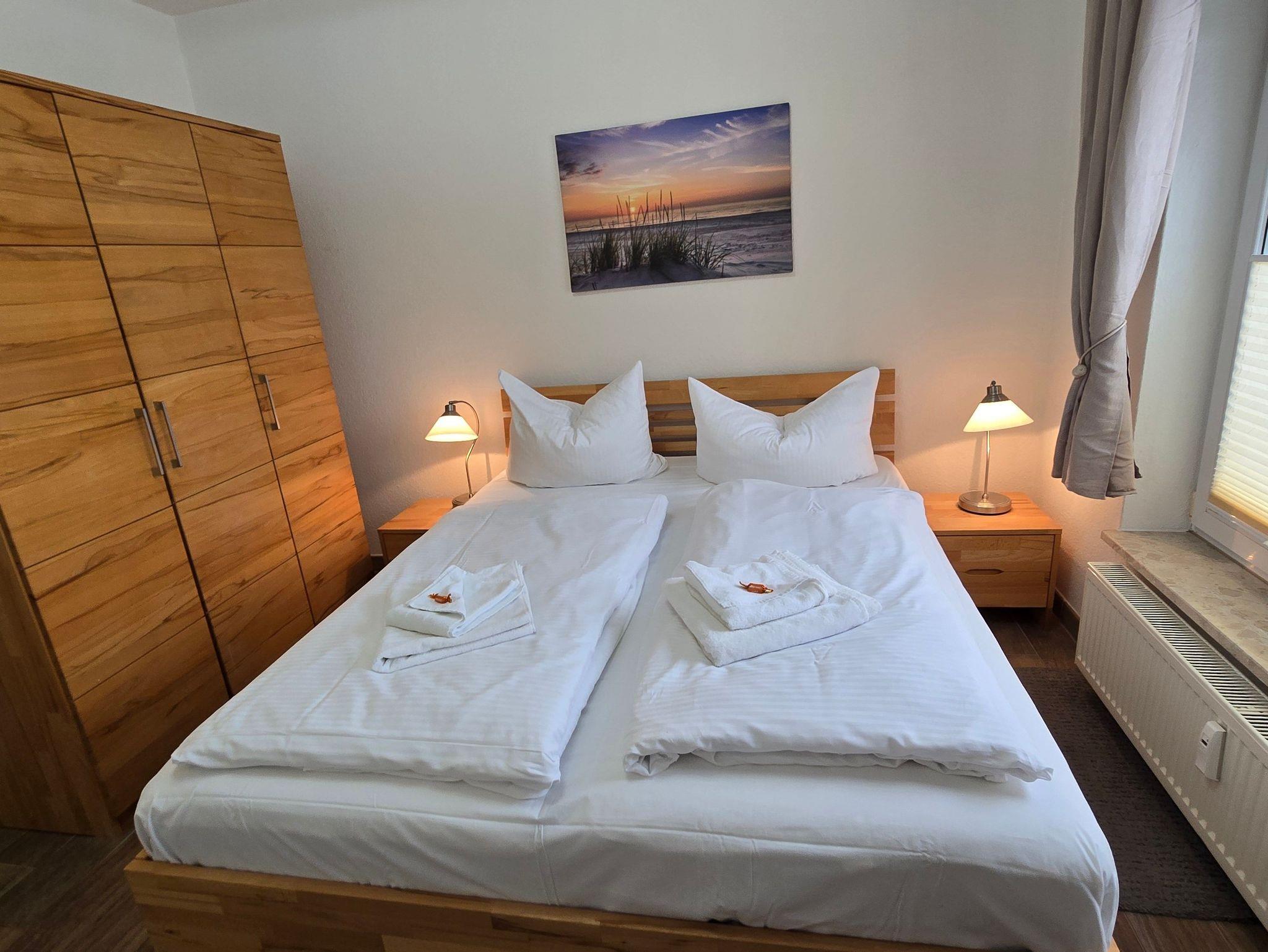 Das Schlafzimmer bietet ein Doppelbett mit den Maßen von 1,60 x 2,00 m.